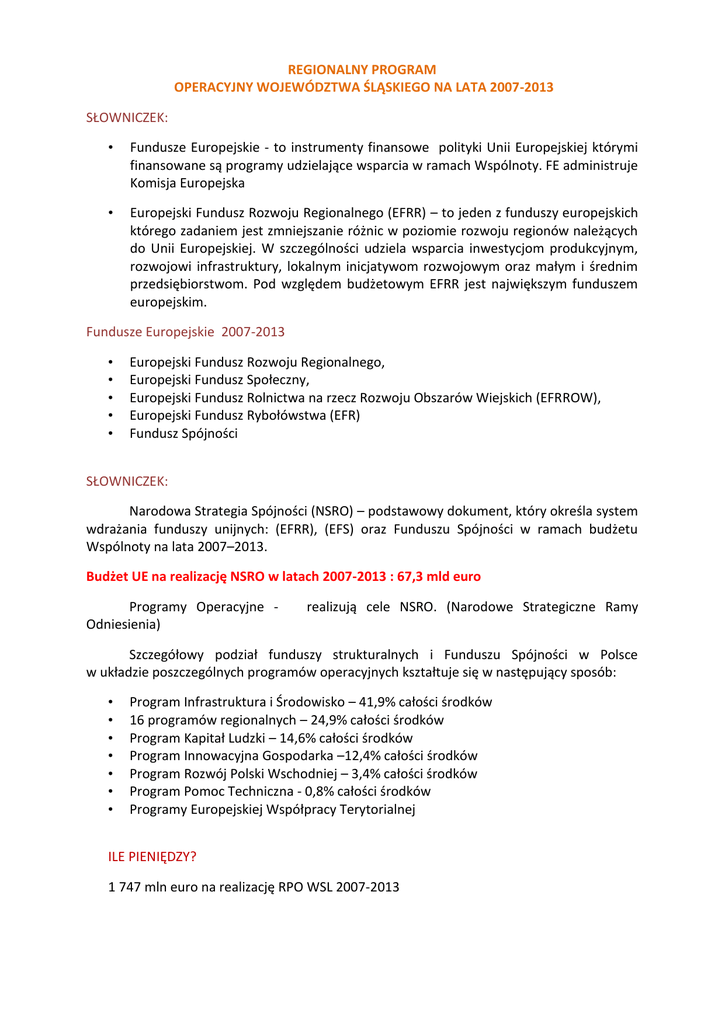 REGIONALNY PROGRAM OPERACYJNY WOJEWÓDZTWA ŚLĄSKIEGO NA LATA 2007-2013 SŁOWNICZEK: • Fundusze Europejskie - to instrumenty finansowe polityki Unii Europejskiej którymi finansowane są programy udzielające wsparcia w ramach Wspólnoty. FE administruje Komisja Europejska • Europejski Fundusz Rozwoju Regionalnego (EFRR) – to jeden z funduszy europejskich którego zadaniem jest zmniejszanie różnic w poziomie rozwoju regionów należących do Unii Europejskiej. W szczególności udziela wsparcia inwestycjom produkcyjnym, rozwojowi infrastruktury, lokalnym inicjatywom rozwojowym oraz małym i średnim przedsiębiorstwom. Pod względem budżetowym EFRR jest największym funduszem europejskim. Fundusze Europejskie 2007-2013 • • • • • Europejski Fundusz Rozwoju Regionalnego, Europejski Fundusz Społeczny, Europejski Fundusz Rolnictwa na rzecz Rozwoju Obszarów Wiejskich (EFRROW), Europejski Fundusz Rybołówstwa (EFR) Fundusz Spójności SŁOWNICZEK: Narodowa Strategia Spójności (NSRO) – podstawowy dokument, który określa system wdrażania funduszy unijnych: (EFRR), (EFS) oraz Funduszu Spójności w ramach budżetu Wspólnoty na lata 2007–2013. Budżet UE na realizację NSRO w latach 2007-2013 : 67,3 mld euro Programy Operacyjne Odniesienia) realizują cele NSRO. (Narodowe Strategiczne Ramy Szczegółowy podział funduszy strukturalnych i Funduszu Spójności w Polsce w układzie poszczególnych programów operacyjnych kształtuje się w następujący sposób: • • • • • • • Program Infrastruktura i Środowisko – 41,9% całości środków 16 programów regionalnych – 24,9% całości środków Program Kapitał Ludzki – 14,6% całości środków Program Innowacyjna Gospodarka –12,4% całości środków Program Rozwój Polski Wschodniej – 3,4% całości środków Program Pomoc Techniczna - 0,8% całości środków Programy Europejskiej Współpracy Terytorialnej ILE PIENIĘDZY? 1 747 mln euro na realizację RPO WSL 2007-2013 RPO WSL - CO TO JEST: • • • • • dokument, który określa kto, na jakich zasadach oraz w jakim celu może skorzystać z dostępnej w województwie dotacji unijnej w latach 2007-2013. powstał w oparciu o Strategię Rozwoju Województwa Śląskiego na lata 2000-2020, która jest swoistym przewodnikiem rozwoju województwa we wszystkich obszarach. zakłada równomierny rozwój wszystkich obszarów województwa. zbudowany jest w oparciu o 10 priorytetów czyli głównych obszarów wsparcia . finansowany jest środkami UE pochodzącymi z Europejskiego Funduszu Rozwoju Regionalnego (zasada jednofunduszowości). KTO WDRAŻA? • Instytucja Zarządzająca = Zarząd Województwa właściwy organ administracji publicznej, odpowiedzialny za przygotowanie i nadzorowanie realizacji programu operacyjnego. • Wydział Rozwoju Regionalnego wykonuje obowiązki Instytucji Zarządzającej • Śląskie Centrum Przedsiębiorczości wykonuje obowiązki Instytucji Pośredniczącej II stopnia Główny cel: - stymulowanie dynamicznego rozwoju przy wzmocnieniu spójności społecznej, gospodarczej i przestrzennej regionu. Priorytet I Badania i rozwój technologiczny (B+R), innowacje i przedsiębiorczość Głównym celem jest wzrost konkurencyjności regionalnej gospodarki opartej na wiedzy. Cele szczegółowe priorytetu: • wzrost wartości bezpośrednich inwestycji w regionie • wzrost konkurencyjności przedsiębiorstw • wzmocnienie potencjału sektora B+R i struktur sieciowych na rzecz innowacji. Priorytet II Społeczeństwo informacyjne Głównym celem jest stworzenie warunków do rozwoju społeczeństwa informacyjnego w regionie. Cele szczegółowe • zapewnienie powszechnego, szerokopasmowego i bezpiecznego dostępu do Internetu • wzrost liczby usług publicznych świadczonych drogą elektroniczną. Priorytet III Turystyka Głównym celem jest wzrost konkurencyjności turystycznej regionu. Cele szczegółowe: • poprawa jakości infrastruktury turystycznej regionu • tworzenie i rozwój regionalnych produktów turystycznych • zwiększenie dostępu do informacji turystycznej • wzrost rozpoznawalności regionalnej oferty turystycznej. Priorytet IV Kultura Głównym celem jest wzrost znaczenia kultury jako czynnika rozwoju społeczno – gospodarczego. Cele szczegółowe: • zachowanie dla przyszłych pokoleń dziedzictwa kulturowego • zwiększenie dostępu do informacji o zasobach i wydarzeniach kulturalnych w regionie • wzrost rozpoznawalności oferty kulturalnej regionu. Priorytet V Środowisko Głównym celem jest ochrona oraz poprawa jakości środowiska. Cele szczegółowe: • poprawa jakości wód powierzchniowych i podziemnych • ograniczenie ilości odpadów deponowanych i zdeponowanych w środowisku • poprawa jakości powietrza • doskonalenie systemu zarządzania środowiskiem • ochrona dziedzictwa przyrodniczego i kształtowanie postaw ekologicznych społeczeństwa. Priorytet VI Zrównoważony rozwój miast Głównym celem jest wzrost konkurencyjności przestrzeni miejskiej województwa. Cele szczegółowe: • wzrost konkurencyjności ośrodków metropolitalnych • wielofunkcyjne wykorzystanie obszarów zdegradowanych. Priorytet VII Transport Głównym celem jest ukształtowanie efektywnego i zintegrowanego transportowego. Cele szczegółowe: • udrożnienie sieci drogowej województwa • zwiększenie udziału transportu publicznego w przemieszczaniu osób. systemu Priorytet VIII Infrastruktura edukacyjna Głównym celem jest stworzenie warunków do rozwoju społeczeństwa o wysokich kwalifikacjach zawodowych, poszukiwanych na rynku pracy. Cele szczegółowe: • wzrost dostępności i poprawa warunków kształcenia na poziomie wyższym • wzrost dostępności i poprawa warunków kształcenia na poziomie przedszkolnym podstawowym, gimnazjalnym i ponadgimnazjalnym • wzrost dostępności i poprawa warunków kształcenia ustawicznego. Priorytet IX Zdrowie i rekreacja Głównym celem jest popraw