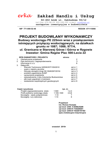 erka Zakład Handlu i Usług 92-402 Łódź ul. Zakładowa 55/12 tel/fax 670-98-29 695-189-322 e-mail [email protected] zastępstwo inwestycyjne w budownictwie NIP 771-000-52-46 REGON 471115066 PROJEKT BUDOWLANY WYKONAWCZY Budowy wodociągu PE 225mm wraz z przełączeniem istniejących przyłączy wodociągowych, na działkach gruntu nr 1087; 1088; 977/4, ul. Graniczna w Starowej Górze i Górna w Rzgowie Inwestor: Gmina Rzgów Plac 500-Lecia 22 SPIS ZAWARTOŚCI PROJEKTU strona: Oświadczenie projektanta Opis techniczny i zagospodarowania informacja b.i.o.z 3. Załączniki: - Warunki Techniczne GZWiK/WT/105/2010 - wypis z rejestru gruntów - Decyzja zarządcy drogi GK 5548/267/2010r - protokół uzgodnienia ZUDP - uprawnienia projektanta - zaświadczenie z Izby Inżynierów Budownictwa - plik kopii uzgodnień z branżami - zestawienie współrzędnych geodezyjnych 1. 2. Część rysunkowa Projekt zagospodarowania skala Profil podłużny wodociągu skala Szczegóły - węzły połączeniowe Szczegóły- rury osłonowe 2 3 8 zał nr 1 zał nr 2 zał nr 3 zał nr 4 zał nr 5 zał nr 6 zał nr 7 zał nr 8 rys. nr. 1:500 1,2,3 1:100 / 500 4,5,6 1:10 7 1:10 8 Projektant inż. Roman Kostyła upr.bud. UAN. V.8388(35)88 upr.bud. UAN.IV.7342(68)91 upr.bud. UAN.IV-10220/167/82 spec.instalacyjno-inżynieryjna wrzesień 2010r 1 OŚWIADCZENIE PROJEKTANTA /art. 20 ust 4 Prawo budowlane/ Oświadczam że projekt przebudowy wodociągu PE 225mm i przełączenia przyłączy wodociągowych w Starowej Górze i Rzgowie gmina Rzgów, zlokalizowanego na działkach gruntu nr 1087; 1088; 977/4; obręb Starowa Góra i Rzgów został sporządzony zgodnie z obowiązującymi przepisami prawa budowlanego oraz zasadami wiedzy technicznej. Projektant: inż. Roman Kostyła 2 OPIS TECHNICZNY 1.PODSTAWA OPRACOWANIA Projekt opracowano zgodnie z umową nr 2/03//2010 z Gminą Rzgów pac 500-Lecia 22. 2. MATERIAŁY WYJŚCIOWE DO PROJEKTOWANIA W opracowanie wykorzystano następujące materiały: Warunki techniczne przebudowy wodociągu nr GZWiK/WT/105/2010 Mapę sytuacyjno – wysokościową terenu projektowanej inwestycji w skali 1:500 Skrócony wypis z rejestru gruntów na dz nr 1087 1088 977/4 Decyzja zarządcy drogi GK 5548/267/2010r z dn 14.10.2010r Badania geologiczne gruntu wzdłuż trasy wodociągu Wizję lokalną w terenie i uzgodnienia z zainteresowanymi właścicielami posesji i działek. Obowiązujące przepisy, normy i wytyczne techniczne w zakresie projektowania wodociągów, obowiązujące metody obliczeń zapotrzebowania wody na cele pitne i przeciwpożarowe.. 3. OPIS STANU ISTNIEJĄCEGO Na pograniczu mjsc..Starowa Góra i Rzgów istnieją wodociągi z rur żeliwnych dn=200mm, wraz z przyłączami wodociągowymi stalowymi. Przedmiotem projektu jest wybudowanie ok. 2,5 km odcinka sieci wodociągowej z rur PE SDR 17 PN 10 d=225mm spinającej, na trasie ul. Granicznej i Górnej istniejące końcówki sieci. Inwestycja przebiegać będzie wyłącznie w granicach pasa dróg gminnych. 4. OGÓLNA CHARAKTERYSTYKA TERENU INWESTYCJI Teren na którym znajduje się istniejący i projektowany wodociąg jest terenem o równomiernym spadku w kierunku północno-zachodnim i deniwelacji ok. 15 m. Wodociąg zaprojektowano w nieutwardzonym poboczu ulic : Górna w Rzgowie i Graniczna w Starowej Górze. Na odcinku od stacji wodociągowej przy ul. Górnej w Rzgowie, o długości ok. 700 m.b. projektowany wodociąg przebiegać będzie częściowo w asfaltowej nawierzchni drogi lub na skraju tej nawierzchni. Podłączenie projektowanego wodociągu do istniejącej sieci wodociągowej nastąpi w węzłach nr 1 nr 76 i nr 76 wg oznaczeń na projekcie zagospodarowania. 5. ZAPOTRZEBOWANIE WODY Projektowany wodociąg ma za zadanie połączyć systemy wodociągowe w Starowej Górze i Rzgowie w celu usprawnienia pokrycia istniejącego i perspektywicznego zapotrzebowania wody na cele gospodarczo bytowe i przeciwpożarowe. 6. SIEĆ WODOCIĄGOWA 6.1 OBLICZENIA HYDRAULICZNE SIECI WODOCIĄGOWEJ Sieć wodociągową rozdzielczą zaprojektowano z rur PE typ 100 SDR 17,6 Dz = 225 mm, przeznaczonych do wody pitnej, na ciśnienie 1,0 MPa. Rury i kształtki polietylenowe łączone będą metodami zgrzewania czołowego i elektrooporowego. Obliczenia hydrauliczne sieci wodociągowej przeprowadzono dla przypadku najbardziej niekorzystnego – to jest, przy założeniu jednostronnego przepływu wody w projektowanym wodociągu – dla najdalszego hydrantu przeciwpożarowego i najdalej położonego budynku. Dane: Ciśnienie dyspozycyjne w sieci, w punkcie 1, na poziomie terenu, wynosi Hd = 40 m H2O Wymagana minimalna wysokość ciśnienia w wodociągu, dla rozbiorów bytowo-gospodarczych , dla budynków piętrowych - 18m H2O. Obliczona strata ciśnienia w instalacji wewnętrznej dHw = 3,1 m H2O. 3 Wymagana minimalna wysokość ciśnienia w wodociągu, na główce hydrantu - 20 mH2O długość odcinka od pkt 76 do pkt HP1 L= 2571 m geometryczna różnica wysokości : -od główki hydrantu HP1 do terenu w pkt HP1 dH1 = 193,40 + 1,0 – 189,36 = 5,04 m -od poziomu terenu w pkt HP1 do poziomu terenu w pkt 76 dH2 = 231,33 – 219,05 = 4,49 m Przyjęto straty miejscowe 10% strat liniowych Strata ciśnienia liniowego całkowita, obliczona za pomocą programu „Wavin -dobór rurociągów”, na odcinku pkt HP1 – pkt 76, dla przepływu 30 dm3/s wynosi: Nazwa odcinka HP1 - 76 Przepływ [dm3/s] Długość [m] Średnica [mm] Prędkość [m/s] Strata jedn [‰] Strata całk [m SW] 30 2571 225 0,97 4,42 11,37 Nr Katal. Chrop. [mm] 3052274030 0,05 Strata ciśnienia całkowita, Hc wynosi: 11,37 x 1,1 = 12, 51 m H 2O stąd, obliczone ciśnienie wylotowe na główce hydrantu - (p wyl.) wynosi: P wyl. = Hdysp – dH1 – Hc = 40 – 5,04 – 12,51 = 22,45 mH2O i jest wystarczające obliczone ciśnienie na wylewce przyboru sanitarnego wynosi P wyl. = Hd – dH2 – Hc = 40 – 4,49 – 12,51 - 3,1 = 19,90 mH2O i jest wystarczające. Projektowana sieć wodociągowa spełnia stawi