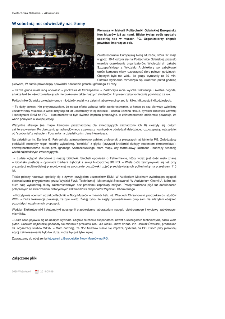 Politechnika Gdańska » Aktualności W sobotnią noc odwiedziły nas tłumy Pierwsza w historii Politechniki Gdańskiej Europejska Noc Muzeów już za nami. Blisko tysiąc osób spędziło sobotnią noc w murach PG. Organizatorzy chętnie powtórzą imprezę za rok. Zainteresowanie Europejską Nocą Muzeów, która 17 maja w godz. 191 odbyła się na Politechnice Gdańskiej, przeszło wszelkie oczekiwania organizatorów. Wycieczki dr. Jakuba Szczepańskiego z Wydziału Architektury po zabytkowej części kampusu miały rozpoczynać się o pełnych godzinach. Chętnych było tak wielu, że grupy wyruszały co 30 min. Ostatnia wycieczka rozpoczęła się kwadrans przed godziną pierwszą. W sumie prowadzący opowiadał o fasadzie gmachu głównego 11 razy. – Każda grupa miała inną opowieść – podkreśla dr Szczepański. – Zaskoczyła mnie wysoka frekwencja i świetna pogoda, a także fakt że wśród zwiedzających nie brakowało także naszych studentów. Imprezę trzeba koniecznie powtórzyć za rok. Politechnikę Gdańską zwiedzały grupy młodzieży, rodziny z dziećmi, absolwenci sprzed lat kilku, kilkunastu i kilkudziesięciu. – To duży sukces. Nie przypuszczałam, że nasza oferta wzbudzi takie zainteresowanie, w końcu po raz pierwszy wzięliśmy udział w Nocy Muzeów, a wiele instytucji od lat uczestniczy w tej imprezie – ocenia Bożena Hakuć, dyrektor Biblioteki Głównej i koordynator ENM na PG. – Noc muzeów to była świetna impreza promocyjna. A zainteresowanie odbiorców powoduje, że warto pomyśleć o kolejnej edycji. Wszystkie atrakcje (na mapie kampusu przeznaczonej dla zwiedzających zaznaczono ich 8) cieszyły się dużym zainteresowaniem. Po obejrzeniu gmachu głównego z zewnątrz nocni goście odwiedzali dziedzińce, rozpoczynając najczęściej od "spotkania" z wahadłem Foucaulta na dziedzińcu im. Jana Heweliusza. Na dziedzińcu im. Daniela G. Fahrenheita zainscenizowano gabinet profesorski z pierwszych lat istnienia PG. Zwiedzający podziwiali secesyjny regał, katedrę wykładową, "świniaka" z giętką (przyrząd kreślarski służący studentom okrętownictwa), dziewiętnastowieczne biurko prof. Ignacego Adamczewskiego, stare mapy, czy marmurowy kałamarz budzący sensację wśród najmłodszych zwiedzających. – Ludzie oglądali starodruki z naszej biblioteki. Słuchali opowieści o Fahrenheicie, który wciąż jest dość mało znaną w Gdańsku postacią – opowiada Barbara Ząbczyk z sekcji historycznej BG PG. – Wiele osób zatrzymywało się też przy prezentacji multimedialnej przygotowanej na podstawie pocztówek i zdjęć przedstawiających politechnikę na przestrzeni 110 lat. Także pokazy naukowe spotkały się z żywym przyjęciem uczestników ENM. W Auditorium Maximum zwiedzający oglądali doświadczenia przygotowane przez Wydział Fizyki Technicznej i Matematyki Stosowanej. W Audytorium Chemii A, które jest dużą salą wykładową, tłumy zainteresowanych bez problemu zapełniały miejsca. Przeprowadzono pięć tur doświadczeń połączonych ze zwiedzaniem historycznych zakamarków i eksponatów Wydziału Chemicznego. – Pozytywnie oceniam udział politechniki w Nocy Muzeów – mówi dr hab. inż. Wojciech Chrzanowski, prodziekan ds. studiów WCh. – Duża frekwencja pokazuje, że było warto. Żałuję tylko, że zajęty oprowadzaniem grup sam nie zdążyłem obejrzeć pozostałych uczelnianych propozycji. Wydział Elektrotechniki i Automatyki udostępnił przedwojenne laboratorium napędu elektrycznego i wystawę zabytkowych mierników. – Dużo osób pojawiło się na naszym wydziale. Chętnie słuchali o eksponatach, nawet o szczegółach technicznych, padło wiele pytań. Gościom najbardziej podobały się mierniki z przełomu XIX i XX wieku mówi dr hab. inż. Dariusz Świsulski, prodziekan ds. organizacji studiów WEiA. – Mam nadzieję, że Noc Muzeów stanie się imprezą cykliczną na PG. Skoro przy pierwszej edycji zainteresowanie było tak duże, może być już tylko lepiej. Zapraszamy do obejrzenia fotogalerii z Europejskiej Nocy Muzeów na PG. Załączone pliki 2628 Wyświetleń 20140519