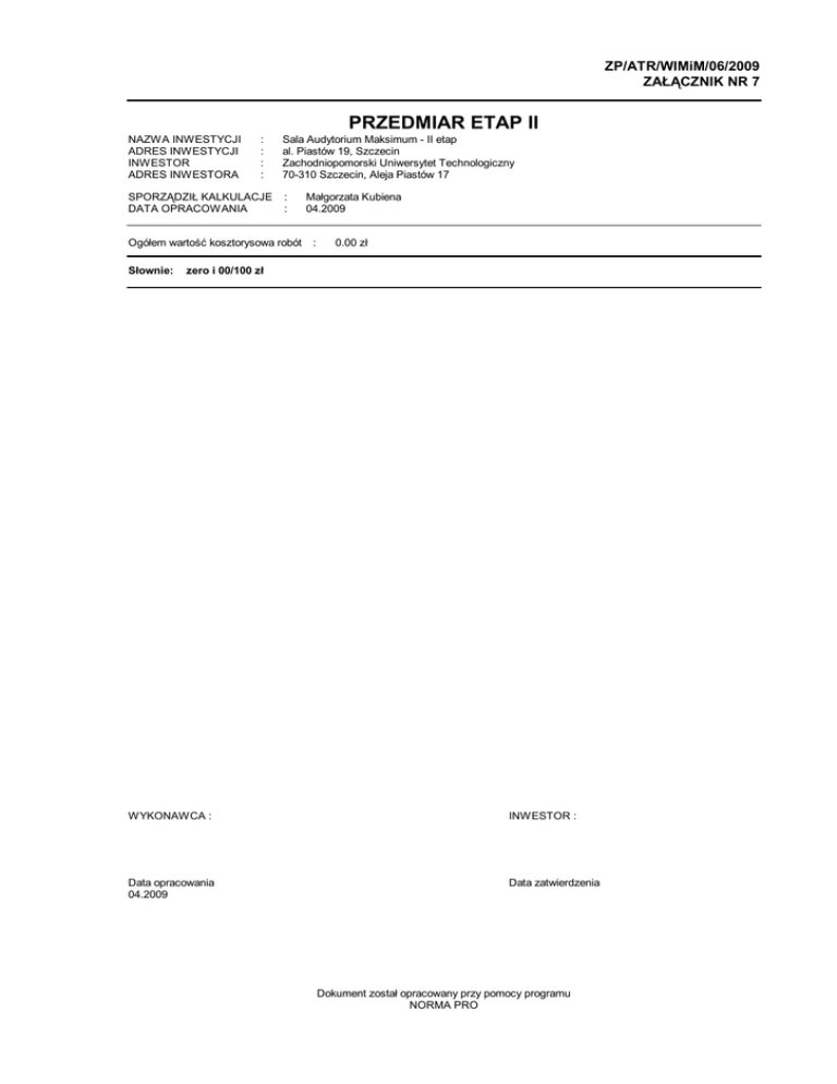 ZP/ATR/WIMiM/06/2009 ZAŁĄCZNIK NR 7 PRZEDMIAR ETAP II NAZWA INWESTYCJI ADRES INWESTYCJI INWESTOR ADRES INWESTORA : : : : SPORZĄDZIŁ KALKULACJE DATA OPRACOWANIA Sala Audytorium Maksimum - II etap al. Piastów 19, Szczecin Zachodniopomorski Uniwersytet Technologiczny 70-310 Szczecin, Aleja Piastów 17 : : Ogółem wartość kosztorysowa robót Słownie: Małgorzata Kubiena 04.2009 : 0.00 zł zero i 00/100 zł WYKONAWCA : INWESTOR : Data opracowania 04.2009 Data zatwierdzenia Dokument został opracowany przy pomocy programu NORMA PRO PRZEDM-audytorium-budowlana.ath Lp. 1 1.1 1 d.1. 1 Podstawa Opis i wyliczenia j.m. Przebudowa siedzisk auli Wymiana siedzisk Demontaż starych siedzisk drewniano-stalowych składanych wraz z pulpita- szt. kalk. włas- mi połączonych w zestawy z usunięciem z budynku na 160 szt. 2 d.1. kalk. włas1 na 2 2.1 3 d.2. 1 KSIĄŻKA PRZEDMIARÓW Dostawa i montaż stanowisk audytoryjnych bez nakładek tapicerskich na kpl. siedzisko i oparcie, mocowanych na stałe do podłoża, elem. stalowe kolor RAL 7034 - siedziska - 13*18=234 szt. - pulpity - nawiązujące do istniejących - wykonane jako stoły w okleinie drewnopodobnej, kolor do ustalenia z użytkownikiem - 12 szt. x 9 m (dokładną długość dopasować do modułu krzesełek) Siedziska powinny posiadać atest trudnozapalności. 1 kpl. Poszcz Razem 160.000 RAZEM 160.000 1.000 RAZEM 1.000 5.661 RAZEM 5.661 5.661 3.456 RAZEM 9.117 44.400 RAZEM 44.400 63.200 RAZEM 63.200 3.000 RAZEM 3.000 3.000 RAZEM 3.000 9.117 RAZEM 9.117 79.000 138.050 63.200 -9.117 RAZEM 271.133 276.100 RAZEM 276.100 Remont podłóg Przygotowanie podłóg i stopni pod wykładziny systemowe z wyrównaniem płytami OSB KNR 4-01 Rozebranie podłóg białych na półwpust w obrębie obudowy zasilania audio- m2 0428-02 wizualnego stołu laboratoryjnego prezydialnego m2 2.22*2.55 4 KNR 2-02 d.2. 2007-02 1 analogia Konstrukcje rusztów z listew drewnianych w miejscu demontowanej podłogi m2 dla wypoziomowania do podłoża parkietu pod płyty OSB poz.3 <w miejscu demontowanego stołu laboratoryjnego>1.2*(1.1+1.78) 5 KNR 4-01 d.2. 0815-08 1 6 KNNR 3 d.2. 0801-07 1 7 KNR 4-01 d.2. 0417-01 1 analogia 8 KNR 4-01 d.2. 0417-02 1 9 KNR 4-01 d.2. 0820-03 1 analogia 10 KNR 4-01 d.2. 0820-03 1 analogia 11 KNR 4-01 d.2. 0904-01 1 analogia m2 m2 Demontaż listew przyściennych z drewna liściastego - wsp. do R=0,65, M=0 m 4*2+5*2+12.6*2-3.3-0.9-1.8-1.8+3.2+2.9*2 m Zerwanie posadzek z tworzyw sztucznych z podłogi części górnej i pom. projekcyjnego m2 (12.6+3.2)*4 m2 Wymiana elementów schodów drewnianych - uzupełnienie części stopnic rzędu 1-3 w części środkowej z nawiązaniem do istniejących części zewnętrznych 3 szt. Wymiana elementów schodów drewnianych - podstopnice j.w. szt. 3 szt. Przybicie do podłóg płyt OSB-3 gr. 22 mm w celu wyrównania podłoża m2 poz.4 m2 Przybicie do podłóg płyt OSB-3 gr. 12 mm w celu wyrównania podłoża m2 <podłoga dolna - parkiet>5.0*(12.6+3.2) <poziome powierzchnie stopni i stopnice>22*0.5*12.55 <podłoga w części górnej>63.2 -poz.9 m2 m2 m2 m2 Przycięcie skraju istniejących stopni równając pod obrzeże przybitej płyty OSB - wsp. do R=0,5, zmiana jednostki - przyjęto 1 szt. = 1 m m 12.55*22 m 12 KNR-W 2- Warstwy niwelująco-wyrównawcze cementowe grubości 2 mm zatarte na d.2. 02 1105-01 gładko 1 -2- Norma PRO Wersja 4.11 Licencja: 7688 dla Akademia Rolnicza w Szczecinie szt. m2 PRZEDM-audytorium-budowlana.ath Lp. Podstawa KSIĄŻKA PRZEDMIARÓW Opis i wyliczenia poz.9+poz.10 j.m. m2 13 KNR-W 2- Warstwy wyrównawcze i wygładzające - pogrubienie warstwy o 1 mm d.2. 02 1105-02 1 poz.12 m2 14 KNR-W 2- Warstwy wyrównawcze i wygładzające - grunt na powierzchnie drewniane, d.2. 02 1105-03 nakład wg rzeczywistego zużycia, przyjęto 0,11kg/m2 1 analogia poz.12 m2 m2 m2 Poszcz 280.250 RAZEM 280.250 RAZEM Razem 280.250 280.250 280.250 RAZEM 280.250 2.2 Montaż wykładziny homogenicznej na podłogach i pod siedziskami o dużej odporności na ścieranie, gwarancja producenta na 10 lat, gr. min. 2 mm, klasyfikacja 34/43; montaż wykładziny kauczukowej na biegach schodowych R*2 -do wszystkich pozycji z uwagi na układanie wykładziny na stopniach i wg projektu kolorystyki posadzki 15 KNNR 2 Posadzki z wykładziny homogenicznej kolor jak typ 2746 Noraplan-Grip (nr m2 d.2. 1206-02 8 wg DT) lub równowazny wraz z asortymentem dodatkowym 2 <klin dolnej posadzki>0.4*11.3*0.5*1.15 m2 2.599 RAZEM 2.599 16 KNNR 2 Posadzki z wykładziny homogenicznej kolor jak typ 2454 Noraplan-Uni (nr 7 m2 d.2. 1206-02 wg DT) lub równowazny wraz z asortymentem dodatkowym 2 <klin dolnej posadzki>0.8*11.5*0.5*1.15 m2 5.290 <pasy odcinające wzdłuzne>0.15*(4.0+5.0)*2*1.15 m2 3.105 RAZEM 8.395 17 KNNR 2 Posadzki z wykładziny homogenicznej kolor jak typ 2148 Noraplan-Uni (nr 6 m2 d.2. 1206-02 wg DT) lub równowazny wraz z asortymentem dodatkowym 2 3.14*2.0*2.0 m2 12.560 RAZEM 12.560 18 KNNR 2 Posadzki z wykładziny homogenicznej kolor jak typ 2147 Noraplan-Uni (nr 5 m2 d.2. 1206-02 wg DT) lub równowazny wraz z asortymentem dodatkowym 2 <podłoga dolna>3.14*2.25*2.25 m2 15.896 <podłoga górna>4*9.0 m2 36.000 RAZEM 51.896 19 KNNR 2 Posadzki z wykładziny homogenicznej kolor jak typ 2146 Noraplan-Uni (nr 4 m2 d.2. 1206-02 wg DT) lub równowazny wraz z asortymentem dodatkowym 2 4*1.7*2 m2 13.600 5*12.5-2.599-5.29-12.56-15.896-3.105 m2 23.050 RAZEM 36.650 20 KNNR 2 Posadzki z wykładzin profili schodowych systemowych kauczukowych np. m2 d.2. 1206-02 system Norament typ 0749 Norament-925 grano (nr 1 wg DT) lub równo2 wazny wraz z asortymentem dodatkowym WYKŁADZINA KAUCZUKOWA <część zewn. schodów>1.7*0.5*2*22 m2 37.400 RAZEM 37.400 21 KNNR 2 Posadzki z wykładzinyy homogenicznej homogenicznej kolor jak typ 1253 m2 d.2. 1206-02 Norament-925 Grano (nr 2 wg DT) lub równowazny wraz z asortymentem 2 dodatkowym 9.0*0.5*22 m2 99.000 RAZEM 99.000 22 KNNR 2 Posadzki z wykładziny homogenicznej kolor jak typ 1254 Norament-925 m2 d.2.