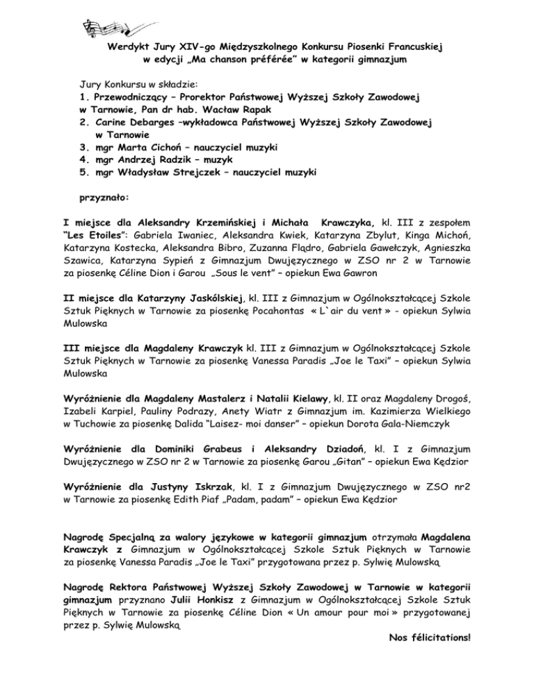 Werdykt Jury XIV-go Międzyszkolnego Konkursu Piosenki Francuskiej w edycji „Ma chanson préférée” w kategorii gimnazjum Jury Konkursu w składzie: 1. Przewodniczący – Prorektor Państwowej Wyższej Szkoły Zawodowej w Tarnowie, Pan dr hab. Wacław Rapak 2. Carine Debarges –wykładowca Państwowej Wyższej Szkoły Zawodowej w Tarnowie 3. mgr Marta Cichoń – nauczyciel muzyki 4. mgr Andrzej Radzik – muzyk 5. mgr Władysław Strejczek – nauczyciel muzyki przyznało: I miejsce dla Aleksandry Krzemińskiej i Michała Krawczyka, kl. III z zespołem “Les Etoiles”: Gabriela Iwaniec, Aleksandra Kwiek, Katarzyna Zbylut, Kinga Michoń, Katarzyna Kostecka, Aleksandra Bibro, Zuzanna Flądro, Gabriela Gawełczyk, Agnieszka Szawica, Katarzyna Sypień z Gimnazjum Dwujęzycznego w ZSO nr 2 w Tarnowie za piosenkę Céline Dion i Garou „Sous le vent” – opiekun Ewa Gawron II miejsce dla Katarzyny Jaskólskiej, kl. III z Gimnazjum w Ogólnokształcącej Szkole Sztuk Pięknych w Tarnowie za piosenkę Pocahontas « L`air du vent » - opiekun Sylwia Mulowska III miejsce dla Magdaleny Krawczyk kl. III z Gimnazjum w Ogólnokształcącej Szkole Sztuk Pięknych w Tarnowie za piosenkę Vanessa Paradis „Joe le Taxi” – opiekun Sylwia Mulowska Wyróżnienie dla Magdaleny Mastalerz i Natalii Kielawy, kl. II oraz Magdaleny Drogoś, Izabeli Karpiel, Pauliny Podrazy, Anety Wiatr z Gimnazjum im. Kazimierza Wielkiego w Tuchowie za piosenkę Dalida “Laisez- moi danser” – opiekun Dorota Gala-Niemczyk Wyróżnienie dla Dominiki Grabeus i Aleksandry Dziadoń, kl. I z Gimnazjum Dwujęzycznego w ZSO nr 2 w Tarnowie za piosenkę Garou „Gitan” – opiekun Ewa Kędzior Wyróżnienie dla Justyny Iskrzak, kl. I z Gimnazjum Dwujęzycznego w ZSO nr2 w Tarnowie za piosenkę Edith Piaf „Padam, padam” – opiekun Ewa Kędzior Nagrodę Specjalną za walory językowe w kategorii gimnazjum otrzymała Magdalena Krawczyk z Gimnazjum w Ogólnokształcącej Szkole Sztuk Pięknych w Tarnowie za piosenkę Vanessa Paradis „Joe le Taxi” przygotowana przez p. Sylwię Mulowską Nagrodę Rektora Państwowej Wyższej Szkoły Zawodowej w Tarnowie w kategorii gimnazjum przyznano Julii Honkisz z Gimnazjum w Ogólnokształcącej Szkole Sztuk Pięknych w Tarnowie za piosenkę Céline Dion « Un amour pour moi » przygotowanej przez p. Sylwię Mulowską Nos félicitations!