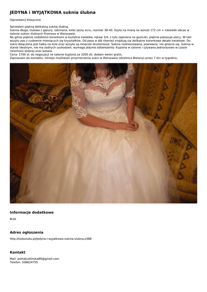JEDYNA i WYJĄTKOWA suknia ślubna [Sprzedam] Klasyczna Sprzedam piękną delikatną suknię ślubną. Suknia długa, tiulowa z gipiury, odcinana, kolor jasny ecru, rozmiar 38-40. Szyta na miarę na wzrost 172 cm + niewielki obcas w salonie sukien ślubnych Promesa w Warszawie. Na górze pięknie ozdobiona koronkami w kształcie kwiatów, rękaw 3/4, z tyłu zapinana na guziczki, pięknie pokazuje plecy. W talii wszyty pas z cudownie mieniących się kryształków. Od pasa w dół również znajdują się delikatne koronkowe detale kwiatowe. Do sukni dołączona jest halka na kole oraz wszyte są miseczki biustonosza. Suknia rozkloszowana, powiewna, nie gniecie się. Suknia w stanie idealnym, nie ma żadnych uszkodzeń, wymaga jedynie odświeżenia. Kupiona w salonie i używana jednorazowo w czasie ceremonii ślubnej oraz wesela. Cena: 1700 zł, do negocjacji (w salonie kupiona za 3200 zł), dodam welon gratis. Zapraszam do kontaktu. Istnieje możliwość przymierzenia sukni w Warszawie (dzielnica Bielany) przez 7 dni w tygodniu. Informacje dodatkowe Brak Adres ogłoszenia http://todoslubu.pl/jedyna-i-wyjatkowa-suknia-slubna,o388 Kontakt Mail: [email protected] Telefon: 506624755 Lokalizacja , Warszawa Mazowieckie (pl) Ogłoszenie dodano: 2016-11-15 12:00:38 Ogłoszenie wygasa: 2026-08-15 12:00:38 Powered by TCPDF (www.tcpdf.org)