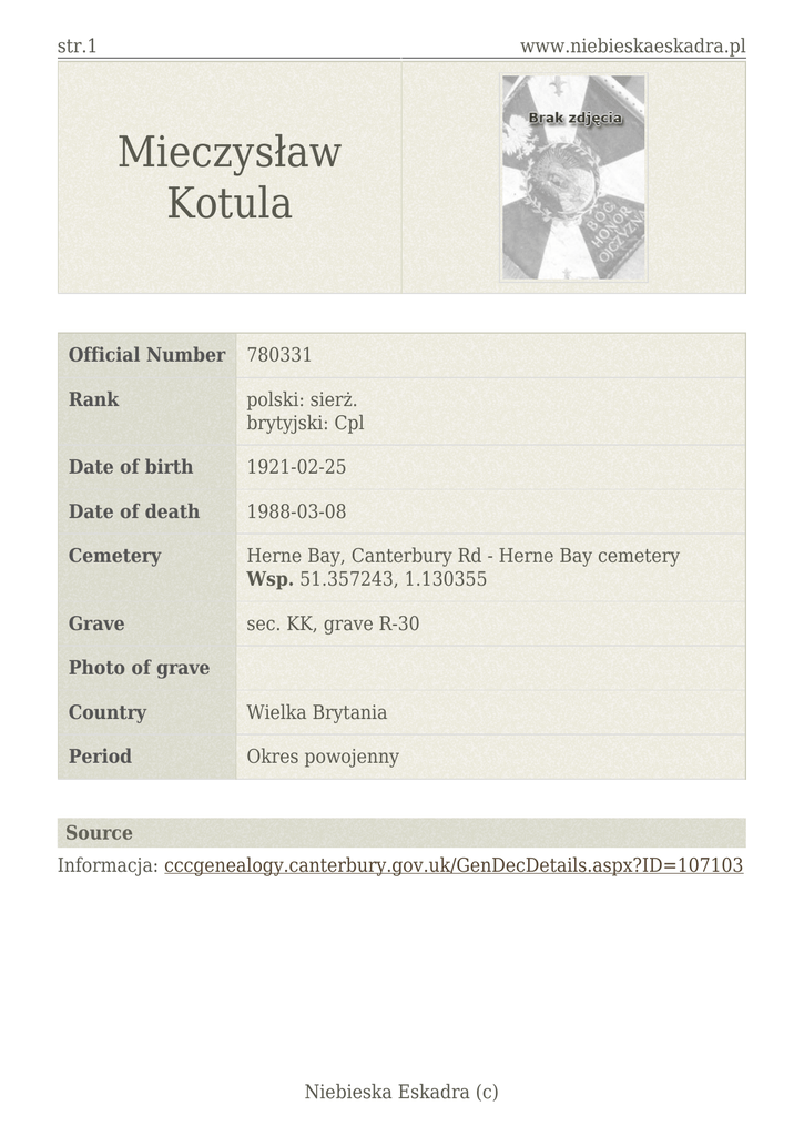 str.1 www.niebieskaeskadra.pl Mieczysław Kotula Official Number 780331 Rank polski: sierż. brytyjski: Cpl Date of birth 1921-02-25 Date of death 1988-03-08 Cemetery Herne Bay, Canterbury Rd - Herne Bay cemetery Wsp. 51.357243, 1.130355 Grave sec. KK, grave R-30 Photo of grave Country Wielka Brytania Period Okres powojenny Source Informacja: cccgenealogy.canterbury.gov.uk/GenDecDetails.aspx?ID=107103 Niebieska Eskadra (c)