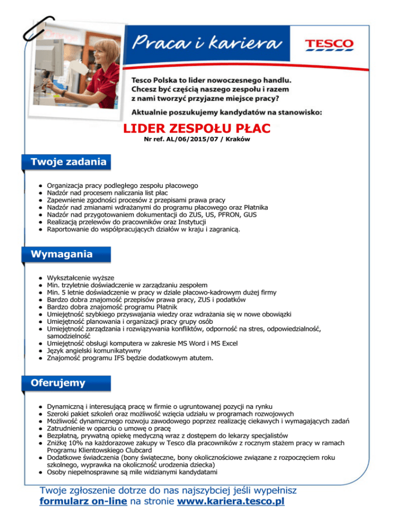 LIDER ZESPOŁU PŁAC Nr ref. AL/06/2015/07 / Kraków Twoje zadania Organizacja pracy podległego zespołu płacowego Nadzór nad procesem naliczania list płac Zapewnienie zgodności procesów z przepisami prawa pracy Nadzór nad zmianami wdrażanymi do programu płacowego oraz Płatnika Nadzór nad przygotowaniem dokumentacji do ZUS, US, PFRON, GUS Realizacją przelewów do pracowników oraz Instytucji Raportowanie do współpracujących działów w kraju i zagranicą. Wymagania Wykształcenie wyższe Min. trzyletnie doświadczenie w zarządzaniu zespołem Min. 5 letnie doświadczenie w pracy w dziale płacowokadrowym dużej firmy Bardzo dobra znajomość przepisów prawa pracy, ZUS i podatków Bardzo dobra znajomość programu Płatnik Umiejętność szybkiego przyswajania wiedzy oraz wdrażania się w nowe obowiązki Umiejętność planowania i organizacji pracy grupy osób Umiejętność zarządzania i rozwiązywania konfliktów, odporność na stres, odpowiedzialność, samodzielność Umiejętność obsługi komputera w zakresie MS Word i MS Excel Język angielski komunikatywny Znajomość programu IFS będzie dodatkowym atutem. Oferujemy Dynamiczną i interesującą pracę w firmie o ugruntowanej pozycji na rynku Szeroki pakiet szkoleń oraz możliwość wzięcia udziału w programach rozwojowych Możliwość dynamicznego rozwoju zawodowego poprzez realizację ciekawych i wymagających zadań Zatrudnienie w oparciu o umowę o pracę Bezpłatną, prywatną opiekę medyczną wraz z dostępem do lekarzy specjalistów Zniżkę 10% na każdorazowe zakupy w Tesco dla pracowników z rocznym stażem pracy w ramach Programu Klientowskiego Clubcard Dodatkowe świadczenia (bony świąteczne, bony okolicznościowe związane z rozpoczęciem roku szkolnego, wyprawka na okoliczność urodzenia dziecka) Osoby niepełnosprawne są mile widzianymi kandydatami Twoje zgłoszenie dotrze do nas najszybciej jeśli wypełnisz formularz on-line na stronie www.kariera.tesco.pl Termin nadsyłania podań upływa 20150719
