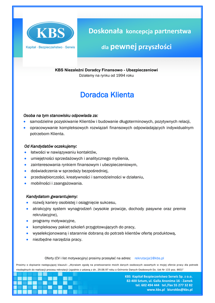Doskonała koncepcja partnerstwa dla pewnej przyszłości KBS Niezależni Doradcy Finansowo - Ubezpieczeniowi Działamy na rynku od 1994 roku Doradca Klienta Osoba na tym stanowisku odpowiada za: samodzielne pozyskiwanie Klientów i budowanie długoterminowych, pozytywnych relacji, opracowywanie kompleksowych rozwiązań finansowych odpowiadających indywidualnym potrzebom Klienta. Od Kandydatów oczekujemy: łatwości w nawiązywaniu kontaktów, umiejętności sprzedażowych i analitycznego myślenia, zainteresowania rynkiem finansowym i ubezpieczeniowym, doświadczenia w sprzedaży bezpośredniej, przedsiębiorczości, kreatywności i samodzielności w działaniu, mobilności i zaangażowania. Kandydatom gwarantujemy: rozwój kariery osobistej i osiągnięcie sukcesu, atrakcyjny system wynagrodzeń (wysokie prowizje, dochody pasywne oraz premie rekrutacyjne), programy motywacyjne, kompleksowy pakiet szkoleń przygotowujących do pracy, wyselekcjonowaną i starannie dobraną do potrzeb klientów ofertę produktową, niezbędne narzędzia pracy. Oferty (CV i list motywacyjny) prosimy przesyłać na adres: [email protected] Prosimy o dopisanie następującej klauzuli: „Wyrażam zgodę na przetwarzanie moich danych osobowych zawartych w mojej ofercie pracy dla potrzeb niezbędnych do realizacji procesu rekrutacji (zgodnie z ustawą z dn. 29.08.97 roku o Ochronie Danych Osobowych Dz. Ust Nr 133 poz. 883)" KBS Kapitał Bezpieczeństwo Serwis Sp. z o.o. 82-400 Sztum, ul. Galla Anonima 16 - Zamek tel. 602 494 444 tel./fax 55 277 32 82 www.kbs.pl [email protected]