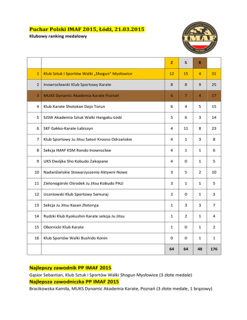 Puchar Polski IMAF 2015, Łódź, 21.03.2015 Klubowy ranking medalowy Z S B 1 Klub Sztuk i Sportów Walki „Shogun” Mysłowice 12 15 4 31 2 Inowrocławski Klub Sportowy Karate 8 8 9 25 3 MUKS Dynamic Akademia Karate Poznań 6 7 4 17 4 Klub Karate Shotokan Dojo Torun 6 4 5 15 5 SJSW Akademia Sztuk Walki Hangaku Łódź 5 6 3 14 6 SKF Gakko-Karate Łabiszyn 4 11 8 23 7 Klub Sportowy Ju Jitsu Satori Krosno Odrzańskie 4 1 3 8 8 Sekcja IMAF KSM Rondo Inowrocław 4 1 1 6 9 UKS Dwójka Sho Kobudo Zakopane 4 0 1 5 10 Nadwiślańskie Stowarzyszenie Aktywni Nowe 3 5 2 10 11 Zielonogórski Ośrodek Ju Jitsu Kobudo PAJJ 3 1 1 5 12 Uczniowski Klub Sportowy Samuraj 2 0 1 3 13 Sekcja Ju Jitsu Kazan Złotoryja 1 3 3 7 14 Rudzki Klub Kyokushin Karate sekcja Ju Jitsu 1 2 1 4 15 Obornicki Klub Karate 1 0 1 2 16 Klub Sportów Walki Bushido Konin 0 0 1 1 64 64 48 176 Najlepszy zawodnik PP IMAF 2015 Gąsior Sebastian, Klub Sztuk i Sportów Walki Shogun Mysłowice (3 złote medale) Najlepsza zawodniczka PP IMAF 2015 Bracikowska Kamila, MUKS Dynamic Akademia Karate, Poznań (3 złote medale, 1 brązowy)