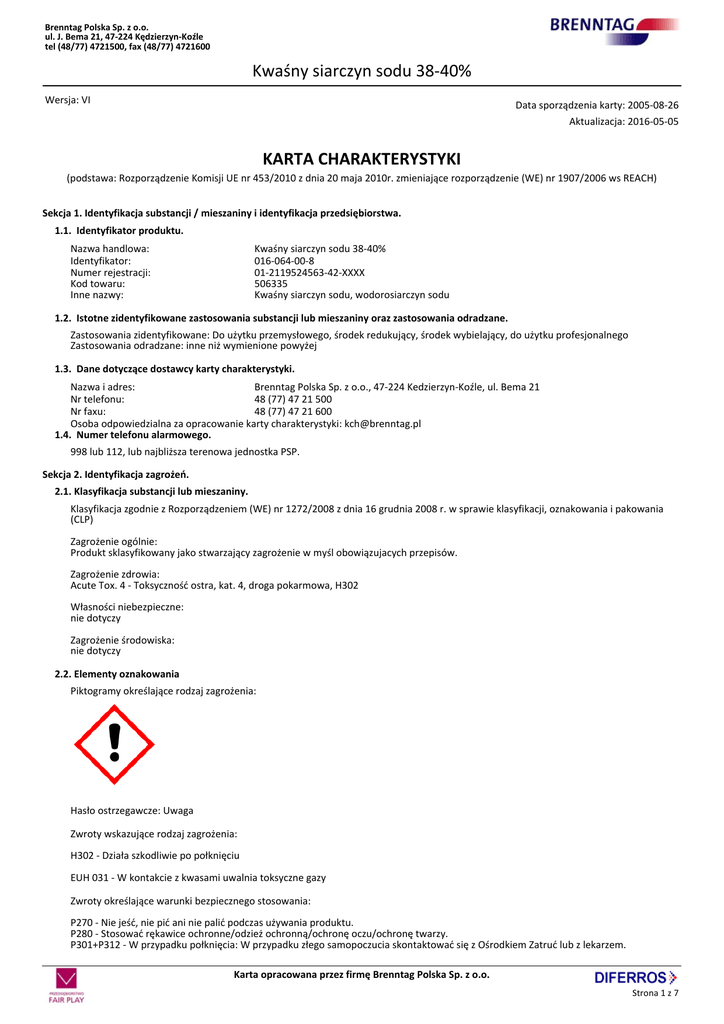 Brenntag Polska Sp. z o.o. ul. J. Bema 21, 47-224 Kędzierzyn-Koźle tel (48/77) 4721500, fax (48/77) 4721600 Kwaśny siarczyn sodu 38-40% Wersja: VI Data sporządzenia karty: 2005-08-26 Aktualizacja: 2016-05-05 KARTA CHARAKTERYSTYKI (podstawa: Rozporządzenie Komisji UE nr 453/2010 z dnia 20 maja 2010r. zmieniające rozporządzenie (WE) nr 1907/2006 ws REACH) Sekcja 1. Identyfikacja substancji / mieszaniny i identyfikacja przedsiębiorstwa. 1.1. Identyfikator produktu. Nazwa handlowa: Identyfikator: Numer rejestracji: Kod towaru: Inne nazwy: Kwaśny siarczyn sodu 38-40% 016-064-00-8 01-2119524563-42-XXXX 506335 Kwaśny siarczyn sodu, wodorosiarczyn sodu 1.2. Istotne zidentyfikowane zastosowania substancji lub mieszaniny oraz zastosowania odradzane. Zastosowania zidentyfikowane: Do użytku przemysłowego, środek redukujący, środek wybielający, do użytku profesjonalnego Zastosowania odradzane: inne niż wymienione powyżej 1.3. Dane dotyczące dostawcy karty charakterystyki. Nazwa i adres: Brenntag Polska Sp. z o.o., 47-224 Kedzierzyn-Koźle, ul. Bema 21 Nr telefonu: 48 (77) 47 21 500 Nr faxu: 48 (77) 47 21 600 Osoba odpowiedzialna za opracowanie karty charakterystyki: [email protected] 1.4. Numer telefonu alarmowego. 998 lub 112, lub najbliższa terenowa jednostka PSP. Sekcja 2. Identyfikacja zagrożeń. 2.1. Klasyfikacja substancji lub mieszaniny. Klasyfikacja zgodnie z Rozporządzeniem (WE) nr 1272/2008 z dnia 16 grudnia 2008 r. w sprawie klasyfikacji, oznakowania i pakowania (CLP) Zagrożenie ogólnie: Produkt sklasyfikowany jako stwarzający zagrożenie w myśl obowiązujacych przepisów. Zagrożenie zdrowia: Acute Tox. 4 - Toksyczność ostra, kat. 4, droga pokarmowa, H302 Własności niebezpieczne: nie dotyczy Zagrożenie środowiska: nie dotyczy 2.2. Elementy oznakowania Piktogramy określające rodzaj zagrożenia: Hasło ostrzegawcze: Uwaga Zwroty wskazujące rodzaj zagrożenia: H302 - Działa szkodliwie po połknięciu EUH 031 - W kontakcie z kwasami uwalnia toksyczne gazy Zwroty określające warunki bezpiecznego stosowania: P270 - Nie jeść, nie pić ani nie palić podczas używania produktu. P280 - Stosować rękawice ochronne/odzież ochronną/ochronę oczu/ochronę twarzy. P301+P312 - W przypadku połknięcia: W przypadku złego samopoczucia skontaktować się z Ośrodkiem Zatruć lub z lekarzem. Karta opracowana przez firmę Brenntag Polska Sp. z o.o. Strona 1 z 7 Brenntag Polska Sp. z o.o. ul. J. Bema 21, 47-224 Kędzierzyn-Koźle tel (48/77) 4721500, fax (48/77) 4721600 Kwaśny siarczyn sodu 38-40% P305+P351+P338 - W przypadku dostania się do oczu: Ostrożnie płukać wodą przez kilka minut.Wyjąć soczewki kontaktowe, jeżeli są i można je łatwo usunąć. nadal płukać. P406 - Przechowywać w pojemniku odpornym na korozję / … o odpornej powłoce wewnętrznej P264a - Dokładnie umyć ręce po użyciu 2.3. Inne zagrożenia. EUH 031 w kontakcie z kwasami uwalnia toksyczne gazy. Produkt o charakterze lekko kwaśnym, powoduje zakwaszenie środowiska. Sekcja 3. Skład / informacja o składnikach. Skład wg Rozporządzenia 1272/2008. wodorosiarczyn sodu 38-40% (Acute Tox. 4, H302; EUH 031; CAS: 7631-90-5; WE: 231-548-0) Numer rejestracji: 01-2119524563-42-XXXX O ile wymienione są składniki niebezpieczne, znaczenie zwrotów H podane jest w p. 16 karty charakterystyki. Sekcja 4. Środki pierwszej pomocy. 4.1. Opis środków pierwszej pomocy. Wdychanie: W razie narażenia inhalacyjnego wyprowadzić poszkodowanego na świeże powietrze, w przypadku nie ustępujących objawów (kaszel) zapewnić pomoc lekarza Kontakt ze skórą: W razie zanieczyszczenia skóry zdjąć zanieczyszczoną odzież, zmyć skórę wodą, przy wystąpieniu podrażnienia zwrócić się o pomoc medyczną Kontakt z oczami: W razie zanieczyszczenia oczu przemywać oczy dużą ilością wody, skonsultować z okulistą Spożycie: W razie spożycia przepłukać usta wodą, sprowokować wymioty, nie podawać płynów. Natychmiast zapewnić pomoc lekarską. 4.2. Najważniejsze ostre i opóźnione objawy oraz skutki narażenia. Nie są znane 4.3. Wskazania dotyczące wszelkiej natychmiastowej pomocy lekarskiej i szczególnego postępowania z poszkodowanym. Przy wystąpieniu niepokojących objawów natychmiast zapewnić pomoc lekarską. Sekcja 5. Postępowanie w przypadku pożaru. 5.1. Środki gaśnicze. Produkt niepalny. Pożary w obecności produktu gasić środkami odpowiednimi dla palących się materiałów 5.2. Szczególne zagrożenia związane z substancją lub mieszaniną. Produkt niepalny. Podczas pożaru mogą uwalniać się toksyczne gazy. 5.3. Informacje dla straży pożarnej. Pojemniki narażone na działanie wysokiej temperatury chłodzic wodą i jeśli to możliwe usunąć z miejsca narażenia. Nie dopuścić do przedostania się zanieczyszczonej wody gaśniczej do kanalizacji i wód. Niezależny aparat oddechowy i odzież ochronną Sekcja 6. Postępowanie w przypadku niezamierzonego uwolnienia do środowiska. 6.1. Indywidualne środki ostrożności, wyposażenie ochronne i procedury w sytuacjach awaryjnych. Stosować zalecane indywidualne środki ochrony. Unikać bezpośredniego kontaktu z uwalniającym się produktem, W przypadku uwolnienia w zamkniętej przestrzeni zapewnić skuteczną wentylację 6.2. Środki ostrożności w zakresie ochrony środowiska. Zapobiec rozprzestrzenianiu się produktu, zabezpieczyć studzienki ściekowe; nie dopuścić do przedostania się do środowiska (rzek,gleb,kanałów śsciekowych). W razie zanieczyszczenia środowiska poinformowac odpowiednie służby. 6.3. Metody i materiały zapobiegające rozprzestrzenianiu się skażenia i służące do usuwania skażenia. Zapobiegac rozprzestrzenianiu się produktu za pomocą piasku, ziemi; rozlewy zebrać za pomocą inertnego absorbenta (pisek, ziemia, uniwersalne absorbery), umiescić w szczelnym opakowaniu. Przekazać do likwidacji. Neutralizacja – rozcieńczyć wodą, zneutralizować do pH = 7 zawiesin