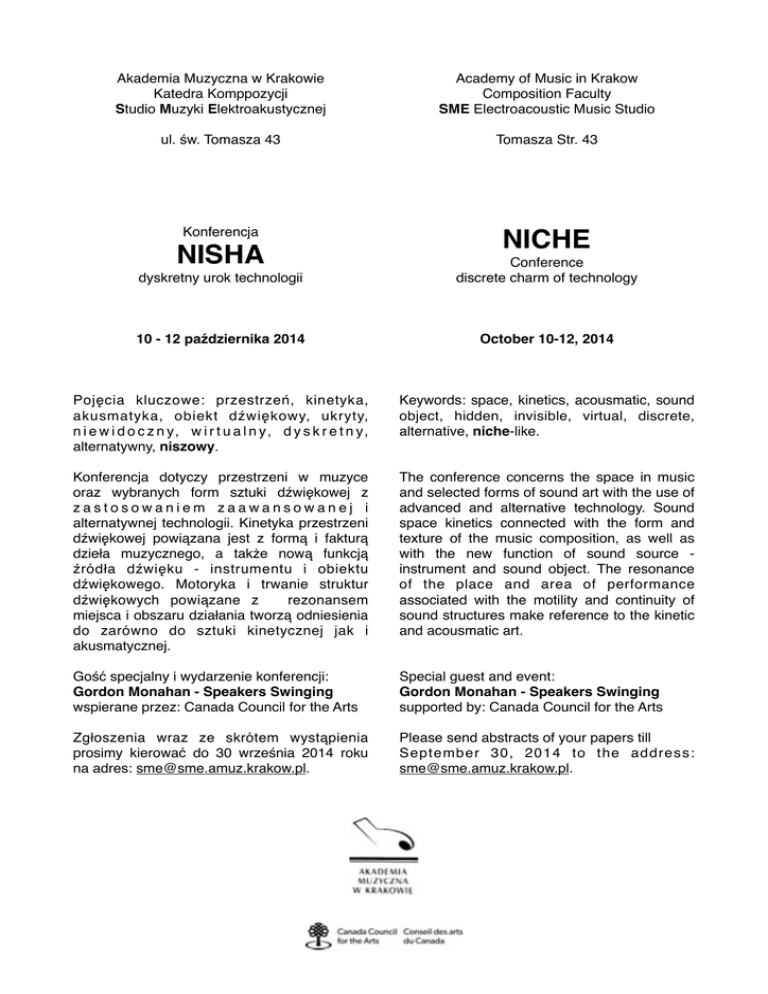 Akademia Muzyczna w Krakowie ! Katedra Komppozycji! Studio Muzyki Elektroakustycznej ! Academy of Music in Krakow! Composition Faculty! SME Electroacoustic Music Studio! ul. św. Tomasza 43! Tomasza Str. 43! ! ! ! ! ! ! ! ! ! ! ! ! Konferencja ! NICHE ! NISHA! dyskretny urok technologii! Conference! discrete charm of technology! 10 - 12 października 2014! October 10-12, 2014! ! ! ! ! ! ! Pojęcia kluczowe: przestrzeń, kinetyka, akusmatyka, obiekt dźwiękowy, ukryty, n i e w i d o c z n y, w i r t u a l n y, d y s k r e t n y, alternatywny, niszowy. ! ! ! ! ! ! ! Keywords: space, kinetics, acousmatic, sound object, hidden, invisible, virtual, discrete, alternative, niche-like.! ! ! ! ! ! ! ! ! Konferencja dotyczy przestrzeni w muzyce oraz wybranych form sztuki dźwiękowej z zastosowaniem zaawansowanej i alternatywnej technologii. Kinetyka przestrzeni dźwiękowej powiązana jest z formą i fakturą dzieła muzycznego, a także nową funkcją źródła dźwięku - instrumentu i obiektu dźwiękowego. Motoryka i trwanie struktur dźwiękowych powiązane z rezonansem miejsca i obszaru działania tworzą odniesienia do zarówno do sztuki kinetycznej jak i akusmatycznej.! Gość specjalny i wydarzenie konferencji: ! Gordon Monahan - Speakers Swinging! wspierane przez: Canada Council for the Arts! Zgłoszenia wraz ze skrótem wystąpienia prosimy kierować do 30 września 2014 roku na adres: [email protected].! ! ! ! ! ! ! ! ! ! The conference concerns the space in music and selected forms of sound art with the use of advanced and alternative technology. Sound space kinetics connected with the form and texture of the music composition, as well as with the new function of sound source instrument and sound object. The resonance of the place and area of performance associated with the motility and continuity of sound structures make reference to the kinetic and acousmatic art.! Special guest and event:! Gordon Monahan - Speakers Swinging! supported by: Canada Council for the Arts! Please send abstracts of your papers till ! September 30, 2014 to the address: [email protected].! ! ! ! ! ! ! ! ! ! 11.10.2014! 10.10.2014! Akademia Muzyczna! 12.00 Akademia Muzyczna! SME Studio Sala Koncertowa / Concert Hall! A6! Tomasza 43! Tomasza 43! 19.00! Koncert muzyki akusmatycznej! program ! Gordon Monahan! Audio Art i instalacje dźwiękowe! Sound Art @ sound installations! Karlheinz Stockhausen Gesang der Junglinge (1956)! Dariusz Mazurowski - Symfonia nieakustyczna (2014)! Piotr Madej - Ephemeris (2014)! Krzysztof Wołek - Mobile Variations (2004)! Denim Szram - Symetric Nature (2013/2014)! Marek Chołoniewski - Waves + (2014)! 14.30 Akademia Sztuk Pięknych ! Wydział Intermediów! Intermedia Department! Piłsudskiego 38! ! 11.10.2014! !! ! ! Akademia Muzyczna! Tomasza 43! Sala Kameralna / Chamber Hall! referaty / papers - Sesja 1 Session! 11.00! Marek Chołoniewski - Kinetyka przestrzeni dźwiękowej / Sound space kinetics! 11.30! Gordon Monahan - Deconstruction the piano / Dekonstrukcja fortepianu! 12.00! Konrad Gęca - Wokół formy otwartej / Around open form! 12.30! Maciej Ożóg - Ciało jako przestrzeń / Body as a space! 13.00! Leszek Hefi Wiśniowski - Chopin a kinetyka / Chopin and kinetics! 13.30! Artur Lis - Oscilloshock! 13.50! Marcin Strzelecki - Nisza optymalna / Optimal Niche! 14.10! przerwa / break! 15.00! Mateusz Bień - Znaczące uproszczenia. Między obrazem a dźwiękiem / Significant simplifications. Between image and sound! 15.30! Edyta Mąsior - Nisha. Technologia / Niche. Technology! 16.00! Jan Piotr Cieślak - Architektura Dźwięku / Acoustic Architecture! 16.30! Dariusz Mazurowski Odwzorowywanie przestrzeni naturalnych i tworzenie wirtualnych środowisk akustycznych w muzyce elektroakaustycznej / Transforming natural environments and composing virtual acoustic environments in electroacoustic music ! 17.00! Krzysztof Szwajgier - Cztery i pół minuty milczenia / 4 & 1/2 minutes of silence! 17.30! Paweł Górecki - Przestrzeń. Uwagi filozoficzne / Space. Philosophical remarks! 18.00 ! Rafał Mazur - Qiyun - przepływ/rezonans qi jako istotna zasada praktyki muzycznej kręgu wenren. Czyli dlaczego dla chińskich filozofów świat to przedmiot dźwiękowy! Qiyun - flow / resonance qi as a significant rule of a wenren music! 12.10.2014! Akademia Muzyczna! Tomasza 43! Sala Kameralna / Chamber Hall! referaty / papers - Sesja 2 Session! 11.00 ! Franciszek Araszkiewicz - Autorskie objekty interakcji dźwiękowe / Author objects of sound interaction! 11.30! Jakub Polaczyk - Kinetyka wykonawcza i przestrzeń teatralno-wizualna w moich utworach z ostatnich lat / Performance kinetics and theatrevisual space in my last compositions! 12.00! Grzegorz Biliński - Łapacze dźwięku w przestrzeni ponaddźwiękowej / Sound catchers in a overacoustic space! 13.00 ! dyskusja / discussion! !! !! ! 20.00 ! Cricoteka! Nadwiślańska 2-4! Performance Audiowizualny! Gordon Monahan! Speaker Swinging! wykonawcy:! Gordon Monahan! Dorota Kozłowska! Karol Nepelski! Krzysztof Satora! prolog Festiwalu Audio Art 2014