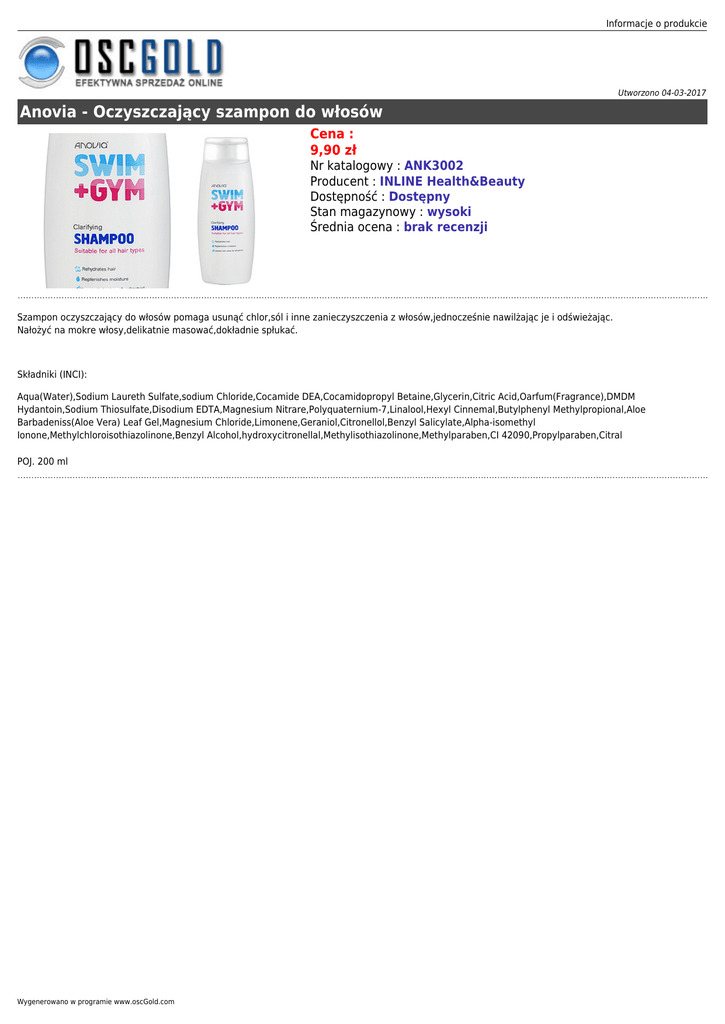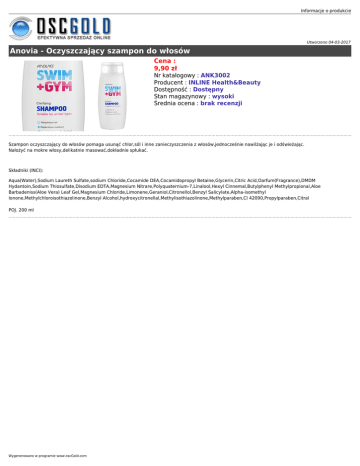 Informacje o produkcie Utworzono 04-03-2017 Anovia - Oczyszczający szampon do włosów Cena : 9,90 zł Nr katalogowy : ANK3002 Producent : INLINE Health&Beauty Dostępność : Dostępny Stan magazynowy : wysoki Średnia ocena : brak recenzji Szampon oczyszczający do włosów pomaga usunąć chlor,sól i inne zanieczyszczenia z włosów,jednocześnie nawilżając je i odświeżając. Nałożyć na mokre włosy,delikatnie masować,dokładnie spłukać. Składniki (INCI): Aqua(Water),Sodium Laureth Sulfate,sodium Chloride,Cocamide DEA,Cocamidopropyl Betaine,Glycerin,Citric Acid,Oarfum(Fragrance),DMDM Hydantoin,Sodium Thiosulfate,Disodium EDTA,Magnesium Nitrare,Polyquaternium-7,Linalool,Hexyl Cinnemal,Butylphenyl Methylpropional,Aloe Barbadeniss(Aloe Vera) Leaf Gel,Magnesium Chloride,Limonene,Geraniol,Citronellol,Benzyl Salicylate,Alpha-isomethyl Ionone,Methylchloroisothiazolinone,Benzyl Alcohol,hydroxycitronellal,Methylisothiazolinone,Methylparaben,CI 42090,Propylparaben,Citral POJ. 200 ml Wygenerowano w programie www.oscGold.com