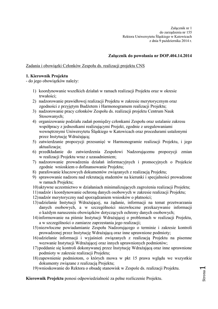 Załącznik nr 1 do zarządzenia nr 155 Rektora Uniwersytetu Śląskiego w Katowicach z dnia 9 października 2014 r. Załącznik do powołania nr DOP.404.14.2014 Zadania i obowiązki Członków Zespołu ds. realizacji projektu CNS Kierownik Projektu ponosi odpowiedzialność za pełne rozliczenie Projektu. Strona 1) koordynowanie wszelkich działań w ramach realizacji Projektu oraz w okresie trwałości; 2) nadzorowanie prawidłowej realizacji Projektu w zakresie merytorycznym oraz zgodności z przyjętym Budżetem i Harmonogramem realizacji Projektu; 3) nadzorowanie pracy członków Zespołu ds. realizacji projektu Centrum Nauk Stosowanych; 4) organizowanie podziału zadań pomiędzy członkami Zespołu oraz ustalanie zakresu współpracy z jednostkami realizującymi Projekt, zgodnie z uregulowaniami wewnętrznymi Uniwersytetu Śląskiego w Katowicach oraz procedurami ustalonymi przez Instytucję Wdrażającą; 5) zatwierdzanie propozycji przesunięć w Harmonogramie realizacji Projektu, i jego aktualizacja; 6) przedkładanie do zatwierdzenia Zespołowi Nadzorującemu propozycji zmian w realizacji Projektu wraz z uzasadnieniem; 7) nadzorowanie prowadzenia działań informacyjnych i promocyjnych o Projekcie zgodnie wnioskiem o dofinansowanie Projektu; 8) parafowanie kluczowych dokumentów związanych z realizacją Projektu; 9) sprawowanie nadzoru nad rekrutacją studentów na kierunki i specjalności prowadzone w ramach Projektu; 10) aktywne uczestnictwo w działaniach minimalizujących zagrożenia realizacji Projektu; 11) nadzór i koordynowanie ochroną danych osobowych w zakresie realizacji Projektu; 12) nadzór merytoryczny nad sporządzaniem wniosków o płatności; 13) udzielanie Instytucji Wdrażającej, na żądanie, informacji na temat przetwarzania danych osobowych, a w szczególności niezwłoczne przekazywanie informacji o każdym naruszeniu obowiązków dotyczących ochrony danych osobowych; 14) informowanie na piśmie Instytucji Wdrażającej o problemach w realizacji Projektu, a w szczególności o zamiarze zaprzestania jego realizacji; 15) niezwłoczne powiadamianie Zespołu Nadzorującego o terminie i zakresie kontroli prowadzonej przez Instytucję Wdrażającą oraz inne uprawnione podmioty; 16) udzielanie informacji i wyjaśnień związanych z realizacją Projektu na pisemne wezwanie Instytucji Wdrażającej oraz innych uprawnionych podmiotów; 17) poddanie się kontroli dokonywanej przez Instytucję Wdrażającą oraz inne uprawnione podmioty w zakresie realizacji Projektu; 18) zapewnienie podmiotom, o których mowa w pkt 15 prawa wglądu we wszystkie dokumenty związane z realizacją Projektu; 19) wnioskowanie do Rektora o obsadę stanowisk w Zespole ds. realizacji Projektu. 1 1. Kierownik Projektu - do jego obowiązków należy: 2. Zastępca Kierownika Projektu - do jego obowiązków należy: 1) planowanie i organizowanie przydzielonych zadań; 2) nadzorowanie zasadności i terminowości realizacji dostaw, usług i robót budowlanych realizowanych w ramach Projektu; 3) nadzorowanie zgodności kosztów i wydatków z Harmonogramem realizacji Projektu; 4) nadzorowanie przestrzegania zasad archiwizacji dokumentów Projektu; 5) informowanie Instytucji Wdrażającej o miejscu archiwizacji dokumentów związanych z realizowanym Projektem; 6) zarządzanie realizacją Projektu w przypadku nieobecności Kierownika Projektu; 7) potwierdzanie wniosków o realizację dostaw, usług, i robót budowlanych zgodnie z Harmonogramem realizacji Projektu; 8) kontrolowanie prawidłowego opisu dowodów księgowych dokumentujących koszty i wydatki poniesione w ramach Projektu, zgodnie z wytycznymi w zakresie kwalifikowania kosztów i wydatków; 9) nadzór formalno-rachunkowy nad sporządzaniem wniosków o płatności oraz aktualizacją Harmonogramu realizacji Projektu; 10) potwierdzanie wszelkich kosztów i wydatków ujętych w Harmonogramie realizacji Projektu; 11) aktywne uczestnictwo w działaniach minimalizujących zagrożenia realizacji Projektu. 3. Koordynator do spraw inwestycji budowlanej - do jego obowiązków należy: 1) planowanie i organizowanie przydzielonych zadań; 2) nadzorowanie realizacji zadań zgodnie z Harmonogramem realizacji Projektu; 3) nadzór nad technicznym wyposażeniem pomieszczeń zgodnie z planowaną funkcją dydaktyczną; 4) aktywne uczestnictwo w działaniach minimalizujących zagrożenia realizacji Projektu. Strona 1) planowanie i organizowanie przydzielonych zadań; 2) opracowanie i realizacja akcji promocyjnej zgodnie z planem działań promocyjnych zawartych we wniosku o dofinansowanie projektu Centrum Nauk Stosowanych, w szczególności upowszechnianie informacji o wkładzie wspólnotowym oraz kierunkach i specjalnościach prowadzonych w ramach CNS; 3) organizowanie serwisu WWW Projektu; 4) pełnienie funkcji rzecznika prasowego Centrum Nauk Stosowanych; 5) koordynowanie prac związanych ze współpracą z otoczeniem, przygotowywanie umów regulujących zasady tej współpracy; 6) wyszukiwanie tematów badawczych, na które jest zapotrzebowanie na rynku; 7) nawiązywanie kontaktów z otoczeniem - potencjalnymi zleceniodawcami badań naukowych; 8) ścisła współpraca z Koordynatorem do spraw wyposażenia dydaktycznego CNS; 2 4. Koordynator do spraw promocji i współpracy z otoczeniem - do jego obowiązków należy: 9) aktywne uczestnictwo w działaniach minimalizujących zagrożenia realizacji Projektu. 5. Koordynator do spraw wyposażenia dydaktycznego CNS - do jego obowiązków należy: 1) planowanie i organizowanie przydzielonych zadań; 2) nadzór nad przygotowaniem i realizacją zamówień wyposażenia dydaktycznego CNS zgodnie z harmonogramem realizacji Projektu oraz załącznikiem nr 18 zestawienie rzeczowo wartościowe; 3) koordynowanie prac związanych z uruchamianiem nowych kierunków i specjalności w ramach Centrum Nauk Stosowanych; 4) badanie rynku pod kątem potrzeb specjalistów; 5) opracowanie siatek kierunków i specjalności; 6) o