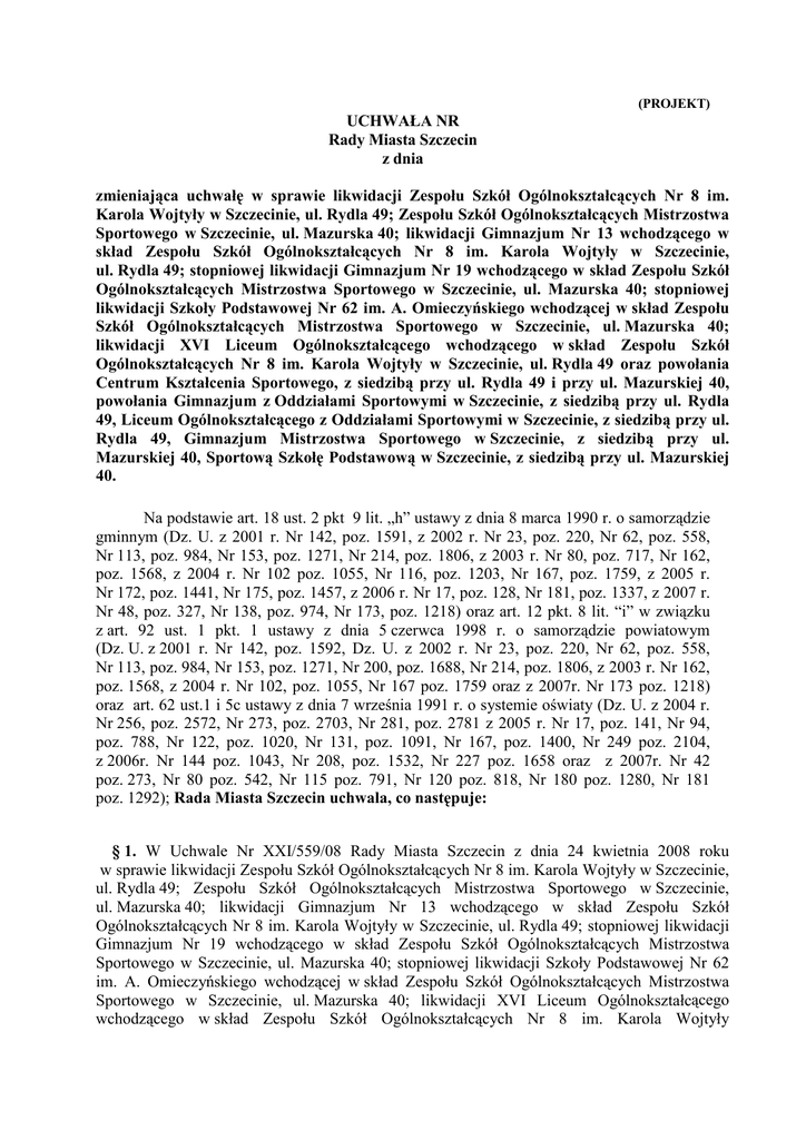 (PROJEKT) UCHWAŁA NR Rady Miasta Szczecin z dnia zmieniająca uchwałę w sprawie likwidacji Zespołu Szkół Ogólnokształcących Nr 8 im. Karola Wojtyły w Szczecinie, ul. Rydla 49; Zespołu Szkół Ogólnokształcących Mistrzostwa Sportowego w Szczecinie, ul. Mazurska 40; likwidacji Gimnazjum Nr 13 wchodzącego w skład Zespołu Szkół Ogólnokształcących Nr 8 im. Karola Wojtyły w Szczecinie, ul. Rydla 49; stopniowej likwidacji Gimnazjum Nr 19 wchodzącego w skład Zespołu Szkół Ogólnokształcących Mistrzostwa Sportowego w Szczecinie, ul. Mazurska 40; stopniowej likwidacji Szkoły Podstawowej Nr 62 im. A. Omieczyńskiego wchodzącej w skład Zespołu Szkół Ogólnokształcących Mistrzostwa Sportowego w Szczecinie, ul. Mazurska 40; likwidacji XVI Liceum Ogólnokształcącego wchodzącego w skład Zespołu Szkół Ogólnokształcących Nr 8 im. Karola Wojtyły w Szczecinie, ul. Rydla 49 oraz powołania Centrum Kształcenia Sportowego, z siedzibą przy ul. Rydla 49 i przy ul. Mazurskiej 40, powołania Gimnazjum z Oddziałami Sportowymi w Szczecinie, z siedzibą przy ul. Rydla 49, Liceum Ogólnokształcącego z Oddziałami Sportowymi w Szczecinie, z siedzibą przy ul. Rydla 49, Gimnazjum Mistrzostwa Sportowego w Szczecinie, z siedzibą przy ul. Mazurskiej 40, Sportową Szkołę Podstawową w Szczecinie, z siedzibą przy ul. Mazurskiej 40. Na podstawie art. 18 ust. 2 pkt 9 lit. „h” ustawy z dnia 8 marca 1990 r. o samorządzie gminnym (Dz. U. z 2001 r. Nr 142, poz. 1591, z 2002 r. Nr 23, poz. 220, Nr 62, poz. 558, Nr 113, poz. 984, Nr 153, poz. 1271, Nr 214, poz. 1806, z 2003 r. Nr 80, poz. 717, Nr 162, poz. 1568, z 2004 r. Nr 102 poz. 1055, Nr 116, poz. 1203, Nr 167, poz. 1759, z 2005 r. Nr 172, poz. 1441, Nr 175, poz. 1457, z 2006 r. Nr 17, poz. 128, Nr 181, poz. 1337, z 2007 r. Nr 48, poz. 327, Nr 138, poz. 974, Nr 173, poz. 1218) oraz art. 12 pkt. 8 lit. “i” w związku z art. 92 ust. 1 pkt. 1 ustawy z dnia 5 czerwca 1998 r. o samorządzie powiatowym (Dz. U. z 2001 r. Nr 142, poz. 1592, Dz. U. z 2002 r. Nr 23, poz. 220, Nr 62, poz. 558, Nr 113, poz. 984, Nr 153, poz. 1271, Nr 200, poz. 1688, Nr 214, poz. 1806, z 2003 r. Nr 162, poz. 1568, z 2004 r. Nr 102, poz. 1055, Nr 167 poz. 1759 oraz z 2007r. Nr 173 poz. 1218) oraz art. 62 ust.1 i 5c ustawy z dnia 7 września 1991 r. o systemie oświaty (Dz. U. z 2004 r. Nr 256, poz. 2572, Nr 273, poz. 2703, Nr 281, poz. 2781 z 2005 r. Nr 17, poz. 141, Nr 94, poz. 788, Nr 122, poz. 1020, Nr 131, poz. 1091, Nr 167, poz. 1400, Nr 249 poz. 2104, z 2006r. Nr 144 poz. 1043, Nr 208, poz. 1532, Nr 227 poz. 1658 oraz z 2007r. Nr 42 poz. 273, Nr 80 poz. 542, Nr 115 poz. 791, Nr 120 poz. 818, Nr 180 poz. 1280, Nr 181 poz. 1292); Rada Miasta Szczecin uchwala, co następuje: § 1. W Uchwale Nr XXI/559/08 Rady Miasta Szczecin z dnia 24 kwietnia 2008 roku w sprawie likwidacji Zespołu Szkół Ogólnokształcących Nr 8 im. Karola Wojtyły w Szczecinie, ul. Rydla 49; Zespołu Szkół Ogólnokształcących Mistrzostwa Sportowego w Szczecinie, ul. Mazurska 40; likwidacji Gimnazjum Nr 13 wchodzącego w skład Zespołu Szkół Ogólnokształcących Nr 8 im. Karola Wojtyły w Szczecinie, ul. Rydla 49; stopniowej likwidacji Gimnazjum Nr 19 wchodzącego w skład Zespołu Szkół Ogólnokształcących Mistrzostwa Sportowego w Szczecinie, ul. Mazurska 40; stopniowej likwidacji Szkoły Podstawowej Nr 62 im. A. Omieczyńskiego wchodzącej w skład Zespołu Szkół Ogólnokształcących Mistrzostwa Sportowego w Szczecinie, ul. Mazurska 40; likwidacji XVI Liceum Ogólnokształcącego wchodzącego w skład Zespołu Szkół Ogólnokształcących Nr 8 im. Karola Wojtyły w Szczecinie, ul. Rydla 49 oraz powołania Centrum Kształcenia Sportowego, z siedzibą przy ul. Rydla 49 i przy ul. Mazurskiej 40, powołania Gimnazjum z Oddziałami Sportowymi w Szczecinie, z siedzibą przy ul. Rydla 49, Liceum Ogólnokształcącego z Oddziałami Sportowymi w Szczecinie, z siedzibą przy ul. Rydla 49, Gimnazjum Mistrzostwa Sportowego w Szczecinie, z siedzibą przy ul. Mazurskiej 40, Sportową Szkołę Podstawową w Szczecinie, z siedzibą przy ul. Mazurskiej 40 § 3 ust. 2 otrzymuje brzmienie: „ Z dniem 1 września 2008 r. powołuje się Sportową Szkołę Podstawową w Szczecinie wchodzącą w skład Centrum Kształcenia Sportowego w Szczecinie, ul. Mazurska 40.” § 2. Wykonanie uchwały powierza się Prezydentowi Miasta Szczecin. § 3. Uchwała wchodzi w Ŝycie z dniem podjęcia. UZASADNIENIE UmoŜliwienie funkcjonowania od roku szkolnego 2008/2009 w Centrum Kształcenia Sportowego – Sportowej Szkoły Podstawowej przy ul. Mazurskiej 40 pierwszej klasy sportowej – pływackiej , a więc utworzenie sportowej szkoły podstawowej o pełnym cyklu kształcenia (klasy I-VI ) wynika z duŜego zainteresowania rodziców dzieci z całego Szczecina. Rodzice zainteresowani są , aby ich dzieci łączyły trenowanie wybranej dyscypliny - pływania z nauką juŜ od klasy I w szkole sportowej. MoŜliwość kontynuowania nauki w Gimnazjum Mistrzostwa Sportowego i Liceum Ogólnokształcącym Mistrzostwa Sportowego , to kolejne argumenty przemawiające za wyborem takiej szkoły. Obowiązujące Rozporządzenie Ministra Edukacji Narodowej i Sportu z dnia 30 lipca 2002 r. w sprawie warunków tworzenia , organizacji oraz działania klas i szkół sportowych oraz szkół mistrzostwa sportowego ( Dz. U. Nr 126, poz. 1078) dopuszcza w klasach, szkołach sportowych , mistrzostwa sportowego etap ukierunkowanego szkolenia sportowego min. w pływaniu począwszy juŜ od klasy I szkoły podstawowej . RównieŜ zalecenia Polskiego Związku Pływackiego zaliczają pływanie do tzw. dyscyplin wczesnych , w których szkolenie sportowe naleŜy rozpocząć w wieku 6-7 lat. Sprawdzony program i system organizacji dynamicznego szkolenia sportowego w pływaniu przyniósł efekty , to sukcesy szczecińskich uczniów- pływaków na zawodach krajowych i międzynarodowych. Uzasadnionym jest więc utworzenie 