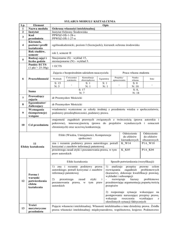 Lp. 1 2 3 4 5 Element Nazwa modułu Instytut Kod przedmiotu Kierunek, poziom i profil kształcenia Rok studiów, semestr Rodzaj zajęć i liczba godzin Punkty ECTS (1 pkt = 25-30g) SYLABUS MODUŁU KSZTAŁCENIA Opis Ochrona własności intelektualnej Instytut Ochrony Środowiska PPWSZ-OŚ-1-28-s PPWSZ-OŚ-1-27-n ogólnoakademicki, poziom I (licencjacki), kierunek ochrona środowiska rok I, semestr II Stacjonarne (S) - wykład 15, niestacjonarne (N) - wykład 5. 1 ECTS Zajęcia z bezpośrednim udziałem nauczyciela 6 Pracochłonność Suma 7 8 9 10 Prowadzący zajęcia Egzaminator/ Zaliczający Wymagania (kompetencje) wstępne Cel przedmiotu Wykłady Ćwiczenia/ seminaria Konsultacje obowiązkowe S: 15 N: 5 - S: 1 N: 1 Praca własna studenta Projekty/ opracowania Egzaminy S: 1 N: 1 12 Forma i warunki potwierdzenia efektu kształcenia S: 8 N: 18 S: 8, N: 18 - S: 17 N: 7 Inne - dr Przemysław Mościcki dr Przemysław Mościcki wiadomości wyniesione ze szkoły średniej z przedmiotu wiedza o społeczeństwie, podstawy przedsiębiorczości, podstawy prawa. znajomość zagadnień prawnych związanych z twórczością (prawa autorskie i pokrewne), innowacyjnością (prawa do projektów wynalazczych i oznaczeń chronionych) oraz uczciwą konkurencją Efekt (Wiedza, Umiejętności, Kompetencje społeczne) 11 Efekty kształcenia Nauka własna zna i rozumie podstawy prawa autorskiego; potrafi korzystać z zasobów informacji patentowej przestrzega zasad etyki i poszanowania prawa, w tym praw autorskich Odniesienie do efektów kierunkowych K_W14 Odniesienie do efektów obszarowych P1A_W10 K_K05 P1A_K04 Efekt kształcenia Sposób potwierdzenia (weryfikacji) 1) zna i rozumie podstawy prawa autorskiego; potrafi korzystać z zasobów informacji patentowej 1) analizuje przepisy prawne celem rozwiązania zagadnień problemowych (kazusów), dokonuje kwalifikacji prawnej, wykładni i subsumpcji rozwiązuje kazusy problemowe przedstawiając argumentację popartą treścią przepisów 2) przestrzega zasad poszanowania prawa, w autorskich etyki i tym praw 2) rozpoznaje sytuacje wskazujące na postępowanie naruszające przepisy prawa, wskazuje roszczenia wynikające z określonych sytuacji faktycznych 13 Treści merytoryczne przedmiotu Pojęcie własności intelektualnej. Własność intelektualna a inne dziedziny prawa. Źródła prawa własności intelektualnej: międzynarodowe, wspólnotowe, krajowe. Podstawowe zagadnienia z zakresu prawa autorskiego: Przedmiot i podmioty prawa autorskiego. Autorskie prawa osobiste i autorskie prawa majątkowe. Obrót prawami autorskimi. Odpowiedzialność cywilna i karna za naruszenie praw autorskich. Przedmioty praw własności przemysłowej. Prawa ochronne własności przemysłowej: ich podmiot, treść, sposób i tryb uzyskiwania ochrony. Obrót prawami własności przemysłowej. Problematyka nieuczciwej konkurencji. Organy państwa w zakresie ochrony własności intelektualnej i nieuczciwej konkurencji. 14 Wykaz literatury podstawowej 15 Wykaz literatury uzupełniającej (pomocniczej) Załucki M. 2010, Prawo własności intelektualnej. Repetytorium. Difin, Warszawa Barta J., Markiewicz R. 2008, Prawo autorskie i prawa pokrewne. Wolters Kluwer, Warszawa Golat R. 2010, Prawo autorskie i prawa pokrewne. C.H.Beck, Warszawa Szewc A., Jyż. G. 2003, Prawo własności przemysłowej. C.H.Beck, Warszawa