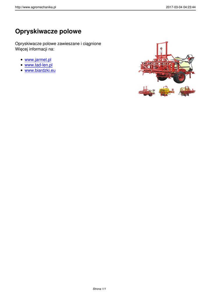 http://www.agromechanika.pl 2017-03-04 04:23:44 Opryskiwacze polowe Opryskiwacze polowe zawieszane i ciągnione Więcej informacji na: www.jarmet.pl www.tad-len.pl www.biardzki.eu Strona 1/1