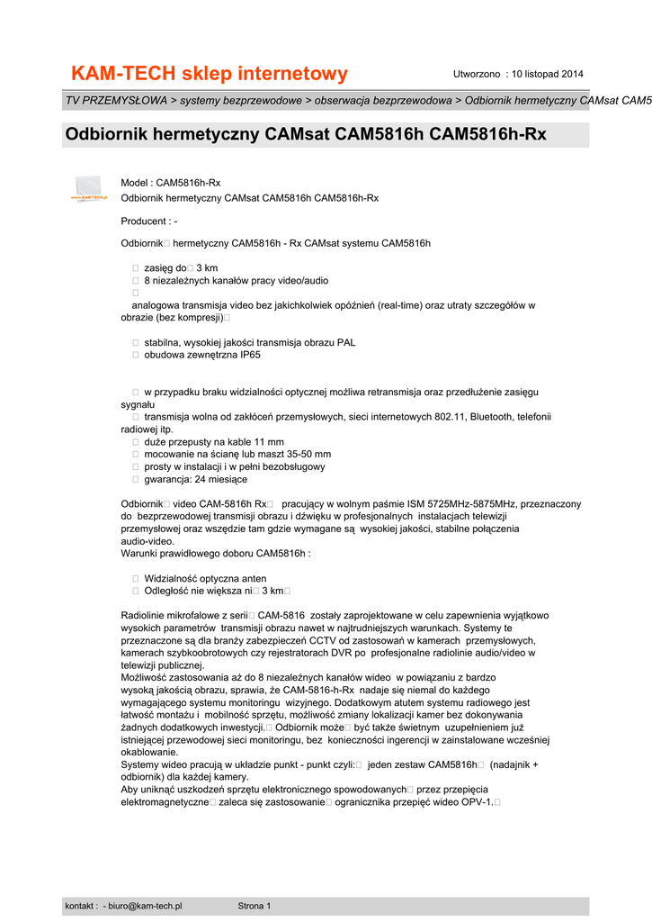 KAM-TECH sklep internetowy Utworzono : 10 listopad 2014 TV PRZEMYSŁOWA > systemy bezprzewodowe > obserwacja bezprzewodowa > Odbiornik hermetyczny CAMsat CAM5 Odbiornik hermetyczny CAMsat CAM5816h CAM5816h-Rx Model : CAM5816h-Rx Odbiornik hermetyczny CAMsat CAM5816h CAM5816h-Rx Producent : Odbiornik�hermetyczny CAM5816h - Rx CAMsat systemu CAM5816h � zasięg do�3 km � 8 niezależnych kanałów pracy video/audio � analogowa transmisja video bez jakichkolwiek opóźnień (real-time) oraz utraty szczegółów w obrazie (bez kompresji)� � stabilna, wysokiej jakości transmisja obrazu PAL � obudowa zewnętrzna IP65 � w przypadku braku widzialności optycznej możliwa retransmisja oraz przedłużenie zasięgu sygnału � transmisja wolna od zakłóceń przemysłowych, sieci internetowych 802.11, Bluetooth, telefonii radiowej itp. � duże przepusty na kable 11 mm � mocowanie na ścianę lub maszt 35-50 mm � prosty w instalacji i w pełni bezobsługowy � gwarancja: 24 miesiące Odbiornik�video CAM-5816h Rx� pracujący w wolnym paśmie ISM 5725MHz-5875MHz, przeznaczony do bezprzewodowej transmisji obrazu i dźwięku w profesjonalnych instalacjach telewizji przemysłowej oraz wszędzie tam gdzie wymagane są wysokiej jakości, stabilne połączenia audio-video. Warunki prawidłowego doboru CAM5816h : � Widzialność optyczna anten � Odległość nie większa ni�3 km� Radiolinie mikrofalowe z serii�CAM-5816 zostały zaprojektowane w celu zapewnienia wyjątkowo wysokich parametrów transmisji obrazu nawet w najtrudniejszych warunkach. Systemy te przeznaczone są dla branży zabezpieczeń CCTV od zastosowań w kamerach przemysłowych, kamerach szybkoobrotowych czy rejestratorach DVR po profesjonalne radiolinie audio/video w telewizji publicznej. Możliwość zastosowania aż do 8 niezależnych kanałów wideo w powiązaniu z bardzo wysoką jakością obrazu, sprawia, że CAM-5816-h-Rx nadaje się niemal do każdego wymagającego systemu monitoringu wizyjnego. Dodatkowym atutem systemu radiowego jest łatwość montażu i mobilność sprzętu, możliwość zmiany lokalizacji kamer bez dokonywania żadnych dodatkowych inwestycji.�Odbiornik może�być także świetnym uzupełnieniem już istniejącej przewodowej sieci monitoringu, bez konieczności ingerencji w zainstalowane wcześniej okablowanie. Systemy wideo pracują w układzie punkt - punkt czyli:� jeden zestaw CAM5816h� (nadajnik + odbiornik) dla każdej kamery. Aby uniknąć uszkodzeń sprzętu elektronicznego spowodowanych�przez przepięcia elektromagnetyczne�zaleca się zastosowanie�ogranicznika przepięć wideo OPV-1.� kontakt : - [email protected] Strona 1 KAM-TECH sklep internetowy Utworzono : 10 listopad 2014 TV PRZEMYSŁOWA > systemy bezprzewodowe > obserwacja bezprzewodowa > Odbiornik hermetyczny CAMsat CAM5 Odbiornik hermetyczny CAMsat CAM5816h CAM5816h-Rx Dane Techniczne Częstotliwość pracy od 5725MHz do 5875MHz Moc <25mW; 14 dBm Czułość odbiornika - 85 dBM Impedancja 50 Ohm Modulacja FM Ilość kanałów 8 (wybierane na stałe) Format video PAL lub NTSC Złącza video BNC (75 Ohm) Audio BNC Stereo (600 Ohm , 1 Volt p-p) Pasmo przen. dźwięku 30Hz do 15kHz Zasilanie 9 - 14V / 500mA DC Temperatura pracy -20 - 55C kontakt : - [email protected] Strona 2 KAM-TECH sklep internetowy Utworzono : 10 listopad 2014 TV PRZEMYSŁOWA > systemy bezprzewodowe > obserwacja bezprzewodowa > Odbiornik hermetyczny CAMsat CAM5 Odbiornik hermetyczny CAMsat CAM5816h CAM5816h-Rx Wymiary Tx: 149x103x56 Cena : 528,90 zł Brutto ( 430,00 zł Netto) Dostępność: Produkt dostępny w naszym sklepie od 03 listopad 2010 kontakt : - [email protected] Strona 3