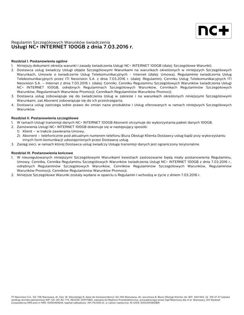 Regulamin Szczegółowych Warunków świadczenia Usługi NC+ INTERNET 100GB z dnia 7.03.2016 r. Rozdział I. Postanowienia ogólne 1. Niniejszy dokument określa warunki i zasady świadczenia Usługi NC+ INTERNET 100GB (dalej: Szczegółowe Warunki). 2. Dostawca usług świadczy Usługi objęte Szczegółowymi Warunkami na warunkach określonych w niniejszych Szczegółowych Warunkach, Umowie o świadczenie Usług Telekomunikacyjnych - Internet (dalej: Umowa), Regulaminie świadczenia Usług Telekomunikacyjnych przez ITI Neovision S.A. z dnia 7.03.2016 r. (dalej: Regulamin), Cenniku Usług Telekomunikacyjnych ITI Neovision S.A. – Internet z dnia 7.03.2016 r. (dalej: Cennik), Cenniku Regulaminu Szczegółowych Warunków świadczenia Usługi NC+ INTERNET 100GB, odrębnych Regulaminach Szczegółowych Warunków, Cennikach Regulaminów Szczegółowych Warunków, Regulaminach Warunków Promocji, Cennikach Regulaminów Warunków Promocji. 3. Dostawca usług zobowiązuje się do świadczenia Usług w zakresie i na warunkach określonych niniejszymi Szczegółowymi Warunkami, zaś Abonent zobowiązuje się do ich przestrzegania. 4. Dostawca usług zastrzega sobie prawo do zmian nazw produktów i Usług oferowanych w ramach niniejszych Szczegółowych Warunków. Rozdział II. Postanowienia szczegółowe 1. W ramach Usługi transmisji danych NC+ INTERNET 100GB Abonent otrzymuje do wykorzystania pakiet danych 100GB. 2. Zamówienia Usługi NC+ INTERNET 100GB dokonuje się w następujący sposób: 1) Klient – w trakcie zawierania Umowy, 2) Abonent – telefonicznie pod aktualnym numerem telefonu Biura Obsługi Klienta Dostawcy usług bądź przy wykorzystaniu innych form komunikacji udostępnionych przez Dostawcę usług. 3. Zasięg sieci, w ramach której Dostawca usług świadczy Usługę transmisji danych jest ograniczony terytorialnie. Rozdział III. Postanowienia końcowe 1. W nieuregulowanych niniejszymi Szczegółowymi Warunkami kwestiach zastosowanie będą miały postanowienia Regulaminu, Umowy, Cennika, Cennika Regulaminu Szczegółowych Warunków świadczenia Usługi NC+ INTERNET 100GB z dnia 7.03.2016 r., odrębnych Regulaminów Szczegółowych Warunków, Cenników Regulaminów Szczegółowych Warunków, Regulaminów Warunków Promocji, Cenników Regulaminów Warunków Promocji. 2. Niniejsze Szczegółowe Warunki zostały wydane w oparciu o Regulamin i wchodzą w życie z dniem 7.03.2016 r. ITI Neovision S.A., 02-758 Warszawa, Al. Gen. W. Sikorskiego 9, dane do korespondencji: 02-100 Warszawa, skr. pocztowa 8, Biuro Obsługi Klienta: tel. 801 044 944, 22 310 47 47 (opłata według cennika operatorów) NIP: 521-00-82-774, REGON: 010175861, wpisana do Rejestru Przedsiębiorców, prowadzonego przez Sąd Rejonowy dla m.st. Warszawy, XIII Wydział Gospodarczy KRS pod nr KRS: 0000469644, kapitał zakładowy: 441.176.000 zł, w całości wpłacony, Nr GIOŚ: E0012413WZBW. Cennik Regulaminu Szczegółowych Warunków świadczenia Usługi NC+ INTERNET 100GB z dnia 7.03.2016 r. Zestawienie Opłat dla produktów i Usług świadczonych przez ITI Neovision S.A., określonych w Regulaminie Szczegółowych Warunków świadczenia Usługi NC+ INTERNET 100GB z dnia 7.03.2016 r. 1. Wszystkie Opłaty określone w niniejszym Cenniku Regulaminu Szczegółowych Warunków są cenami brutto w PLN (zawierają wynikający z przepisów prawa podatek od towarów i usług VAT. Na dzień 7.03.2016 r. w Polsce stawka podatku VAT dla usług objętych niniejszym Cennikiem wynosi 23%). Tabela 1 – Opłaty Abonament miesięczny Usługa NC+ INTERNET 100GB* Okres oznaczony Umowy Okres nieoznaczony Umowy 105 zł *Limit danych przyznawany na każdy Okres Rozliczeniowy. W przypadku Aktywacji Usługi dokonanej w trakcie Okresu Rozliczeniowego limit danych przyznawany jest proporcjonalnie do liczby dni pozostałych do końca Okresu Rozliczeniowego, w którym Usługa została aktywowana. 2. 3. 4. 5. 6. 7. Dostawca usług zastrzega sobie prawo wprowadzenia Opłat za korzystanie z Usługi NC+ INTERNET 100GB innych niż określone w Tabeli 1, uregulowanych w odrębnych Regulaminach Szczegółowych Warunków, Cennikach Regulaminów Szczegółowych Warunków, Regulaminach Warunków Promocji, Cennikach Regulaminów Warunków Promocji. W przypadku Aktywacji Usługi dokonanej w trakcie Okresu Rozliczeniowego Abonament naliczany jest proporcjonalnie do liczby dni pozostałych do końca Okresu Rozliczeniowego, w którym Usługa została aktywowana. Po wykorzystaniu limitu danych zawartego w Usłudze NC+ INTERNET 100GB, Usługa transmisji danych jest wyłączana, aż do momentu rozpoczęcia kolejnego Okresu Rozliczeniowego. W przypadku opisanym w ustępie 4. powyżej Abonent ma możliwość skorzystania z Usług transmisji danych opisanych w odrębnych Regulaminach Szczegółowych Warunków, Cennikach Regulaminów Szczegółowych Warunków. Dane z Usługi NC+ INTERNET 100GB, niewykorzystane w danym Okresie Rozliczeniowym, nie przechodzą na kolejny Okres Rozliczeniowy, a ich wartość nie podlega zwrotowi. Zużycie danych naliczane jest co 1 kB. ITI Neovision S.A., 02-758 Warszawa, Al. Gen. W. Sikorskiego 9, dane do korespondencji: 02-100 Warszawa, skr. pocztowa 8, Biuro Obsługi Klienta: tel. 801 044 944, 22 310 47 47 (opłata według cennika operatorów) NIP: 521-00-82-774, REGON: 010175861, wpisana do Rejestru Przedsiębiorców, prowadzonego przez Sąd Rejonowy dla m.st. Warszawy, XIII Wydział Gospodarczy KRS pod nr KRS: 0000469644, kapitał zakładowy: 441.176.000 zł, w całości wpłacony, Nr GIOŚ: E0012413WZBW.