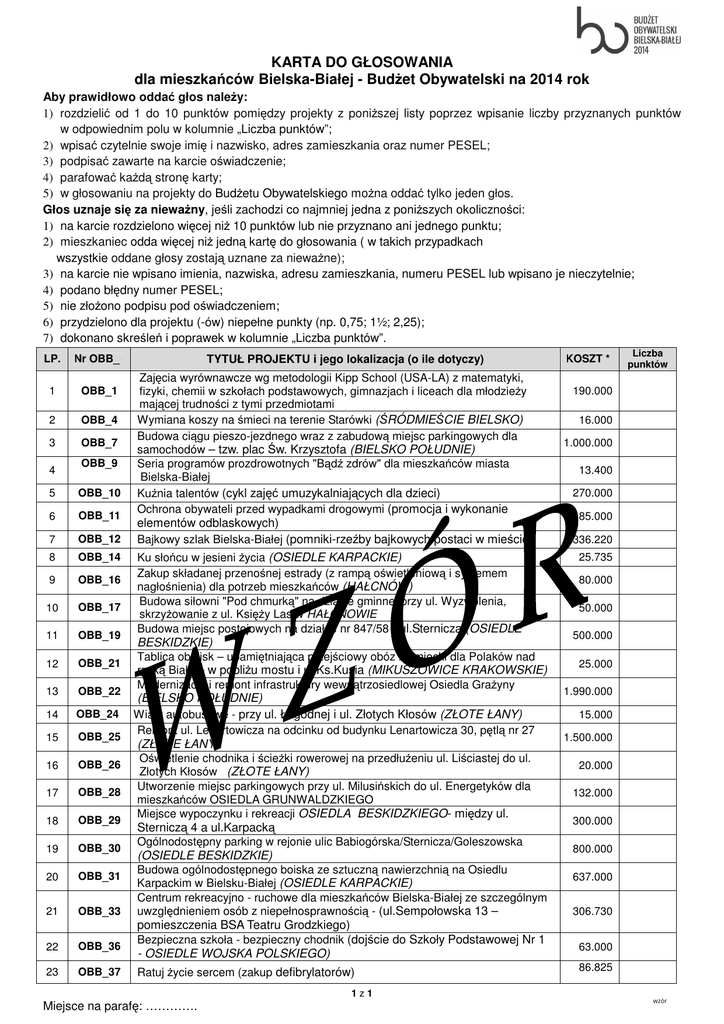 KARTA DO GŁOSOWANIA dla mieszkańców Bielska-Białej - BudŜet Obywatelski na 2014 rok Aby prawidłowo oddać głos naleŜy: 1) rozdzielić od 1 do 10 punktów pomiędzy projekty z poniŜszej listy poprzez wpisanie liczby przyznanych punktów w odpowiednim polu w kolumnie „Liczba punktów”; 2) wpisać czytelnie swoje imię i nazwisko, adres zamieszkania oraz numer PESEL; 3) podpisać zawarte na karcie oświadczenie; 4) parafować kaŜdą stronę karty; 5) w głosowaniu na projekty do BudŜetu Obywatelskiego moŜna oddać tylko jeden głos. Głos uznaje się za niewaŜny, jeśli zachodzi co najmniej jedna z poniŜszych okoliczności: 1) na karcie rozdzielono więcej niŜ 10 punktów lub nie przyznano ani jednego punktu; 2) mieszkaniec odda więcej niŜ jedną kartę do głosowania ( w takich przypadkach wszystkie oddane głosy zostają uznane za niewaŜne); 3) na karcie nie wpisano imienia, nazwiska, adresu zamieszkania, numeru PESEL lub wpisano je nieczytelnie; 4) podano błędny numer PESEL; 5) nie złoŜono podpisu pod oświadczeniem; 6) przydzielono dla projektu (-ów) niepełne punkty (np. 0,75; 1½; 2,25); 7) dokonano skreśleń i poprawek w kolumnie „Liczba punktów”. LP. Nr OBB_ 1 OBB_1 2 OBB_4 3 OBB_7 4 OBB_9 5 OBB_10 6 OBB_11 7 OBB_12 8 OBB_14 9 OBB_16 10 OBB_17 11 OBB_19 12 OBB_21 13 OBB_22 14 OBB_24 15 OBB_25 16 OBB_26 17 OBB_28 18 OBB_29 19 OBB_30 20 OBB_31 21 OBB_33 22 OBB_36 23 OBB_37 TYTUŁ PROJEKTU i jego lokalizacja (o ile dotyczy) Zajęcia wyrównawcze wg metodologii Kipp School (USA-LA) z matematyki, fizyki, chemii w szkołach podstawowych, gimnazjach i liceach dla młodzieŜy mającej trudności z tymi przedmiotami Wymiana koszy na śmieci na terenie Starówki (ŚRÓDMIEŚCIE BIELSKO) Budowa ciągu pieszo-jezdnego wraz z zabudową miejsc parkingowych dla samochodów – tzw. plac Św. Krzysztofa (BIELSKO POŁUDNIE) Seria programów prozdrowotnych "Bądź zdrów" dla mieszkańców miasta Bielska-Białej Kuźnia talentów (cykl zajęć umuzykalniających dla dzieci) Ochrona obywateli przed wypadkami drogowymi (promocja i wykonanie elementów odblaskowych) Bajkowy szlak Bielska-Białej (pomniki-rzeźby bajkowych postaci w mieście) Ku słońcu w jesieni Ŝycia (OSIEDLE KARPACKIE) Zakup składanej przenośnej estrady (z rampą oświetleniową i systemem nagłośnienia) dla potrzeb mieszkańców (HAŁCNÓW) Budowa siłowni "Pod chmurką" na działce gminnej przy ul. Wyzwolenia, skrzyŜowanie z ul. KsięŜy Las w HAŁCNOWIE Budowa miejsc postojowych na działce nr 847/58 - ul.Sternicza (OSIEDLE BESKIDZKIE) Tablica obelisk – upamiętniająca przejściowy obóz niemiecki dla Polaków nad rzeką Białą – w pobliŜu mostu i ul.Ks.Kusia (MIKUSZOWICE KRAKOWSKIE) Modernizacja i remont infrastruktury wewnątrzosiedlowej Osiedla GraŜyny (BIELSKO POŁUDNIE) Wiaty autobusowe - przy ul. Łagodnej i ul. Złotych Kłosów (ZŁOTE ŁANY) Remont ul. Lenartowicza na odcinku od budynku Lenartowicza 30, pętlą nr 27 (ZŁOTE ŁANY) Oświetlenie chodnika i ścieŜki rowerowej na przedłuŜeniu ul. Liściastej do ul. Złotych Kłosów (ZŁOTE ŁANY) Utworzenie miejsc parkingowych przy ul. Milusińskich do ul. Energetyków dla mieszkańców OSIEDLA GRUNWALDZKIEGO Miejsce wypoczynku i rekreacji OSIEDLA BESKIDZKIEGO- między ul. Sterniczą 4 a ul.Karpacką Ogólnodostępny parking w rejonie ulic Babiogórska/Sternicza/Goleszowska (OSIEDLE BESKIDZKIE) Budowa ogólnodostępnego boiska ze sztuczną nawierzchnią na Osiedlu Karpackim w Bielsku-Białej (OSIEDLE KARPACKIE) Centrum rekreacyjno - ruchowe dla mieszkańców Bielska-Białej ze szczególnym uwzględnieniem osób z niepełnosprawnością - (ul.Sempołowska 13 – pomieszczenia BSA Teatru Grodzkiego) Bezpieczna szkoła - bezpieczny chodnik (dojście do Szkoły Podstawowej Nr 1 - OSIEDLE WOJSKA POLSKIEGO) Ratuj Ŝycie sercem (zakup defibrylatorów) 1z1 Miejsce na parafę: …………. KOSZT * Liczba punktów 190.000 16.000 1.000.000 13.400 270.000 85.000 336.220 25.735 80.000 50.000 500.000 25.000 1.990.000 15.000 1.500.000 20.000 132.000 300.000 800.000 637.000 306.730 63.000 86.825 wzór 24 OBB_38 25 OBB_39 26 OBB_40 27 OBB_41 28 OBB_45 29 OBB_46 30 OBB_47 31 OBB_48 32 OBB_49 33 OBB_50 34 OBB_51 35 OBB_53 36 OBB_54 37 OBB_55 38 OBB_58 39 OBB_59 40 OBB_60 41 OBB_61 42 OBB_62 43 OBB_63 44 OBB_64 45 OBB_66 46 OBB_67 47 OBB_70 48 OBB_74 49 OBB_75 50 OBB_76 51 OBB_77 52 Obb_78 53 OBB_79 54 OBB_80 55 OBB_81 56 OBB_84 Spełniony senior – utworzenie Klubu ”Czas Seniora” na OSIEDLU WOJSKA POLSKIEGO Szacunek do przeszłości – „Narody, które tracą pamięć tracą Ŝycie” – uatrakcyjnienie obchodów świąt państwowych Budowa ogrodzonego i monitorowanego placu zabaw na Osiedlu Dygasińskiego w Bielsku-Białej (BIAŁA KRAKOWSKA) Rozwój Ŝycia kulturalnego w oparciu o wartości historyczne w WAPIENICY - wydanie monografii DoposaŜenie i rozbudowa boiska przy ul. Cyp rysowej (MIKUSZOWICE KRAKOWSKIE) Oświetlenie terenu przy kościele pw. Św.Barbary (MIKUSZOWICE KRAKOWSKIE) Wykonanie nowych schodów z ul. śywieckiej do ul. Zajęczej wzdłuŜ remizy OSP MIKUSZOWICE KRAKOWSKIE Rowerowy tor PUMP TRACK Wyzwolenia / Lwowska (BIAŁA WSCHÓD) Budowa chodnika na ulicy Barkowskiej (KOMOROWICE KRAKOWSKIE) Zagospodarowanie terenu w Małej Straconce przy dawnym kamieniołomie na potrzeby rekreacyjno-wypoczynkowe mieszkańców miasta (STRACONKA) Chodnik dla pieszych na ulicy Katowickiej na odcinku ul. Opłotek do ulicy Królewskiej (KOMOROWICE ŚLĄSKIE) Wiaty autobusowe na ulicy Katowickiej (2 wiaty) (KOMOROWICE ŚLĄSKIE) Remont dróg dojazdowych gminnych na terenie Os. Piastowskiego - ul. Piastów Śląskich i ul. Księcia Przemysława (OSIEDLE PIASTOWSKIE) Boisko sportowe 26 x 14 m do siatkówki i koszykówki międzynarodowej przy OSIEDLU PIASTOWSKIM Piknik ekologiczny 2014 w Bielsku-Białej ze zbiórką elektrośmieci – na Błoniach Bezpłatne zajęcia sportowo-rekreacyjne dla dzieci i młodzieŜy "Mini strefa aktywności Komor
