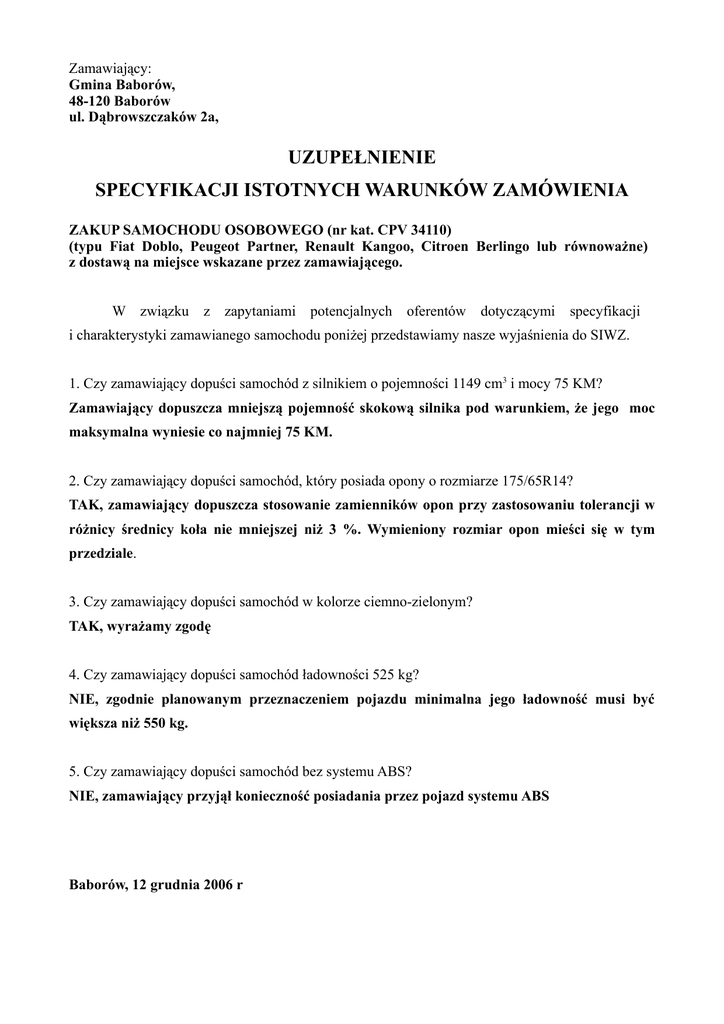 Zamawiający: Gmina Baborów, 48-120 Baborów ul. Dąbrowszczaków 2a, UZUPEŁNIENIE SPECYFIKACJI ISTOTNYCH WARUNKÓW ZAMÓWIENIA ZAKUP SAMOCHODU OSOBOWEGO (nr kat. CPV 34110) (typu Fiat Doblo, Peugeot Partner, Renault Kangoo, Citroen Berlingo lub równoważne) z dostawą na miejsce wskazane przez zamawiającego. W związku z zapytaniami potencjalnych oferentów dotyczącymi specyfikacji i charakterystyki zamawianego samochodu poniżej przedstawiamy nasze wyjaśnienia do SIWZ. 1. Czy zamawiający dopuści samochód z silnikiem o pojemności 1149 cm3 i mocy 75 KM? Zamawiający dopuszcza mniejszą pojemność skokową silnika pod warunkiem, że jego moc maksymalna wyniesie co najmniej 75 KM. 2. Czy zamawiający dopuści samochód, który posiada opony o rozmiarze 175/65R14? TAK, zamawiający dopuszcza stosowanie zamienników opon przy zastosowaniu tolerancji w różnicy średnicy koła nie mniejszej niż 3 %. Wymieniony rozmiar opon mieści się w tym przedziale. 3. Czy zamawiający dopuści samochód w kolorze ciemno-zielonym? TAK, wyrażamy zgodę 4. Czy zamawiający dopuści samochód ładowności 525 kg? NIE, zgodnie planowanym przeznaczeniem pojazdu minimalna jego ładowność musi być większa niż 550 kg. 5. Czy zamawiający dopuści samochód bez systemu ABS? NIE, zamawiający przyjął konieczność posiadania przez pojazd systemu ABS Baborów, 12 grudnia 2006 r