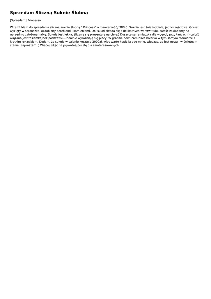Sprzedam Śliczną Suknię Ślubną [Sprzedam] Princessa Witam! Mam do sprzedania śliczną suknię ślubną " Princess" o rozmiarze36/ 38/40. Suknia jest śnieżnobiała, jednoczęściowa. Gorset wycięty w serduszko, ozdobiony perełkami i kamieniami. Dół sukni składa się z delikatnych warstw tiulu, całość zakładamy na uprzednio założoną halkę. Suknia jest lekka, ślicznie się prezentuje na ciele:) Doszyte są ramiączka dla wygody przy tańcach:) całość wiązana jest tasiemką bez podszewki...idealnie wyróżniają się plecy. W gratisie dorzucam białe bolerko w tym samym rozmiarze z krótkim rękawkiem. Dodam, że suknia w salonie kosztuje 2000zł. więc warto kupić ją ode mnie, wiedząc, że jest nowa i w świetnym stanie. Zapraszam :) Więcej zdjęć na prywatną pocztę dla zainteresowanych. Informacje dodatkowe Ilość 1 Stan Używany Rozmiar 38-40 Adres ogłoszenia http://todoslubu.pl/sprzedam-sliczna-suknie-slubna-,o644 Kontakt Mail: [email protected] Telefon: Lokalizacja , - (pl) Ogłoszenie dodano: 2017-01-06 12:10:08 Ogłoszenie wygasa: 2026-10-06 12:10:08 Powered by TCPDF (www.tcpdf.org)