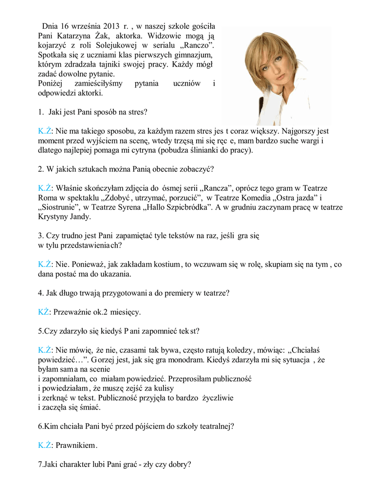 Dnia 16 września 2013 r. , w naszej szkole gościła Pani Katarzyna Żak, aktorka. Widzowie mogą ją kojarzyć z roli Solejukowej w serialu „Ranczo”. Spotkała się z uczniami klas pierwszych gimnazjum, którym zdradzała tajniki swojej pracy. Każdy mógł zadać dowolne pytanie. Poniżej zamieściłyśmy pytania uczniów i odpowiedzi aktorki. 1. Jaki jest Pani sposób na stres? K.Ż: Nie ma takiego sposobu, za każdym razem stres jes t coraz większy. Najgorszy jest moment przed wyjściem na scenę, wtedy trzęsą mi się ręc e, mam bardzo suche wargi i dlatego najlepiej pomaga mi cytryna (pobudza ślinianki do pracy). 2. W jakich sztukach można Panią obecnie zobaczyć? K.Ż: Właśnie skończyłam zdjęcia do ósmej serii „Rancza”, oprócz tego gram w Teatrze Roma w spektaklu „Zdobyć , utrzymać, porzucić”, w Teatrze Komedia „Ostra jazda” i „Siostrunie”, w Teatrze Syrena „Hallo Szpicbródka”. A w grudniu zaczynam pracę w teatrze Krystyny Jandy. 3. Czy trudno jest Pani zapamiętać tyle tekstów na raz, jeśli gra się w tylu przedstawieniach? K.Ż: Nie. Ponieważ, jak zakładam kostium , to wczuwam się w rolę, skupiam się na tym , co dana postać ma do ukazania. 4. Jak długo trwają przygotowani a do premiery w teatrze? KŻ: Przeważnie ok.2 miesięcy. 5.Czy zdarzyło się kiedyś P ani zapomnieć tek st? K.Ż: Nie mówię, że nie, czasami tak bywa, często ratują koledzy, mówiąc: „Chciałaś powiedzieć…”. G orzej jest, jak się gra monodram. Kiedyś zdarzyła mi się sytuacja , że byłam sam a na scenie i zapomniałam, co miałam powiedzieć. Przeprosiłam publiczność i powiedziałam , że muszę zejść za kulisy i zerknąć w tekst. Publiczność przyjęła to bardzo życzliwie i zaczęła się śmiać. 6.Kim chciała Pani być przed pójściem do szkoły teatralnej? K.Ż: Prawnikiem . 7.Jaki charakter lubi Pani grać - zły czy dobry? K.Ż: Aktor musi zagrać wszystko, ponieważ nie ma sztuki bez konfliktu, nawet w lekturach szkolnych, np. w „Antygonie”, musi być obecne dobro i zło. 8.Czy Pani mąż na potrzeby serialu ,,Miodowe lata” musiał nauczyć się prowadzić tramwaj? K.Ż: Tak, mój mąż uczył się tej umiejętności w zajezdni tramwajowej. W ymagano t ego, aby móc stworzyć czołówkę serialu. Ale podobno, nie je st to takie trudne, w szczególności, że obecne tramwaje napędzane są prądem. 9. Czy uczyła się Pani już wcześniej języka włoskiego? K.Ż: Niestety, nie. Języka włoskiego musiałam się nauczyć na potrzeby serialu, na szczę ście miałam lektorkę i konsultanta- rodowitego Włocha. To oni pracowali nade mną i udało im się. 10. Czy często robi Pani pierogi? K.Ż: Niestety, nie mam na to czasu. Wbrew pozorom sztuką jest zrobienie dobrych pierogów, dlatego przeważnie robię je na planie, i wtedy je cała ekipa. Chociaż robienia pierogów też musiałam się nauczyć na potrzeby ,,Rancza”. 11. Jak pracuje się z mieszkańcami Jeruzala , Latowicza i okolic? K.Ż: Bardzo dobrze, mieszkańcy są przesympatyczni. 12. Czy według Pani żywy teatr upadnie z powodu ekspansji kina ? K.Ż: Na razie ludzie są głodni kontaktu z aktorem ,,face to face” i dlatego śmiało - jako aktorka teatralna- patrzę w przyszłość. 13. Czy zgadza się pani z tym, że prawdziwe aktorstwo zabijają seriale? K.Ż: Ja uważam, że nie, ale zależy, jak kto do tego podchodzi. Moim zdaniem , ludzie nie umieją odróżnić prawdziwego serialu , jakim jest na przykład ,,Czas Hon oru”, który ma doskonałą fabułę, od telenoweli. 14. Jaką była Pani uczennicą? K.Ż: Szczerze? Lubiłam język polski, historię , lubiłam uczyć się języków, natomiast przedmioty ścisłe to nie był mój konik. Odpowiedzi nieautoryzowane Wysłuchały i opracowały: Marta Paczuska kl.3c Gim.1 Zosia Osińska kl.3c Gim.1