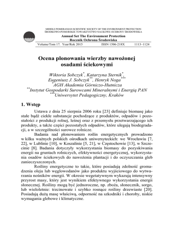 MIDDLE POMERANIAN SCIENTIFIC SOCIETY OF THE ENVIRONMENT PROTECTION ŚRODKOWO-POMORSKIE TOWARZYSTWO NAUKOWE OCHRONY ŚRODOWISKA Annual Set The Environment Protection Rocznik Ochrona Środowiska Volume/Tom 17. Year/Rok 2015 ISSN 1506-218X 1113–1124 Ocena plonowania wierzby nawożonej osadami ściekowymi Wiktoria Sobczyk*, Katarzyna Sternik*, Eugeniusz J. Sobczyk**, Henryk Noga*** * AGH Akademia Górniczo-Hutnicza ** Instytut Gospodarki Surowcami Mineralnymi i Energią PAN *** Uniwersytet Pedagogiczny, Kraków 1. Wstęp Ustawa z dnia 25 sierpnia 2006 roku [23] definiuje biomasę jako stałe bądź ciekłe substancje pochodzące z produktów, odpadów i pozostałości z produkcji rolnej, leśnej oraz z przemysłu przetwarzającego ich produkty, a także części pozostałych odpadów, które ulegają biodegradacji, a w szczególności surowce rolnicze. Badania nad plonowaniem roślin energetycznych prowadzono w kilku ważnych polskich ośrodkach uniwersyteckich: we Wrocławiu [7, 22], w Lublinie [10], w Koszalinie [5, 21], w Częstochowie [13], w Szczecinie [8]. Badania dotyczyły wykorzystania biomasy do pozyskiwania energii na gruntach rolniczych, efektywności energetycznej, wykorzystania osadów ściekowych do nawożenia plantacji i do oczyszczania gleb zanieczyszczonych. Rośliny energetyczne to takie, które posiadają zdolność gromadzenia oleju lub węglowodanów jako produktu wyjściowego do wytwarzania nośników energii. W okresie wegetatywnym wykazują intensywny przyrost masy, który jest wynikiem efektywnego wykorzystania energii słonecznej. Rośliny mogą być jednoroczne, np. zboża, słonecznik, sorgo, lub wieloletnie: trzcinowate i szybko rosnące rośliny drzewiaste [20]. Posiadają dużą masę właściwą, odporność na szkodniki i choroby, niskie wymagania glebowe i klimatyczne. 1114 Wiktoria Sobczyk i in. Wierzba krzewiasta (Salix viminalis) cieszy się dużym zainteresowaniem na krajowych plantacjach energetycznych. Jest rośliną wieloletnią, szybko rosnącą. Drewno pozyskane z plantacji wierzby energetycznej ma relatywnie wysokie ciepło spalania (19.3 MJ/kg), niską zawartość popiołu (1,3%) oraz śladowe ilości siarki (0,028% suchej masy) [22]. W porównaniu z drzewami leśnymi rośnie nawet do 14 razy szybciej, a z jednego hektara plantacji wierzby można uzyskać w ciągu roku 30–40 Mg masy drzewnej, czyli 15–20 Mg w stanie suchym, co odpowiada 10–13 Mg węgla [18]. Wierzba Salix może być użytkowana przez okres 25–30 lat. Dokumentem regulującym możliwość rolniczego wykorzystania komunalnych osadów ściekowych jest Rozporządzenie Ministra Środowiska z dnia 13 lipca 2010 r. w sprawie komunalnych osadów ściekowych [16]. Komunalne osady ściekowe mogą być przekazywane rolnikowi jedynie przez wytwórcę tych osadów. Stosowane są w rolnictwie do upraw rolnych, obrotu handlowego, rekultywacji: terenów rolnych, poeksploatacyjnych kopalni siarki, składowisk odpadów komunalnych [9], jak również do upraw roślin nie przeznaczonych do spożycia przez ludzi i zwierzęta. Wykorzystanie osadów ściekowych podlega wielu ograniczeniom. Muszą być poddane procesowi stabilizacji, a stosowane w rolnictwie nie mogą zawierać bakterii z rodzaju Salmonella oraz żywych jaj pasożytów jelitowych: Ascaris sp,. Trichuris sp., Toxocara sp. Zawartość metali ciężkich nie może przekraczać wartości określonych we wspomnianym Rozporządzeniu [16], przy czym koncentracja tych metali w suchej masie osadu ściekowego wykorzystywanego w rolnictwie oraz rekultywacji gruntów na cele rolne musi być znacząco mniejsza niż w przypadku wykorzystywania osadów do rekultywacji terenów na cele nierolne [13]. 2. Część badawcza 2.1. Teren i cel badań Badania polowe przeprowadzono w Leśnictwie Brodła (woj. małopolskie) na doświadczalnej plantacji wierzby energetycznej. Plantację tworzą nasadzenia ośmiu klonów wierzby Salix viminalis, oznaczonych numerami: 1007, 1015, 1033, 1051, 1052, 1054, 1056, 1059. Każdy z klonów sadzony był w rzędach o szerokości ok. 4 m i długości ok. Ocena plonowania wierzby nawożonej osadami ściekowymi 1115 10 m. Odległość między rzędami wynosiła 0,75 m, natomiast między kolumnami 0,33 m. Region położony jest w umiarkowanym piętrze klimatycznym: średnia temperatura roczna wynosi 8°C, okres wegetacyjny trwa ok. 220 dni, okres bez przymrozków ok. 150 dni. Suma opadów na tym terenie w roku badawczym VI 2013 – VI 2014 wynosiła około 770 mm·rok-1, więc znacząco przewyższała średnią krajową z lat 2001–2010: 719 mm·rok-1 [3]. Warunki wilgotnościowe w analizowanym roku były dobre dla rozwoju biomasy. Plantacja wierzby energetycznej usytuowana jest na nieużytku rolnym, gdzie występują gleby piaszczyste (podfrakcja: piasek drobny pdr, podgrupa granulometryczna: piasek gliniasty pg), klasy bonitacyjnej rolnej VI [14, 15]. Nie obserwowano nadmiernego zachwaszczenia, gdyż plantacja była pod stałą kontrolą pracowników Leśnictwa Brodła. Pielęgnacja gleby polegała na odchwaszczaniu powierzchni między sadzonkami, by miały one dostęp do światła i składników pokarmowych. Doświadczenia polowe trwały od czerwca 2013 roku do czerwca 2014 roku. Wstępnym celem badań była ocena plonowania pięciu klonów wierzby wiciowej Salix viminalis i wybranie klonów najlepiej plonujących (o największym rocznym przyroście masy). Zasadniczy cel doświadczenia to ocena skuteczności plonowania po zastosowaniu nawożenia wybranych klonów osadami ściekowymi. Do analizy ekologicznej wykorzystano parametry węgla kamiennego, pochodzącego z Zakładu Górniczego „Piekary”. 2.2. Przebieg badań Wcześniejsze badania jednego z autorów [11, 18, 19] wykazały duże przyrosty grubości pędów klonów oznaczonych numerami: 1051, 1052, 1054, 1056, 1059. Największe przyrosty odnotowano w przypadku szczepów: 1056, 1059. W czerwcu 2013 r. zmierzono wysokość oraz grubość (na wysokości 1 m) 2