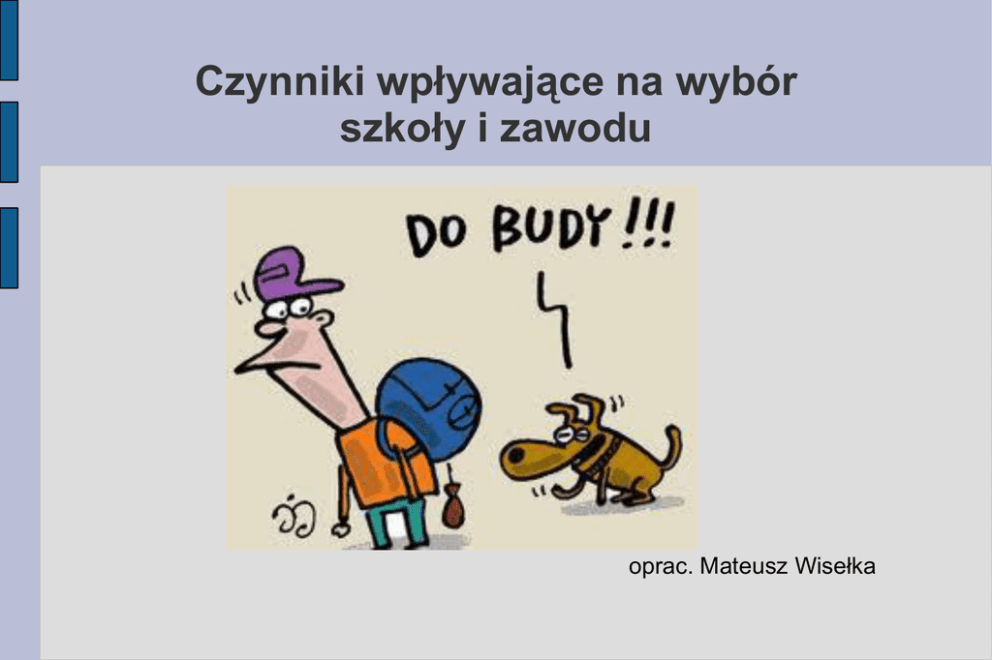 Czynniki wpływające na wybór szkoły i zawodu oprac. Mateusz Wisełka W ciągu życia młodzi ludzie są bardzo często stawiani w sytuacji wyboru lub konieczności podejmowania wielu różnorodnych decyzji, które mają wpływ dalsze życie. Aby właściwie wybrać drogę zawodową, należy wiedzieć, co wpływa na decyzje. Są to: czynniki wewnętrzne czynniki zewnętrzne Co oznaczają terminy – czynniki… wewnętrzne…? związane z rozwojem ogólnym i zawodowym człowieka oraz jego cechy indywidualne zewnętrzne…? sytuacyjne i wychowawcze związane z wyborem zawodu Do czynników wewnętrznych zalicza się: Stan fizyczny i zdrowie Zdolności i umiejętności Temperament Zainteresowania Stan fizyczny i zdrowie determinują wybory zawodowe – osoba z alergią skórną nie może pracować w fryzjerstwie, cukiernictwie czy kosmetologii, choroby kręgosłupa wykluczą: handel – np. w zawodzie sprzedawcy czy medycynie – np. w chirurgii Zdolności i umiejętności Stanowią potencjał, który właściwie wykorzystany i prawidłowo kształtowany stworzy szerokie możliwości zawodowe. Zdolności - w połączeniu z silnymi zainteresowaniami daną dziedziną i dobrą motywacją do jej zgłębiania - pomagają w osiągnięciu powodzenia w karierze zawodowej. Temperament Zespół dziedziczonych cech osobowości, zdeterminowanych genetycznie i ujawniających się już w pierwszym roku życia człowieka. To podstawa kształtowania się i rozwoju osobowości. Temperament cd. Osoba nieśmiała, bez zdolności przywódczych źle będzie się czuła na stanowiskach kierowniczych, wymagających zarządzania innymi. Z kolei ktoś energiczny i bardzo kreatywny – nie odnajdzie się w zadaniach monotonnych i rutynowych, np. w pracy urzędnika. Do czynników zewnętrznych zalicza się: Warunki finansowe Odległość pomiędzy domem a szkołą Rówieśnicy Rynek pracy System kształcenia Warunki finansowe determinują wybory - należy rozważyć, czy budżet domowy udźwignie koszty nie tylko pomocy dydaktycznych: książek i przyborów szkolnych, ale np. dojazdu do szkoły czy mieszkania w internacie. Odległość pomiędzy domem a szkołą Bliskość szkoły to atut, choć nie musi być kryterium decydującym. Dobrze, jeśli mamy dobrą szkołę pod nosem, zwłaszcza że dojazd wiąże się nie tylko ze stratą czasu, ale i z różnymi niebezpieczeństwami (wypadkami, napadami itp.). Dla dobra edukacji warto się jednak poświęcić :) Rówieśnicy Doświadczenie bycia w grupie, nawiązywania kontaktu, budowania relacji interpersonalnych, podejmowania ról społecznych jest bardzo istotne z punktu widzenia rozwijania umiejętności potrzebnych w pracy. Zdobyte w grupie doświadczenia warunkują postawy młodych ludzi do współpracy, kierowania, zarządzania, organizacji czasu. Należy jednak pamiętać, że wybór zawodu czy szkoły powinien być zgodny z własnymi zainteresowaniami, a nie naszych przyjaciół. Rodzina ma decydujący wpływ na rozwój dziecka i determinuje jego zawodową orientację. Pozycja, jaką zajmują rodzice, ich wykształcenie, styl życia, aspiracje, dążenia, zamożność, a nawet miejsce zamieszkania wyznaczają określoną pozycję dziecka. Wpływ rodziców może mieć jednak dwa oblicza: pozytywne i negatywne. Pozytywne Polega na udzielaniu porad, sugestii co do wyboru zawodu. Rodzice mogą wzmacniać dziecko w słuszności podjętej decyzji. Negatywne Polega na zniechęcaniu, pouczaniu dziecka, żeby unikało pewnych zawodów. Rodzice nie zawsze są obiektywni, często nierealnie oceniają uzdolnienia dzieci, a nawet doradzają im zawody, które przewyższają ich możliwości. Często chcą, aby dziecko realizowało ich niespełnione nadzieje. Można wyróżnić trzy grupy rodziców pomagających dzieciom w wyborze zawodu: Rodzice dyrektywni Rodzice partnerzy Rodzice liberalni Rodzice dyrektywni Uważają, że wiedzą najlepiej, jaki zawód powinno wybrać dziecko. Wybierają zawód za dziecko. Rodzice partnerzy Nawiązują dialog. Dziecko jest uznawane za jednostkę twórczą i samodzielną, która potrafi pokierować swoim życiem, ale w pewnych sytuacjach może potrzebować pomocy. Rodzice liberalni Nie wtrącają się, pozostawiają dziecku "wolną rękę„ i swobodę działania. Nie oceniają, nie kontrolują, nie pouczają, nie dają żadnych rad. Rynek pracy Znajomość aktualnych trendów na rynku pracy, czyli zapotrzebowania na konkretne zawody, w tym tzw. zawody przyszłości, umożliwi dokonanie wyboru, który może zagwarantować sukces zawodowy. patrz: http://www.kluczdokariery.pl/twoja-kariera/planowaniekariery/zawody-przyszlosci/art,2,zawody-i-kompetencje-2020roku.html System edukacji w Polsce Aby właściwie wybrać dalszą drogę nauki, należy poznać możliwości kształcenia, jakie gwarantuje Ci państwo. Źródła: wp.pl google.pl onet.pl