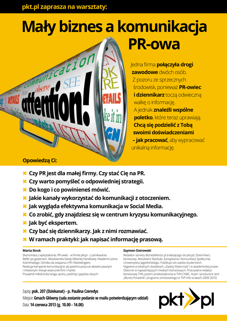pkt.pl zaprasza na warsztaty: Mały biznes a komunikacja PR-owa Jedna firma połączyła drogi zawodowe dwóch osób. Z pozoru ze sprzecznych środowisk, ponieważ PR-owiec i dziennikarz toczą odwieczną walkę o informację. A jednak znaleźli wspólne poletko, które teraz uprawiają. Chcą się podzielić z Tobą swoimi doświadczeniami – jak pracować, aby wypracować unikalną informację. Opowiedzą Ci: ✖ ✖ ✖ ✖ ✖ ✖ ✖ ✖ ✖ Czy PR jest dla małej firmy. Czy stać Cię na PR. Czy warto pomyśleć o odpowiedniej strategii. Do kogo i co powinieneś mówić. Jakie kanały wykorzystać do komunikacji z otoczeniem. Jak wygląda efektywna komunikacja w Social Media. Co zrobić, gdy znajdziesz się w centrum kryzysu komunikacyjnego. Jak być ekspertem. Czy bać się dziennikarzy. Jak z nimi rozmawiać. W ramach praktyki: jak napisać informację prasową. Marta Struk Szymon Ostrowski Ekonomista z wykształcenia, PR-owiec - w firmie pkt.pl - z zamiłowania. Belfer po godzinach. Absolwentka Szkoły Głównej Handlowej i Akademii Leona Koźmińskiego. Od kilku lat związana z PR i Marketingiem. Realizuje kampanie komunikacyjne. Jej żywioł to praca ze słowem pisanym i mówionym. Kreuje wizerunek firm i marek. Prywatnie miłośniczka tanga, sportu, podróży i języków obcych. Redaktor serwisu BiznesMentor.pl (należącego do pkt.pl). Dziennikarz biznesowy. Absolwent Wydziału Zarządzania i Komunikacji Społecznej Uniwersytetu Jagiellońskiego. Publikuje od czasów studenckich. Najpierw w lokalnych dodatkach „Gazety Wyborczej” i w akademickiej prasie. Obecnie w najważniejszych mediach biznesowych. Pracował w redakcji biznesowej TVN, potem przekształconej w TVN CNBC. Autor i producent serii „Biznes Poradnik”, programu emitowanego w TVP Info w latach 2009-2010. Zapisy: pok. 207 (Dziekanat) - p. Paulina Czeredys Miejsce: Gmach Główny (sala zostanie podanie w mailu potwierdzającym udział) Data: 14 czerwca 2013 (g. 10.00 - 14.00)