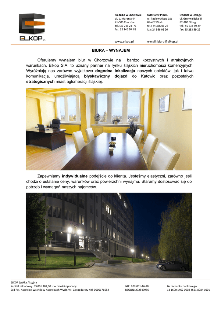 Siedziba w Chorzowie ul. J. Maronia 44 41-506 Chorzów tel.: 32 246 24 71 fax: 32 246 20 88 Oddział w Płocku ul. Padlewskiego 18c 09-402 Płock tel.: 24 366 06 26 fax: 24 366 06 26 www.elkop.pl e-mail: [email protected] Oddział w Elblągu ul. Grunwaldzka 2i 82-300 Elbląg tel.: 55 233 59 29 fax: 55 233 59 29 BIURA – WYNAJEM Oferujemy wynajem biur w Chorzowie na bardzo korzystnych i atrakcyjnych warunkach. Elkop S.A. to uznany partner na rynku śląskich nieruchomości komercyjnych. Wyróżniają nas zarówno wyjątkowo dogodna lokalizacja naszych obiektów, jak i łatwa komunikacja, umożliwiającą błyskawiczny dojazd do Katowic oraz pozostałych strategicznych miast aglomeracji śląskiej. Zapewniamy indywidualne podejście do klienta. Jesteśmy elastyczni, zarówno jeśli chodzi o ustalanie ceny, warunków oraz powierzchni wynajmu. Staramy dostosować się do potrzeb i wymagań naszych najemców. ELKOP Spółka Akcyjna Kapitał zakładowy: 53.001.102,00 zł w całości opłacony Sąd Rej. Katowice-Wschód w Katowicach Wydz. VIII Gospodarczy KRS 0000176582 NIP: 627-001-16-20 REGON: 272549956 Nr rachunku bankowego: 13 1600 1462 0008 4561 8284 1001 Siedziba w Chorzowie ul. J. Maronia 44 41-506 Chorzów tel.: 32 246 24 71 fax: 32 246 20 88 Oddział w Płocku ul. Padlewskiego 18c 09-402 Płock tel.: 24 366 06 26 fax: 24 366 06 26 www.elkop.pl e-mail: [email protected] Oddział w Elblągu ul. Grunwaldzka 2i 82-300 Elbląg tel.: 55 233 59 29 fax: 55 233 59 29 Aktualnie Elkop S.A. oferuje wynajem biur w dużym siedmiokondygnacyjnym budynku, z dwiema windami. Budynek położony jest przy ul. J. Maronia 44 (dzielnica Batory) w Chorzowie, na granicy miasta Katowice, ok. 10 minut od centrum miasta, oraz bezpośrednio połączony z głównymi węzłami komunikacyjnymi Śląska. Można stąd łatwo dojechać (ok. 2 km) do autostrady A4 oraz drogi wojewódzkiej nr 902 (DTŚ), a tędy na cały Śląsk, Polskę i Europę. Fot. Hallu głównego budynku (parter) ELKOP Spółka Akcyjna Kapitał zakładowy: 42.000.000,00 zł w całości opłacony Sąd Rej. Katowice-Wschód w Katowicach Wydz. VIII Gospodarczy KRS 0000176582 NIP: 627-001-16-20 REGON: 272549956 Nr rachunku bankowego: 13 1600 1462 0008 4561 8284 1001 Siedziba w Chorzowie ul. J. Maronia 44 41-506 Chorzów tel.: 32 246 24 71 fax: 32 246 20 88 Oddział w Płocku ul. Padlewskiego 18c 09-402 Płock tel.: 24 366 06 26 fax: 24 366 06 26 www.elkop.pl e-mail: [email protected] Oddział w Elblągu ul. Grunwaldzka 2i 82-300 Elbląg tel.: 55 233 59 29 fax: 55 233 59 29 Poniżej przykładowe rzuty, z zaznaczeniem dostępnych powierzchni. RZUT PARTERU Czynsz i opłaty eksploatacyjne: istnieje możliwość indywidualnego ustalenia czynszu, jego wysokość zależy także od okresu wynajmu oraz powierzchni biura, moduły biurowe już od 18 m pełna dowolność w kształtowaniu powierzchni biurowej od 18 m do 54 m (w zabudowie modułowej) oraz dwie powierzchnie 80 m2 i 100 m2 o podwyższonym standardzie na parterze budynku administracyjnego w ramach czynszu mieszczą się wszystkie koszty eksploatacyjne – z wyłączeniem kosztów energii elektrycznej dla powierzchni 80 m2 i 100 m2 na parterze (rozliczane wg wskazań licznika), infrastruktura teleinformatyczna, istnieje możliwość wynajęcia dodatkowej usługi sprzątania biur, przed zawarciem umowy wymagana jest kaucja gotówkowa, 2 2 2 Okres najmu: dowolny, ustalany indywidualnie z klientem Dodatkowe atuty: nowoczesny parking, z którego korzystać mogą najemcy oraz ich klienci, teren jest monitorowany (dla potrzeb Elkop S.A.), idealna lokalizacja, 2 km od autostrady A4 oraz drogi wojewódzkiej nr 902 (DTŚ). ELKOP Spółka Akcyjna Kapitał zakładowy: 42.000.000,00 zł w całości opłacony Sąd Rej. Katowice-Wschód w Katowicach Wydz. VIII Gospodarczy KRS 0000176582 NIP: 627-001-16-20 REGON: 272549956 Nr rachunku bankowego: 13 1600 1462 0008 4561 8284 1001