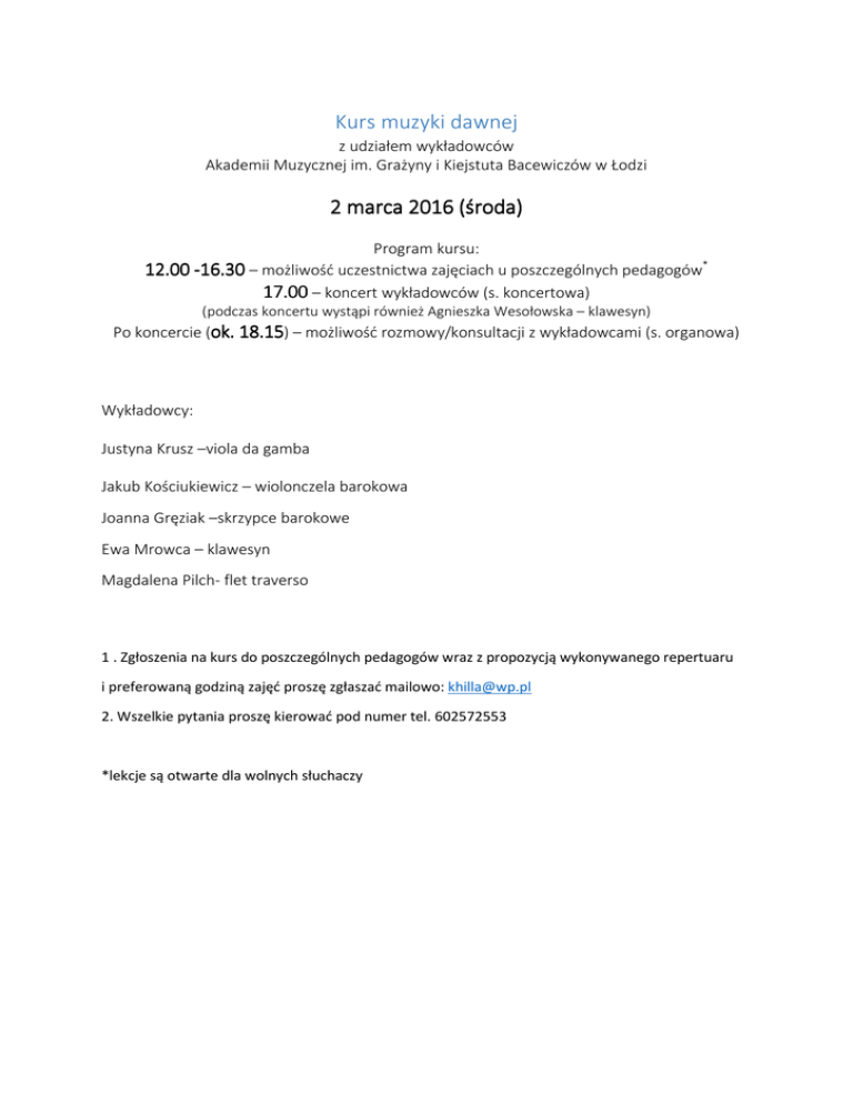 Kurs muzyki dawnej 2 marca 2016 2 marca 2016 (środa)