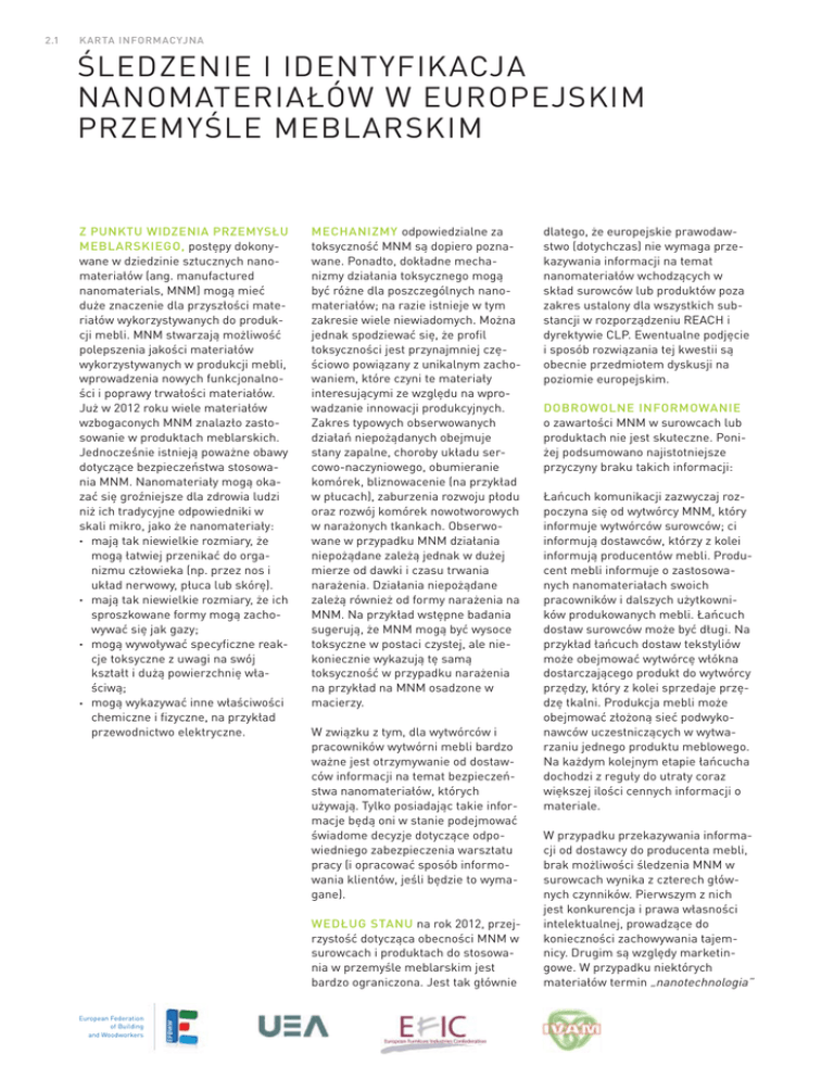 2.1 KARTA INFORMACYJNA ŚLEDZENIE I IDENTYFIKACJA NANOMATERIAŁÓW W EUROPEJSKIM PRZEMYŚLE MEBLARSKIM Z PUNKTU WIDZENIA PRZEMYSŁU MEBLARSKIEGO, postępy dokonywane w dziedzinie sztucznych nanomateriałów (ang. manufactured nanomaterials, MNM) mogą mieć duże znaczenie dla przyszłości materiałów wykorzystywanych do produkcji mebli. MNM stwarzają możliwość polepszenia jakości materiałów wykorzystywanych w produkcji mebli, wprowadzenia nowych funkcjonalności i poprawy trwałości materiałów. Już w 2012 roku wiele materiałów wzbogaconych MNM znalazło zastosowanie w produktach meblarskich. Jednocześnie istnieją poważne obawy dotyczące bezpieczeństwa stosowania MNM. Nanomateriały mogą okazać się groźniejsze dla zdrowia ludzi niż ich tradycyjne odpowiedniki w skali mikro, jako że nanomateriały: • mają tak niewielkie rozmiary, że mogą łatwiej przenikać do organizmu człowieka (np. przez nos i układ nerwowy, płuca lub skórę). • mają tak niewielkie rozmiary, że ich sproszkowane formy mogą zachowywać się jak gazy; • mogą wywoływać specyficzne reakcje toksyczne z uwagi na swój kształt i dużą powierzchnię właściwą; • mogą wykazywać inne właściwości chemiczne i fizyczne, na przykład przewodnictwo elektryczne. MECHANIZMY odpowiedzialne za toksyczność MNM są dopiero poznawane. Ponadto, dokładne mechanizmy działania toksycznego mogą być różne dla poszczególnych nanomateriałów; na razie istnieje w tym zakresie wiele niewiadomych. Można jednak spodziewać się, że profil toksyczności jest przynajmniej częściowo powiązany z unikalnym zachowaniem, które czyni te materiały interesującymi ze względu na wprowadzanie innowacji produkcyjnych. Zakres typowych obserwowanych działań niepożądanych obejmuje stany zapalne, choroby układu sercowo-naczyniowego, obumieranie komórek, bliznowacenie (na przykład w płucach), zaburzenia rozwoju płodu oraz rozwój komórek nowotworowych w narażonych tkankach. Obserwowane w przypadku MNM działania niepożądane zależą jednak w dużej mierze od dawki i czasu trwania narażenia. Działania niepożądane zależą również od formy narażenia na MNM. Na przykład wstępne badania sugerują, że MNM mogą być wysoce toksyczne w postaci czystej, ale niekoniecznie wykazują tę samą toksyczność w przypadku narażenia na przykład na MNM osadzone w macierzy. W związku z tym, dla wytwórców i pracowników wytwórni mebli bardzo ważne jest otrzymywanie od dostawców informacji na temat bezpieczeństwa nanomateriałów, których używają. Tylko posiadając takie informacje będą oni w stanie podejmować świadome decyzje dotyczące odpowiedniego zabezpieczenia warsztatu pracy (i opracować sposób informowania klientów, jeśli będzie to wymagane). WEDŁUG STANU na rok 2012, przejrzystość dotycząca obecności MNM w surowcach i produktach do stosowania w przemyśle meblarskim jest bardzo ograniczona. Jest tak głównie European Federation of Building and Woodworkers dlatego, że europejskie prawodawstwo (dotychczas) nie wymaga przekazywania informacji na temat nanomateriałów wchodzących w skład surowców lub produktów poza zakres ustalony dla wszystkich substancji w rozporządzeniu REACH i dyrektywie CLP. Ewentualne podjęcie i sposób rozwiązania tej kwestii są obecnie przedmiotem dyskusji na poziomie europejskim. DOBROWOLNE INFORMOWANIE o zawartości MNM w surowcach lub produktach nie jest skuteczne. Poniżej podsumowano najistotniejsze przyczyny braku takich informacji: Łańcuch komunikacji zazwyczaj rozpoczyna się od wytwórcy MNM, który informuje wytwórców surowców; ci informują dostawców, którzy z kolei informują producentów mebli. Producent mebli informuje o zastosowanych nanomateriałach swoich pracowników i dalszych użytkowników produkowanych mebli. Łańcuch dostaw surowców może być długi. Na przykład łańcuch dostaw tekstyliów może obejmować wytwórcę włókna dostarczającego produkt do wytwórcy przędzy, który z kolei sprzedaje przędzę tkalni. Produkcja mebli może obejmować złożoną sieć podwykonawców uczestniczących w wytwarzaniu jednego produktu meblowego. Na każdym kolejnym etapie łańcucha dochodzi z reguły do utraty coraz większej ilości cennych informacji o materiale. W przypadku przekazywania informacji od dostawcy do producenta mebli, brak możliwości śledzenia MNM w surowcach wynika z czterech głównych czynników. Pierwszym z nich jest konkurencja i prawa własności intelektualnej, prowadzące do konieczności zachowywania tajemnicy. Drugim są względy marketingowe. W przypadku niektórych materiałów termin „nanotechnologia” 2.2 Rycina 1. Przykład dobrej praktyki podczas napylania lakieru zawierającego MNM. Ściana z wentylacją próżniową, kombinezon Tyvek, rękawice nitrylowe, kask ze strumieniem powietrza z filtrami FFP3 skutecznie chronią pracownika przez lotnymi związkami organicznymi, a tym samym przed znajdującymi się w powietrzu MNM. napędza sprzedaż. Sugeruje się, że produkty takie zawierają MNM, choć może okazać się, że ich nie posiadają. W przypadku innych materiałów tego rodzaju argument jest mniej przekonujący. Takie produkty nie są więc „znakowane” jako zawierające nanomateriały. Tylko wąska liczba surowców i produktów jest poprawnie oznakowana i posiada konkretne informacje na temat zastosowanych nanomateriałów. Trzecim istotnym powodem ograniczającym zastosowanie MNM w surowcach jest społeczna debata na temat wątpliwości dotyczących bezpieczeństwa MNM. Zamiast jasno i wyraźnie formułować te wątpliwości, sam fakt ich istnienia jest często zachowywany w tajemnicy, aby „nie prowokować niepotrzebnych pytań”. Czwartym czynnikiem ograniczającym przepływ informacji jest niewiedza. Dostawcy materiałów często sami nie są dobrze poinformowani, w związku z czym mogą dostarczyć producentowi mebli bardzo niewiele informacji, 