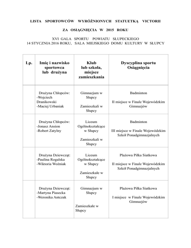 LISTA SPORTOWCÓW WYRÓŻNIONYCH STATUETKĄ VICTORII ZA OSIĄGNIĘCIA W 2015 ROKU XVI GALA SPORTU POWIATU SŁUPECKIEGO 14 STYCZNIA 2016 ROKU, SALA MIEJSKIEGO DOMU KULTURY W SŁUPCY Lp. Imię i nazwisko sportowca lub drużyna Drużyna Chłopców: -Wojciech Dranikowski -Maciej Urbaniak Drużyna Chłopców: -Jonasz Ansion -Robert Zatylny Klub lub szkoła, miejsce zamieszkania Dyscyplina sportu Osiągnięcia Gimnazjum w Słupcy Badminton Zamieszkali w Słupcy Liceum Ogólnokształcące w Słupcy II miejsce w Finale Wojewódzkim Gimnazjów Badminton III miejsce w Finale Wojewódzkim Szkół Ponadgimnazjalnych Zamieszkali w Słupcy Drużyna Dziewcząt: -Paulina Rogalska -Wiktoria Woźniak Liceum Ogólnokształcące w Słupcy Plażowa Piłka Siatkowa II miejsce w Finale Wojewódzkim Szkół Ponadgimnazjalnych Zamieszkałe w Słupcy Drużyna Dziewcząt: -Martyna Piasecka -Weronika Antczak Gimnazjum w Słupcy Plażowa Piłka Siatkowa I miejsce w Finale Wojewódzkim Gimnazjów Zamieszkałe w Słupcy Drużyna Dziewcząt: -Natalia Blejwas -Olga Kwaśny Gimnazjum w Słupcy Zamieszkałe w Słupcy Kacper Kajdan Szkoła Podstawowa w Wólce Zamieszkały w Młodziejewicach (Gmina Strzałkowo) Adam Król Zespół Szkół Ekonomicznych w Słupcy Zamieszkały w Słupcy Nikola Mrugalska Szkoła Podstawowa w Koszutach Zamieszkała w Żelazkowie (Gmina Słupca) Kamil Sikorski Eryk Skweres Badminton II miejsce w Finale Wojewódzkim Gimnazjów Piłka Nożna IV miejsce w Finale Wojewódzkim Turnieju o „Puchar Tymbarku” Biegi Ekstremalne Uczestnik Biegów Ekstremalnych Runmageddon Hardcore: Beskidy i Sopot. Uzyskał tytuł “Weterana Biegów Runmageddon” Lekka Atletyka II miejsce Indywidualnie w Finale Wojewódzkim Szkół Podstawowych w Czwórboju Lekkoatletycznym SKP MOS Słupca Piłka Nożna Zamieszkały w Woli Koszuckiej Parcele (Gmina Słupca) Reprezentant Kadry Wojewódzkiej Rocznika 2000 Pasjonaci Słupca Biegi Uliczne Zamieszkały w Słupcy III miejsce w Wielkopolskiej Lidze Biegowej Konrad Sroka Damian Ślugaj Daniel Tkaczyk Dominik Tkaczyk Marcin Walczak SKP MOS Słupca Zamieszkały w Koszutach Parcele (Gmina Słupca) Reprezentant Kadry Wojewódzkiej Rocznika 2000 MKS NEKLA Motocross Zamieszkały w Wilcznej (Gmina Słupca) V miejsce na Mistrzostwach Strefy Polski Zachodniej Juniorów AZS Politechnika Poznańska Koszykówka Zamieszkały w Słupcy V miejsce na Akademickich Mistrzostwach Polski Pierwszych Roczników MKK Gniezno Koszykówka Zamieszkały w Słupcy II miejsce w Wielkopolskiej Lidze Kadetów Gimnazjum w Słupcy Lekka Atletyka Zamieszkały w Słupcy Jakub Wiśniewski Piłka Nożna UKS KOPERNIK Słupca Zamieszkały w Słupcy III miejsce w Finale Wojewódzkim Gimnazjów w Indywidualnych Biegach Przełajowych Badminton I miejsce w Grze Podwójnej i III w Grze Pojedynczej na Mistrzostwach Okręgu Wielkopolskiego Młodzików Młodszych Mikołaj Wiśniewski UKS KOPERNIK Słupca Zamieszkały w Słupcy Drużyna Chłopców: -Jakub Panfil -Wiktor Kowalski -Adam Rumiński -Michał Błaszkowski -Szymon Głowacki -Bartosz Walczak Drużyna Chłopców: -Patryk Różański -Wiktor Kowalski -Kamil Pomorski -Mateusz Romecki -Adam Szymczak -Kacper Zywert -Piotr Kamiński -Tymoteusz Juszczak -Kacper Staśkiewicz -Hubert Błaszkowski Drużyna Dziewcząt: i Chłopców -Karina Błaszczak -Magdalena Figas -Klaudia Kuchcińska -Wiktor Kowalski -Mikołaj Kowalikowski -Łukasz Stojek UKS MOS CZARNI Ostrowite Zamieszkali w Gminie Ostrowite i Strzałkowie UKS MOS CZARNI Ostrowite Badminton I miejsce w Grze Pojedynczej na Mistrzostwach Okręgu Wielkopolskiego do lat 9 Piłka Siatkowa Udział w Finale Ogólnopolskim Turnieju Minisiatkówki Kinder + Sport Piłka Siatkowa Udział w Ćwierćfinale Mistrzostw Polski Kadetów Zamieszkali w Gminie Ostrowite i Strzałkowie Szkoła Podstawowa w Strzałkowie Zamieszkali w Gminie Strzałkowo Piłka Siatkowa XII miejsce w Finale Ogólnopolskim Turnieju „Orlik Volleymania” Drużyna Chłopców: -Wiktor Kowalski -Mikołaj Kowalikowski -Łukasz Stojek -Michał Moskalik -Alan Bryk -Rafał Maćkowiak -Jakub Ratajczyk -Szymon Litko -Szymon Górny -Oskar Gurgul Drużyna Chłopców Drużyna Kobiet Drużyna Męska Szkoła Podstawowa w Strzałkowie Zamieszkali w Gminie Strzałkowo Piłka siatkowa III miejsce w Finale Wojewódzkim Szkół Podstawowych SKP MOS Słupca Piłka Nożna Zamieszkali w Słupcy, w Gminach Lądek, Strzałkowo, Ostrowite, Słupca I miejsce w Lidze Trampkarzy Starszych Konińskiego Okręgowego Związku Piłki Nożnej OSP Lądek Sport Pożarniczy Zamieszkałe w Gminie Lądek XIV miejsce na Mistrzostwach Polski w Klasyfikacji Generalnej OSP Lądek Sport Pożarniczy Zamieszkali w Gminie Lądek XIV miejsce na Mistrzostwach Polski w Klasyfikacji Generalnej
