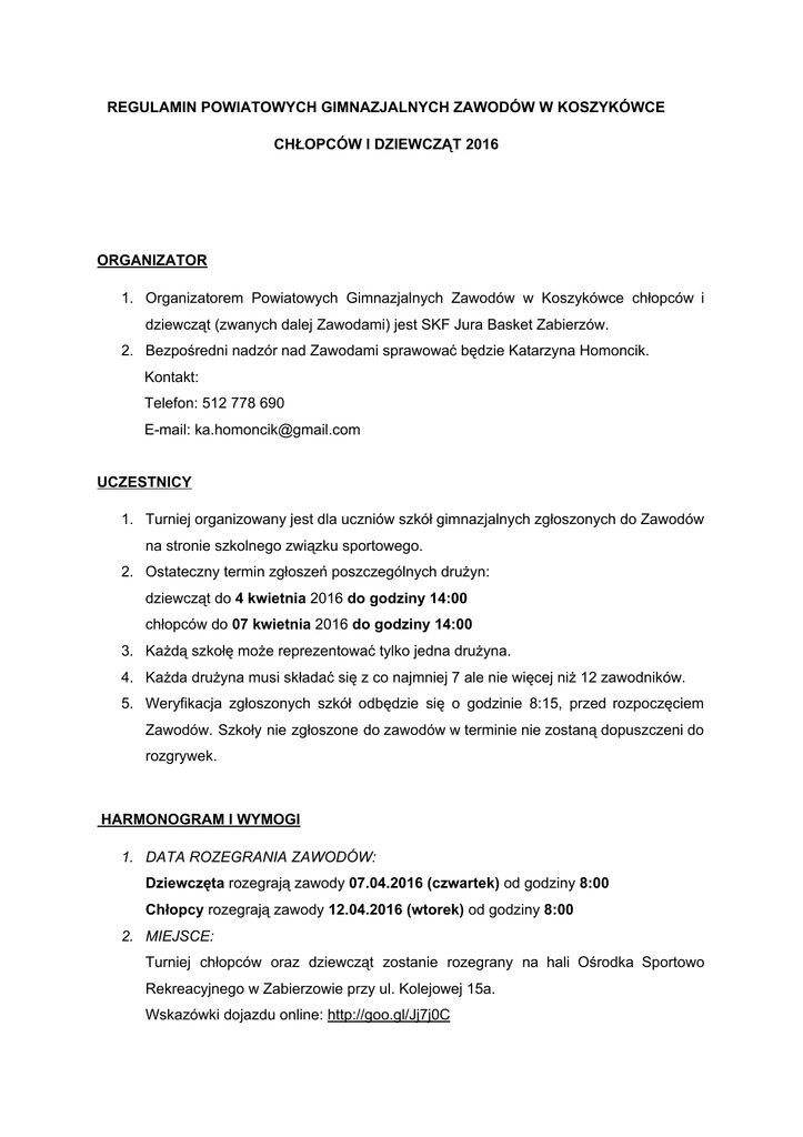 REGULAMIN POWIATOWYCH GIMNAZJALNYCH ZAWODÓW W KOSZYKÓWCE CHŁOPCÓW I DZIEWCZĄT 2016 ORGANIZATOR 1. Organizatorem Powiatowych Gimnazjalnych Zawodów w Koszykówce chłopców i dziewcząt (zwanych dalej Zawodami) jest SKF Jura Basket Zabierzów. 2. Bezpośredni nadzór nad Zawodami sprawować będzie Katarzyna Homoncik. Kontakt: Telefon: 512 778 690 Email: [email protected] UCZESTNICY 1. Turniej organizowany jest dla uczniów szkół gimnazjalnych zgłoszonych do Zawodów na stronie szkolnego związku sportowego. 2. Ostateczny termin zgłoszeń poszczególnych drużyn: dziewcząt do 4 kwietnia 2016 do godziny 14:00 chłopców do 07 kwietnia 2016 do godziny 14:00 3. Każdą szkołę może reprezentować tylko jedna drużyna. 4. Każda drużyna musi składać się z co najmniej 7 ale nie więcej niż 12 zawodników. 5. Weryfikacja zgłoszonych szkół odbędzie się o godzinie 8:15, przed rozpoczęciem Zawodów. Szkoły nie zgłoszone do zawodów w terminie nie zostaną dopuszczeni do rozgrywek. HARMONOGRAM I WYMOGI 1. DATA ROZEGRANIA ZAWODÓW: Dziewczęta rozegrają zawody 07.04.2016 (czwartek) od godziny 8:00 Chłopcy rozegrają zawody 12.04.2016 (wtorek) od godziny 8:00 2. MIEJSCE: Turniej chłopców oraz dziewcząt zostanie rozegrany na hali Ośrodka Sportowo Rekreacyjnego w Zabierzowie przy ul. Kolejowej 15a. Wskazówki dojazdu online: http://goo.gl/Jj7j0C 3. RAMOWY PLAN ZAWODÓW: 8:00 – przybycie drużyn 8:15 – weryfikacja szkół i losowanie kolejności meczy 8:30 – rozpoczęcie Zawodów Po ostatnim meczu nastąpi oficjalne zakończenie oraz wręczenie pamiątkowych pucharów i dyplomów. SCHEMAT I SYSTEM ZAWODÓW 1. Jeśli na Zawody przybędzie sześć lub więcej drużyn zawody zostaną rozegrane w dwóch grupach eliminacyjnych, z których zwycięzcy będą grali o pierwsze miejsce w Turnieju, a drugie miejsca z poszczególnych grup zagrają o miejsce trzecie. O kolejności rozegrania meczy i podziale na grupy zdecyduje losowanie przed rozpoczęciem Zawodów. 2. Jeśli na zawody przybędzie pięć lub mniej zespołów z danej kategorii turniej rozegrany zostanie systemem „każdy z każdym”. Kolejność rozegrania spotkań zostanie ustalona przed rozpoczęciem Zawodów. 3. Z wycięzcy obu Turniejów oprócz pamiątkowych pucharów i dyplomów otrzymują awans do kolejnego etapu rozgrywek szkolnych. Zawody rejonowe dziewcząt odbędą się: 22.04.2016 godz. 9.30 Bochnia – Hala ul. Poniatowskiego 32. Zawody rejonowe chłopców odbędą się 27.04.2016 godz. 9.30 Wieliczka SOLNE MIASTO ul. T. Kościuszki 15. PRZEPISY I CZAS GRY 1. W trakcie trwania turnieju obowiązywać będą oficjalne przepisy gry w koszykówkę FIBA. 2. Każdy mecz poprowadzony będzie przez dwóch sędziów boiskowych oraz jednego sędziego stolikowego odpowiedzialnego za zapis protokołu zawodów. 3. Mecz składać się będzie z 4 kwart 5 minut każda. Ewentualne dogrywki 3 minuty. 4. Czas zatrzymywany będzie tylko i wyłącznie w ostatniej minucie 4 kwarty lub dogrywki. 5. Każdemu trenerowi przysługuje jeden czas podczas kwarty. Niewykorzystany czas nie przechodzi na następną kwartę. 6. Pomiar czasu 24s i 14s należeć będzie do sędziów boiskowych. 7. Zawodnik zdyskwalifikowany przez sędziów w którymkolwiek ze swoich meczy, nie może rozegrać żadnego z kolejnych. POSTANOWIENIA KOŃCOWE Wszelkie zastrzeżenia i protesty będą rozpatrywane przez sędziów zawodów oraz organizatora. Od ich decyzji nie przewiduje się odwołań.