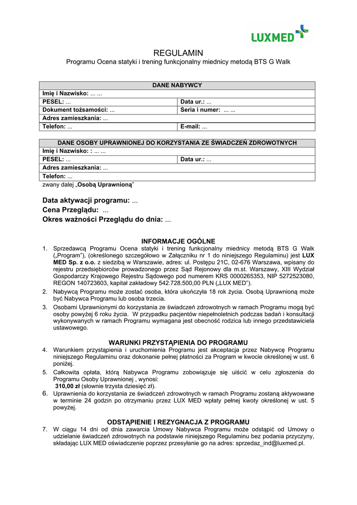 REGULAMIN Programu Ocena statyki i trening funkcjonalny miednicy metodą BTS G Walk DANE NABYWCY Imię i Nazwisko: ... ... PESEL: ... Dokument tożsamości: ... Adres zamieszkania: ... Telefon: ... Data ur.: ... Seria i numer: ... ... E-mail: ... DANE OSOBY UPRAWNIONEJ DO KORZYSTANIA ZE ŚWIADCZEŃ ZDROWOTNYCH Imię i Nazwisko: : ... ... PESEL: ... Data ur.: ... Adres zamieszkania: ... Telefon: ... zwany dalej „Osobą Uprawnioną” Data aktywacji programu: ... Cena Przeglądu: ... Okres ważności Przeglądu do dnia: ... INFORMACJE OGÓLNE 1. Sprzedawcą Programu Ocena statyki i trening funkcjonalny miednicy metodą BTS G Walk („Program”), (określonego szczegółowo w Załączniku nr 1 do niniejszego Regulaminu) jest LUX MED Sp. z o.o. z siedzibą w Warszawie, adres: ul. Postępu 21C, 02-676 Warszawa, wpisany do rejestru przedsiębiorców prowadzonego przez Sąd Rejonowy dla m.st. Warszawy, XIII Wydział Gospodarczy Krajowego Rejestru Sądowego pod numerem KRS 0000265353, NIP 5272523080, REGON 140723603, kapitał zakładowy 542.728.500,00 PLN („LUX MED”). 2. Nabywcą Programu może zostać osoba, która ukończyła 18 rok życia. Osobą Uprawnioną może być Nabywca Programu lub osoba trzecia. 3. Osobami Uprawnionymi do korzystania ze świadczeń zdrowotnych w ramach Programu mogą być osoby powyżej 6 roku życia. W przypadku pacjentów niepełnoletnich podczas badań i konsultacji wykonywanych w ramach Programu wymagana jest obecność rodzica lub innego przedstawiciela ustawowego. WARUNKI PRZYSTĄPIENIA DO PROGRAMU 4. Warunkiem przystąpienia i uruchomienia Programu jest akceptacja przez Nabywcę Programu niniejszego Regulaminu oraz dokonanie pełnej płatności za Program w kwocie określonej w ust. 6 poniżej. 5. Całkowita opłata, którą Nabywca Programu zobowiązuje się uiścić w celu zgłoszenia do Programu Osoby Uprawnionej , wynosi: 310,00 zł (słownie trzysta dziesięć zł). 6. Uprawnienia do korzystania ze świadczeń zdrowotnych w ramach Programu zostaną aktywowane w terminie 24 godzin po otrzymaniu przez LUX MED wpłaty pełnej kwoty określonej w ust. 5 powyżej. ODSTĄPIENIE I REZYGNACJA Z PROGRAMU 7. W ciągu 14 dni od dnia zawarcia Umowy Nabywca Programu może odstąpić od Umowy o udzielanie świadczeń zdrowotnych na podstawie niniejszego Regulaminu bez podania przyczyny, składając LUX MED oświadczenie poprzez przesyłanie go na adres: [email protected]. 8. Prawo odstąpienia od Umowy zawartej na odległość nie przysługuje Nabywcy Programu w wypadku rozpoczęcia świadczenia usług w ramach Programu, za zgodą Nabywcy, przed upływem 14 dni od dnia zawarcia Umowy. WARUNKI REALIZACJI PROGRAMU 9. Udzielanie świadczeń zdrowotnych w ramach Programu odbywa się w dedykowanej do Programu placówce LUX MED. przy ul. Domaniewskiej 41c w Warszawie w godzinach pracy tej placówki. 10. Warunkiem udzielenia świadczenia zdrowotnego w ramach Programu jest uprzednie uzgodnienie terminu jego wykonania poprzez skontaktowanie się z Call Center LUX MED. pod numerem 22 33 22 888. 11. Program Ocena statyki i trening funkcjonalny miednicy metodą BTS G Walk składa się z: a. szczegółowej oceny równowagi statycznej miednicy (badanie w statyce przeprowadzane przez fizjoterapeutę) oraz równowagi dynamicznej (badanie przeprowadzane za pomocą urządzenia BTS G-WALK), b. trzech indywidualnych treningów funkcjonalnych miednicy dostosowanych do wyników badań, których celem jest nauka utrzymywania równowagi statycznej miednicy, c. oceny efektów uzyskanych w trakcie cyklu treningowego – ponowne badania. 12. Świadczenia zdrowotne w ramach Programu należy zrealizować nie później niż w ciągu 3 miesięcy od dnia aktywowania uprawnień Osoby Uprawnionej do Programu. OŚWIADCZENIE NABYWCY 13. Nabywca (w rozumieniu Regulaminu Programu Ocena statyki i trening funkcjonalny miednicy metodą BTS G Walk poinformował Osobę Uprawnioną (w rozumieniu ww regulaminu) do korzystania z usług w ramach Programu (w rozumieniu ww regulaminu) o: 1. adresie siedziby i pełnej nazwie LUX MED Sp. z o.o. jako administratora danych tej Osoby przekazanych przez Nabywcę; 2. celu i zakresie zbierania przez LUX MED Sp. z o.o. danych, o których mowa w pkt 1) powyżej; 3. źródle danych, o których mowa w pkt 1 powyżej; 4. prawie dostępu Osoby Uprawnionej do treści swoich danych przetwarzanych przez LUX MED Sp. z o.o. jako administratora danych oraz prawie do ich poprawiania; 5. uprawnieniach wynikających z art. 32 ust. 1 pkt 7 i 8 Ustawy z dnia 2 sierpnia 1997 r. o ochronie danych osobowych („Ustawa”) tj. a) wniesienia, w przypadkach wymienionych w art. 23 ust. 1 pkt 4 i 5 Ustawy, pisemnego, umotywowanego żądania zaprzestania przetwarzania jej danych ze względu na jej szczególną sytuację, b) wniesienia sprzeciwu wobec przetwarzania jej danych w przypadkach, wymienionych w art. 23 ust. 1 pkt 4 i 5 Ustawy, gdy administrator danych zamierza je przetwarzać w celach marketingowych lub wobec przekazywania jej danych osobowych innemu administratorowi danych. 14. Nabywca oświadcza, iż posiada zgodę osoby wskazanej w Regulaminie Programu Ocena statyki i trening funkcjonalny miednicy metodą BTS G Walk jako Osoba Uprawniona do korzystania z usług w ramach Programu, na przekazanie następujących danych osobowych tej osoby: imienia i nazwiska, daty urodzenia, numeru PESEL, numeru telefonu, adres e-mail, adres zamieszkania. KONTAKT I REKLAMACJE 15. Reklamacje przyjmowane są wyłącznie w formie pisemnej. 16. Reklamacje dotyczące obsługi rozpatrywane są w ciągu 5 dni roboczych, reklamacje dotyczące kwestii medycznych rozpatrywane są w ciągu 14 dni roboczych od daty wpływu reklamacji na adres: LUX MED Sp. z o.o. Departament Obsługi Klienta Dział Zarządzania Reklamacjami ul. Postępu 21C 02-676 Warszawa lub na adres poczty elektronicznej: [email protected] POSTANOWIENIA KOŃCOWE 17. Nie ma możliwości dokonania cesji praw do Programu na inną osobę. 18. Zak