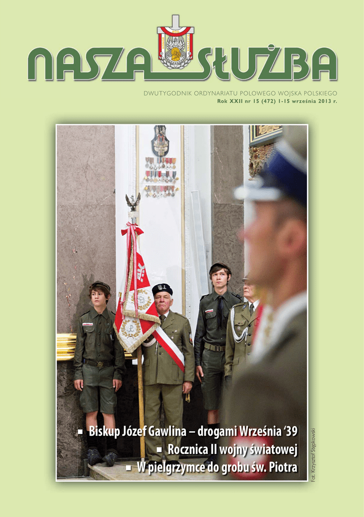 DWUTYGODNIK ORDYNARIATU POLOWEGO WOJSKA POLSKIEGO Biskup Józef Gawlina – drogami Września ‘39 Rocznica II wojny światowej W pielgrzymce do grobu św. Piotra Fot. Krzysztof Stępkowski Rok XXII nr 15 (472) 1-15 września 2013 r. Modlitwa o pokój Około 100 tysięcy wiernych, rzymian i turystów wzięło udział w czuwaniu modlitewnym w intencji pokoju w Syrii, na Bliskim Wschodzie i na całym świecie na placu św. Piotra. Byli wśród nich także obywatele Syrii. Licznie przybyli członkowie Kolegium Kardynalskiego. Modlitwie przewodniczył papież Franciszek. Watykańskie czuwanie rozpoczął hymn do Ducha Świętego: „Veni Creator Spiritus”. Następnie czterej gwardziści szwajcarscy, przy śpiewie pieśni sanktuarium maryjnego w Lourdes (w Polsce znana jako „Po górach, dolinach”), procesjonalnie przenieśli sprzed b li k w centrum placu l śśw. Pi obelisku Piotra czczoną w rzymskiej bazylice Matki Boskiej Większej ikonę „Salus Populi Romani” (Matki Bożej – patronki Rzymu) i ustawili ją na podwyższeniu w centralnym miejscu placu. Naprzeciw ikony ustawiono klęcznik i fotel dla Ojca Świętego. W swoim rozważaniu Ojciec Święty podkreślił, iż drugi człowiek jest „bratem i siostrą, których należy kochać, a więź z Bogiem, który jest miłością, wiernością, dobrocią, odzwierciedla się we wszystkich więziach między ludzkimi istotami i wnosi harmonię w cały świat stworzony. Świat Boga jest światem, w którym każdy czuje się odpowiedzialny za drugiego człowieka, za dobro drugiego człowieka” - stwierdził papież Franciszek. Następnie papież zauważył, że rzeczywistość świata w którym żyjemy znacznie odbiega od naszych pragnień. Choć stworzenie zachowuje swoje piękno, to obecne są też w nim przemoc, podział, konflikt, wojna. Dzieje się tak wtedy, gdy człowiek zamyka się w swoim egoizmie i stawia siebie w centrum, kiedy daje się zauroczyć bożkami panowania i władzy, kiedy stawia siebie na miejscu Boga. „Również dziś pozwalamy, by kierowały nami bożki egoizmu, naszych interesów; i takie nastawienie trwa: wydoskonaliśmy broń, nasze sumienia zasnęły, wysubtelniliśmy swoje racje, by się usprawiedliwić. Jakby to była rzecz normalna, dalej i j i i ból, śmierć! Przemoc, siejemy zniszczenie, wojna niosą tylko śmierć, mówią o śmierci! Przemoc i wojna mówią językiem śmierci!” – powiedział papież Franciszek. Ojciec Święty wyraził przekonanie, że istnieje alternatywa dla tej spirali bólu i śmierci, że możliwe jest pójście drogami pokoju. Zachęcił, aby każdy, w tym rządzący państwami, opowiedzieli się za tą drogą, aby wszyscy ludzie spojrzeli na Chrystusowy krzyż, w którym można przeczytać odpowiedź Boga. „W ciszy Krzyża milczy zgiełk broni i przemawia język pojednania, przebaczenia, dialogu, pokoju. Chciałbym prosić Boga dziś wieczorem, abyśmy my, chrześcijanie, bracia wyznający inne religie, każdy mężczyzna i kobieta dobrej woli wołali z mocą: przemoc i wojna nigdy nie są drogą do pokoju!”. Swoje rozważanie Ojciec Święty zakończył słowami: „Przebaczenie, dialog, pojednanie są słowami pokoju: w umiłowanej Syrii, na Bliskim Wschodzie, na całym świecie! Módlmy się o pojednanie i pokój, pracujmy na rzecz pojednania i pokoju, i stańmy się wszyscy, w każdym środowisku, ludźmi pojednania i pokoju!”. W łączności z Ojcem świętym w wielu parafiach wojskowych odbyły się uroczyste Msze św. i nabożeństwa. W Afganistanie modlili się żołnierze pełniący misję w ramach PKW. Uroczystej liturgii w katedrze polowej przewodniczył biskup polowy Józef Guzdek, który zauważył, że to właśnie Polacy, szczególnie doświadczeni przez historię, znają dobrze cierpienia związane z wojną. Podkreślił, że ofiarami konfliktów zbrojnych często są niewinni ludzie, kobiety i dzieci. „Pokój jest darem Boga, więc trzeba o niego prosić. Ponadto na modlitwie odkrywamy, że pokój w naszym sercu jest warunkiem pokoju w rodzinach, sąsiedztwie i środowisku pracy. Kultura dialogu, wzajemne zrozumienie, umiejętność słuchania i przebaczenia warunkują także pokój w wymiarze narodowym i międzynarodowym” powiedział bp Guzdek. Oprac. Krzysztof Stępkowski Wrzesień bohaterów „Ten naród zasłużył na to by odpoczął od bycia bohaterskim” – cytuję te gorzkie słowa z pamięci za jednym z anonimowych uczestników Powstania Warszawskiego, mając na uwadze, że właśnie wrzesień to wyjątkowy miesiąc polskiej historii, w którym często zapalamy znicze na grobach żołnierzy i uczestników II wojny światowej. Wrzesień w naszej pamięci rozpoczyna się tragedią wojny, kataklizmem, który naznaczył bólem wiele rodzin a zniszczeniem wiele miast. Blisko jego połowy wspominać będziemy rocznicę wiktorii wiedeńskiej, ostatniego triumfu I Rzeczpospolitej. Kilka dni później nasze myśli pobiegną na Wschód i będzie- my pamiętać o setkach tysięcy Polaków, którzy zostali wywiezionych na „nieludzką ziemię”. Pod koniec miesiąca przypomnimy o powstaniu Polskiego Państwa Podziemnego, fenomenu na skalę świata, państwa nie posiadającego geograficznych granic, działającego w ukryciu, ściganego przez wrogów, z którego inspirację czerpią kolejne pokolenia Polaków. Będziemy pamiętać o tych bohaterach modląc się i mając nadzieję, że tego rodzaju męstwo nie będzie już w przyszłości potrzebne. W bieżącym numerze „Naszej Służby” przedstawiamy wrześniową drogę biskupa Józefa Gawliny, prezentujemy relacje z ob- chodów rocznicy wybuchu II wojny światowej i nawiązując do daty 17 września opisujemy pielgrzymkę służb mundurowych do Miednoje. Zachęcamy także do przeczytania wywiadu z pątnikami z Wojskowego Centrum Geograficznego, którzy w lipcu pokonali Via Francigena, średniowieczny, transalpejski szlak wiodący do grobu św. Piotra w Rzymie. Przypominamy także o Św