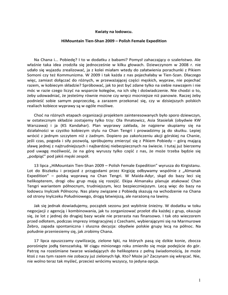 Kwiaty na lodowcu. HiMountain Tien-Shan 2009 – Polish Female Expedition Na Chana i... Pobiedę? I to w dodatku z babami? Pomysł zahaczający o szaleostwo. Ale właśnie taka idea zrodziła się jednocześnie w kilku głowach. Dziewczynom w 2008 r. nie udało się wyjazdu zrealizowad, ja z kolei miałam wtedy do załatwienia porachunki z Pikiem Somoni czy też Kommunizma. W 2009 i tak każda z nas pojechałaby w Tien-Szan. Dlaczego więc, zamiast dołączad do różnych, w przeważającej części męskich, wypraw, nie pojechad razem, w kobiecym składzie? Spróbowad, jak to jest byd zdane tylko na siebie nawzajem i nie móc w razie czego liczyd na wsparcie kolegów, na ich siłę i doświadczenie. Nie chodzi o to, żeby udowadniad, że jesteśmy równie mocne czy wręcz mocniejsze niż panowie. Raczej żeby podnieśd sobie samym poprzeczkę, a zarazem przekonad się, czy w dzisiejszych polskich realiach kobiece wyprawy są w ogóle możliwe. Chod na różnych etapach organizacji projektem zainteresowanych było sporo dziewczyn, w ostatecznym składzie zostajemy tylko trzy: Ola Ihnatowicz, Asia Stasielak (obydwie KW Warszawa) i ja (KS Kandahar). Plan wyprawy zakłada, że najpierw skupiamy się na działalności w czystko kobiecym stylu na Chan Tengri i prowadzimy ją do skutku. Lepiej wrócid z jednym szczytem niż z żadnym. Dopiero po zakooczeniu akcji górskiej na Chanie, jeśli czas, pogoda i siły pozwolą, spróbujemy zmierzyd się z Pikiem Pobiedy – górą mającą sławę jednej z najtrudniejszych i najbardziej niebezpiecznych na świecie. I tutaj już bierzemy pod uwagę możliwośd, że na górę wyruszy tylko częśd z nas, że może trzeba będzie się „podpiąd” pod jakiś męski zespół. 13 lipca „HiMountain Tien-Shan 2009 – Polish Female Expedition” wyrusza do Kirgistanu. Lot do Biszkeku i przejazd z przygodami przez Kirgizję odbywamy wspólnie z „Almanak Expedition” – polską wyprawą na Chan Tengri. W Maida-Adyr, skąd do bazy leci się helikopterem, drogi obu grup mają się rozejśd. Ekipa Almanaku planuje atakowad Chan Tengri wariantem północnym, trudniejszym, lecz bezpieczniejszym. Lecą więc do bazy na lodowcu Inylczek Północny. Nas plany związane z Pobiedą skazują na wchodzenie na Chana od strony Inylczeku Południowego, drogą łatwiejszą, ale narażoną na lawiny. Jak się jednak dowiadujemy, początek sezonu jest wybitnie śnieżny. W dodatku w toku negocjacji z agencją i kombinowania, jak tu zorganizowad przelot dla każdej z grup, okazuje się, że lot z jednej do drugiej bazy wcale nie przerasta nas finansowo. I tak oto wieczorem przed odlotem, podczas imprezy integracyjnej z Czechami, wybierającymi się na Marmurowe Żebro, zapada spontaniczna i słuszna decyzja: obydwie polskie grupy lecą na północ. Na południe przeniesiemy się, jak zrobimy Chana. 17 lipca opuszczamy cywilizację, zielone łąki, na których pasą się dzikie konie, zbocza porośnięte jodłą tienszaoską. W ciągu minionego roku zmieniło się moje podejście do gór. Patrzę na roześmiane twarze wsiadających do helikoptera z pełną świadomością, że może ktoś z nas tym razem nie zobaczy już zielonych łąk. Kto? Może ja? Zaczynam się wkręcad. Nie, nie wolno teraz tak myśled, przecież wrócimy wszyscy, to jedyna opcja. 1 Po pół godzinie lotu lądujemy w bazie północnej. Kontynuując tradycję polskich wypraw niskobudżetowych, chcąc uniknąd opłat, stawiamy osobną „polską bazę” niedaleko kirgiskiej. Jak mamy się wkrótce dowiedzied, jest jeszcze jedna baza – kazachska, pół godziny drogi od kirgiskiej. Faktycznie leży ona już na terytorium Kazachstanu, chod ani słupka granicznego, ani pogranicznika, nikt tu nigdy nie widział. Nad obiema bazami i lodowcem góruje piękna, wieczorami przybierająca czerwonawą barwę, bryła Chan Tengri. Naprawdę niesamowite miejsce. Kolejnego dnia ruszamy w górę w celu założenia jedynki. Jakoś tak wychodzi, że idziemy wspólnie z damską częścią Almanak Expedition – Izą Kamioską i Agą Konopką. Odtąd ich drogi częściej będą pokrywały się z naszymi niż chłopaków i w koocu uznamy, że nasz Female Team tworzymy nie w trójkę, a w piątkę. Jeśli dodad do tego dziewczyny z innych krajów, w tym nie tylko te idące z kolegami, mężami czy przewodnikami, ale i takie, jak Kylie z Nowej Zelandii i Lina z Danii czy też trzy Rosjanki, które działały w zespołach kobiecych, okazuje się, że Chan Tengri to bardzo sfeminizowana góra. Droga do jedynki nie przedstawia trudności. Po stromym śnieżnym podejściu, w miejscu przekraczania szczeliny, zaczyna się łaocuch poręczówek. Później trawers, podejście, pośredni obóz, tzw. niższa jedynka, znów śnieżne podejście i jesteśmy na miejscu, na 4600 m. Kopiemy platformę, stawiamy żółtego HiMountaina, gotujemy i wracamy do bazy. Ponieważ częśd zespołu nie najlepiej się czuła na górze, kolejne wyjście, mające na celu postawienie wyższych obozów, rozpoczynamy dopiero dwudziestego, po dniu odpoczynku w bazie. Na szczęście tym razem w jedynce wszystkie czujemy się dobrze, nazajutrz wyruszamy więc do dwójki, położonej na ok. 5500 m. Koledzy z ekipy Almanaka nastraszyli nas długością i trudnością trasy, decydujemy się więc, zamiast wracad do jedynki na noc i kolejnego dnia wynosid resztę rzeczy, pójśd z wszystkim na raz, a wysiłek tego dnia zrekompensowad sobie nazajutrz słodkim nic nie robieniem w dwójce. Droga do obozu z ciężarem i bez aklimatyzacji zajmuje faktycznie 7-8 godzin i jest męcząca, ale skałki okazują się łatwe, a całośd trasy porządnie zaporęczowana. Dwójka znajduje się komfortowym plateau – chyba jedynym kawałku płaskiego terenu z tej strony góry. Kolejnego dnia, tak jak sobie obiecałyśmy, odpoczywamy w obozie. Niektórym wysokośd o sobie przypomina, ale nie na tyle dramatycznie, żeby było konieczne zejście. 23 lipca ruszamy więc do gó