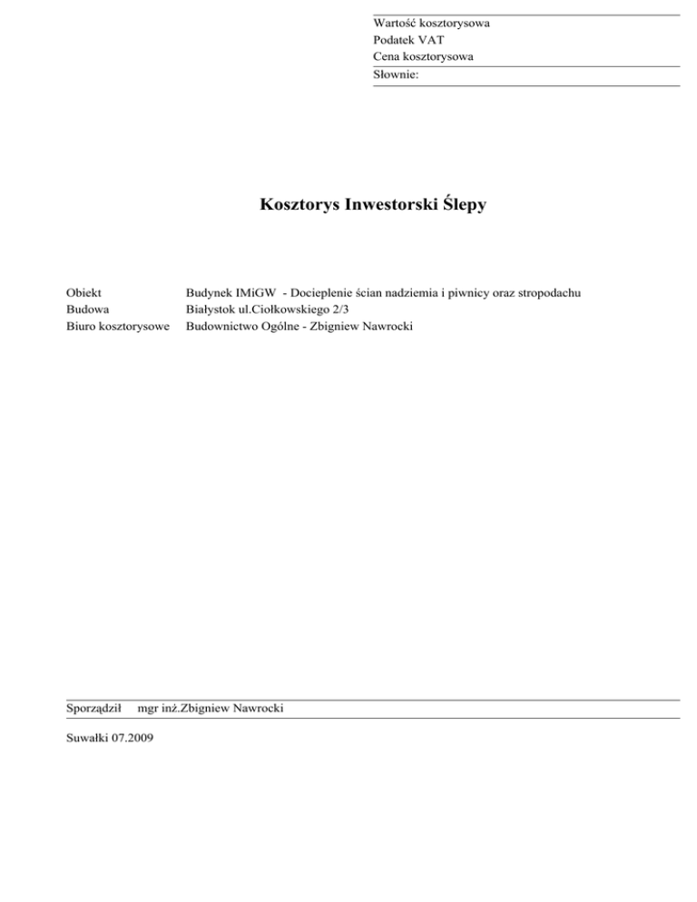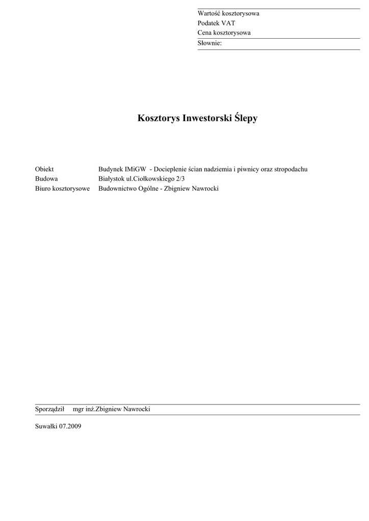 Kosztorys Inwestorski Ślepy