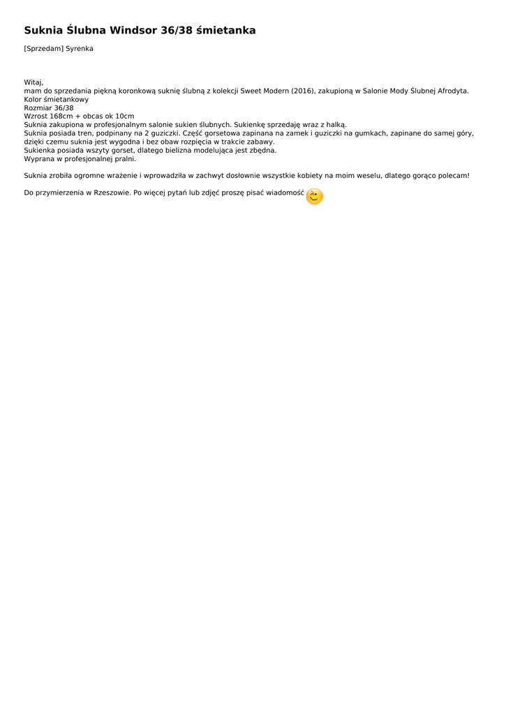 Suknia Ślubna Windsor 36/38 śmietanka [Sprzedam] Syrenka Witaj, mam do sprzedania piękną koronkową suknię ślubną z kolekcji Sweet Modern (2016), zakupioną w Salonie Mody Ślubnej Afrodyta. Kolor śmietankowy Rozmiar 36/38 Wzrost 168cm + obcas ok 10cm Suknia zakupiona w profesjonalnym salonie sukien ślubnych. Sukienkę sprzedaję wraz z halką. Suknia posiada tren, podpinany na 2 guziczki. Część gorsetowa zapinana na zamek i guziczki na gumkach, zapinane do samej góry, dzięki czemu suknia jest wygodna i bez obaw rozpięcia w trakcie zabawy. Sukienka posiada wszyty gorset, dlatego bielizna modelująca jest zbędna. Wyprana w profesjonalnej pralni. Suknia zrobiła ogromne wrażenie i wprowadziła w zachwyt dosłownie wszystkie kobiety na moim weselu, dlatego gorąco polecam! Do przymierzenia w Rzeszowie. Po więcej pytań lub zdjęć proszę pisać wiadomość Informacje dodatkowe Stan Używany Adres ogłoszenia http://todoslubu.pl/suknia-slubna-windsor-36-38-smietanka,o511 Kontakt Mail: [email protected] Telefon: 782364305 Lokalizacja , Rzeszów Podkarpackie (pl) Ogłoszenie dodano: 2016-12-09 13:38:11 Ogłoszenie wygasa: 2026-09-08 13:38:11 Powered by TCPDF (www.tcpdf.org)