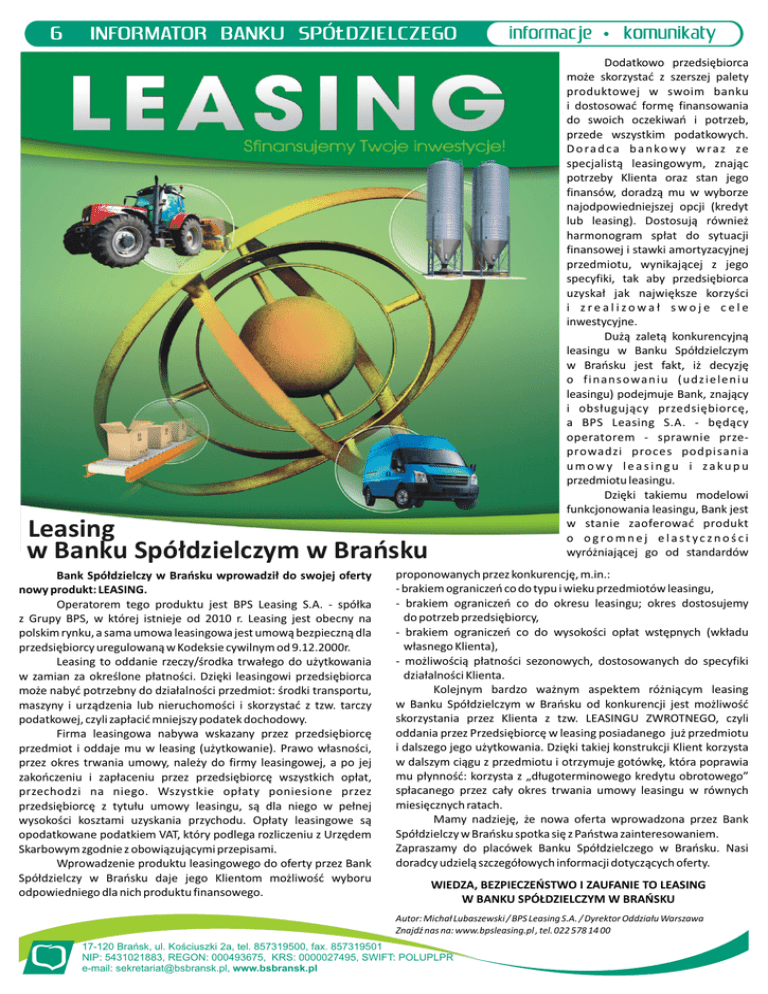 Dodatkowo przedsiębiorca może skorzystać z szerszej palety produktowej w swoim banku i dostosować formę finansowania do swoich oczekiwań i potrzeb, przede wszystkim podatkowych. D o ra d c a b a n ko w y w ra z ze specjalistą leasingowym, znając potrzeby Klienta oraz stan jego finansów, doradzą mu w wyborze najodpowiedniejszej opcji (kredyt lub leasing). Dostosują również harmonogram spłat do sytuacji finansowej i stawki amortyzacyjnej przedmiotu, wynikającej z jego specyfiki, tak aby przedsiębiorca uzyskał jak największe korzyści i zrealizował swoje cele inwestycyjne. Dużą zaletą konkurencyjną leasingu w Banku Spółdzielczym w Brańsku jest fakt, iż decyzję o f in an s owa n iu ( u d z ielen iu leasingu) podejmuje Bank, znający i obsługujący przedsiębiorcę, a BPS Leasing S.A. - będący operatorem - sprawnie przeprowadzi proces podpisania umowy leasingu i zakupu przedmiotu leasingu. Dzięki takiemu modelowi funkcjonowania leasingu, Bank jest w stanie zaoferować produkt o ogromnej elastyczności wyróżniającej go od standardów Leasing w Banku Spółdzielczym w Brańsku Bank Spółdzielczy w Brańsku wprowadził do swojej oferty nowy produkt: LEASING. Operatorem tego produktu jest BPS Leasing S.A. - spółka z Grupy BPS, w której istnieje od 2010 r. Leasing jest obecny na polskim rynku, a sama umowa leasingowa jest umową bezpieczną dla przedsiębiorcy uregulowaną w Kodeksie cywilnym od 9.12.2000r. Leasing to oddanie rzeczy/środka trwałego do użytkowania w zamian za określone płatności. Dzięki leasingowi przedsiębiorca może nabyć potrzebny do działalności przedmiot: środki transportu, maszyny i urządzenia lub nieruchomości i skorzystać z tzw. tarczy podatkowej, czyli zapłacić mniejszy podatek dochodowy. Firma leasingowa nabywa wskazany przez przedsiębiorcę przedmiot i oddaje mu w leasing (użytkowanie). Prawo własności, przez okres trwania umowy, należy do firmy leasingowej, a po jej zakończeniu i zapłaceniu przez przedsiębiorcę wszystkich opłat, przechodzi na niego. Wszystkie opłaty poniesione przez przedsiębiorcę z tytułu umowy leasingu, są dla niego w pełnej wysokości kosztami uzyskania przychodu. Opłaty leasingowe są opodatkowane podatkiem VAT, który podlega rozliczeniu z Urzędem Skarbowym zgodnie z obowiązującymi przepisami. Wprowadzenie produktu leasingowego do oferty przez Bank Spółdzielczy w Brańsku daje jego Klientom możliwość wyboru odpowiedniego dla nich produktu finansowego. proponowanych przez konkurencję, m.in.: - brakiem ograniczeń co do typu i wieku przedmiotów leasingu, - brakiem ograniczeń co do okresu leasingu; okres dostosujemy do potrzeb przedsiębiorcy, - brakiem ograniczeń co do wysokości opłat wstępnych (wkładu własnego Klienta), - możliwością płatności sezonowych, dostosowanych do specyfiki działalności Klienta. Kolejnym bardzo ważnym aspektem różniącym leasing w Banku Spółdzielczym w Brańsku od konkurencji jest możliwość skorzystania przez Klienta z tzw. LEASINGU ZWROTNEGO, czyli oddania przez Przedsiębiorcę w leasing posiadanego już przedmiotu i dalszego jego użytkowania. Dzięki takiej konstrukcji Klient korzysta w dalszym ciągu z przedmiotu i otrzymuje gotówkę, która poprawia mu płynność: korzysta z „długoterminowego kredytu obrotowego” spłacanego przez cały okres trwania umowy leasingu w równych miesięcznych ratach. Mamy nadzieję, że nowa oferta wprowadzona przez Bank Spółdzielczy w Brańsku spotka się z Państwa zainteresowaniem. Zapraszamy do placówek Banku Spółdzielczego w Brańsku. Nasi doradcy udzielą szczegółowych informacji dotyczących oferty. WIEDZA, BEZPIECZEŃSTWO I ZAUFANIE TO LEASING W BANKU SPÓŁDZIELCZYM W BRAŃSKU Autor: Michał Lubaszewski / BPS Leasing S.A. / Dyrektor Oddziału Warszawa Znajdź nas na: www.bpsleasing.pl , tel. 022 578 14 00 17-120 Brańsk, ul. Kościuszki 2a, tel. 857319500, fax. 857319501 NIP: 5431021883, REGON: 000493675, KRS: 0000027495, SWIFT: POLUPLPR e-mail: [email protected], www.bsbransk.pl