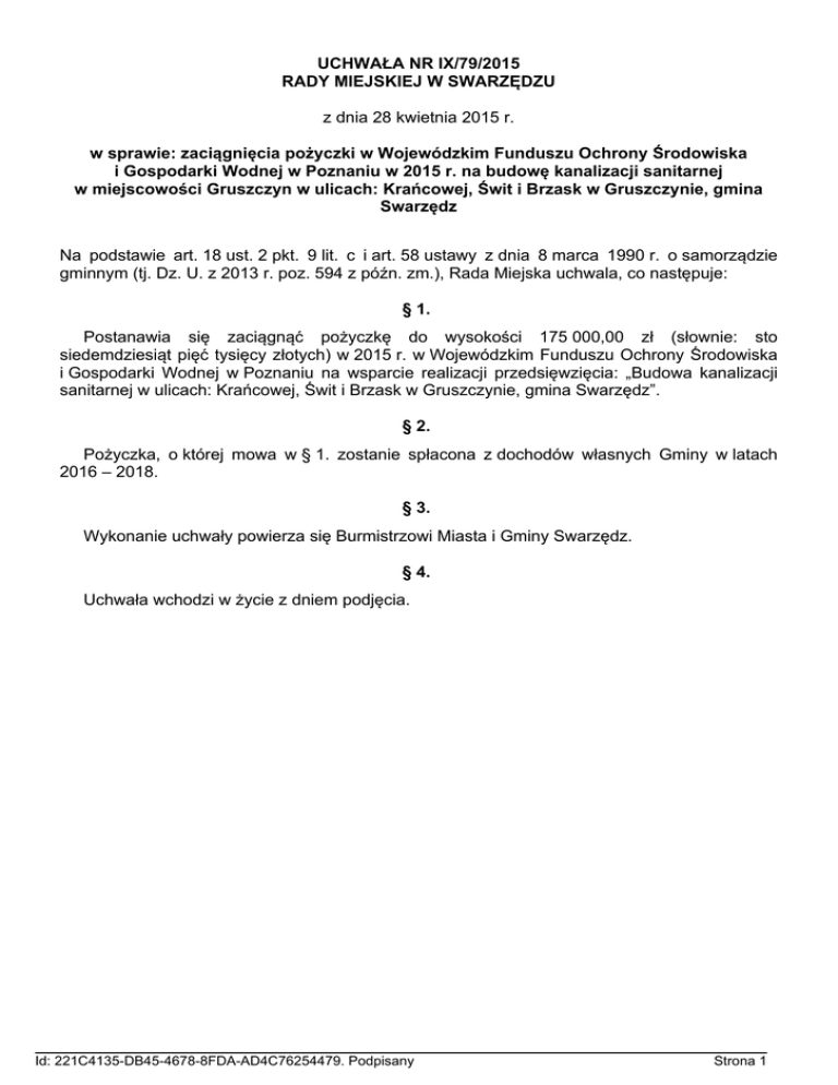 UCHWAŁA NR IX/79/2015 RADY MIEJSKIEJ W SWARZĘDZU z dnia 28 kwietnia 2015 r. w sprawie: zaciągnięcia pożyczki w Wojewódzkim Funduszu Ochrony Środowiska i Gospodarki Wodnej w Poznaniu w 2015 r. na budowę kanalizacji sanitarnej w miejscowości Gruszczyn w ulicach: Krańcowej, Świt i Brzask w Gruszczynie, gmina Swarzędz Na podstawie art. 18 ust. 2 pkt. 9 lit. c i art. 58 ustawy z dnia 8 marca 1990 r. o samorządzie gminnym (tj. Dz. U. z 2013 r. poz. 594 z późn. zm.), Rada Miejska uchwala, co następuje: § 1. Postanawia się zaciągnąć pożyczkę do wysokości 175 000,00 zł (słownie: sto siedemdziesiąt pięć tysięcy złotych) w 2015 r. w Wojewódzkim Funduszu Ochrony Środowiska i Gospodarki Wodnej w Poznaniu na wsparcie realizacji przedsięwzięcia: „Budowa kanalizacji sanitarnej w ulicach: Krańcowej, Świt i Brzask w Gruszczynie, gmina Swarzędz”. § 2. Pożyczka, o której mowa w § 1. zostanie spłacona z dochodów własnych Gminy w latach 2016 – 2018. § 3. Wykonanie uchwały powierza się Burmistrzowi Miasta i Gminy Swarzędz. § 4. Uchwała wchodzi w życie z dniem podjęcia. Id: 221C4135-DB45-4678-8FDA-AD4C76254479. Podpisany Strona 1 Uzasadnienie Zarząd Wojewódzkiego Funduszu Ochrony Środowiska i Gospodarki Wodnej w Poznaniu w nawiązaniu do wniosku Gminy Swarzędz z dnia 15.12.2014 r. pismem o Nr WFOŚ-IIIDPU-JS/400/409/2015 z dnia 16.04.2015 r., poinformował, ze planuje pomoc finansową w formie pożyczki zwrotnej, ze środków WFOŚiGW, na wsparcie realizacji przedsięwzięcia pn: „Budowa kanalizacji sanitarnej w ulicach: Krańcowej, Świt i Brzask w Gruszczynie, gmina Swarzędz” z przeznaczeniem na budowę kanalizacji sanitarnej wraz z przykanalikami do posesji w ul. Krańcowej, Świt i Brzask w Gruszczynie. Kwota pożyczki planowana jest do 175 000,00 zł z roczną realizacją inwestycji. W Budżecie Gminy na budowę kanalizacji sanitarnej w Gruszczynie zaplanowano: - w roku 2015 – 300 000,00 zł; - w roku 2016 – 700 000,00 zł; - w roku 2017 – 3 220 000,00 zł. Pomoc finansowa jest przyznawana na następujących warunkach: - w formie pożyczki zwrotnej w kwartalnych ratach; - z oprocentowaniem w wysokości 0,5 stopy redyskonta weksli w stosunku rocznym, liczonym od nie spłaconych kwot kapitału, lecz nie mniej niż 3%. - maksymalny okres do 6 lat liczony od daty zawarcia umowy pożyczki; - karencja spłaty rat kapitałowych pożyczki nie dłuższa niż 1 rok od daty zakończenia przedsięwzięcia określonej w umowie pożyczki; - z planowanym umorzeniem pożyczki do wysokości 40%. Id: 221C4135-DB45-4678-8FDA-AD4C76254479. Podpisany Strona 1