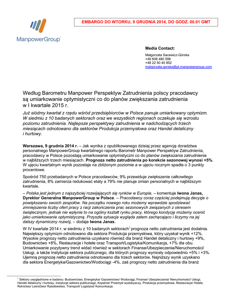 EMBARGO DO WTORKU, 9 GRUDNIA 2014, DO GODZ. 00.01 GMT Media Contact: Małgorzata Sacewicz-Górska +48 608 480 596 +48 22 50 40 852 [email protected] Według Barometru Manpower Perspektyw Zatrudnienia polscy pracodawcy są umiarkowanie optymistyczni co do planów zwiększania zatrudnienia w I kwartale 2015 r. Już siódmy kwartał z rzędu wśród przedsiębiorców w Polsce panuje umiarkowany optymizm. W siedmiu z 10 badanych sektorach oraz we wszystkich regionach oczekuje się wzrostu poziomu zatrudnienia. Najlepsze perspektywy zatrudnienia w nadchodzących trzech miesiącach odnotowano dla sektorów Produkcja przemysłowa oraz Handel detaliczny i hurtowy. Warszawa, 9 grudnia 2014 r. – Jak wynika z opublikowanego dzisiaj przez agencję doradztwa personalnego ManpowerGroup kwartalnego raportu Barometr Manpower Perspektyw Zatrudnienia, pracodawcy w Polsce pozostają umiarkowanie optymistyczni co do planów zwiększania zatrudnienia w najbliższych trzech miesiącach. Prognoza netto zatrudnienia po korekcie sezonowej wynosi +5%. W ujęciu kwartalnym wynik pozostaje na zbliżonym poziomie a w ujęciu rocznym spadła o 3 punkty procentowe. Spośród 750 przebadanych w Polsce pracodawców, 9% przewiduje zwiększenie całkowitego zatrudnienia, 8% zamierza redukować etaty a 79% nie planuje zmian personalnych w najbliższym kwartale. – Polska jest jednym z najszybciej rozwijających się rynków w Europie, – komentuje Iwona Janas, Dyrektor Generalna ManpowerGroup w Polsce. – Pracodawcy coraz częściej podejmują decyzje o powiększaniu swoich zespołów. Na początku nowego roku możemy wprawdzie spodziewać zmniejszenia liczby ofert pracy z racji zakończenia prac sezonowych związanych z okresem świątecznym, jednak nie wpłynie to na ogólny kształt rynku pracy, którego kondycję możemy ocenić jako umiarkowanie optymistyczną. Przyszła sytuacja wygląda zatem zachęcająco i liczymy na jej dalszy dynamiczny rozwój, – dodaje Iwona Janas. W IV kwartale 2014 r. w siedmiu z 10 badanych sektorach1 prognoza netto zatrudnienia jest dodatnia. Największy optymizm odnotowano dla sektora Produkcja przemysłowa, który uzyskał wynik +12%. Wysokie prognozy netto zatrudnienia uzyskano również dla branż Handel detaliczny i hurtowy +9%, Budownictwo +8%, Restauracje i hotele oraz Transport/Logistyka/Komunikacja, +7% dla obu. Umiarkowanie pozytywny trend widać również w sektorach Finanse/Ubezpieczenia/Nieruchomości/ Usługi, a także Instytucje sektora publicznego, dla których prognozy wyniosły odpowiednio +5% i +3%. Ujemną prognozę netto zatrudnienia odnotowano dla trzech sektorów. Najniższy wynik uzyskano dla sektora Energetyka/Gazownictwo/Wodociągi -4%, zaś prognozy netto zatrudnienia dla branż 1 Sektory uwzględnione w badaniu: Budownictwo, Energetyka/ Gazownictwo/ Wodociągi, Finanse/ Ubezpieczenia/ Nieruchomości/ Usługi, Handel detaliczny i hurtowy, Instytucje sektora publicznego, Kopalnie/ Przemysł wydobywczy, Produkcja przemysłowa, Restauracje/ Hotele, Rolnictwo/ Leśnictwo/ Rybołówstwo, Transport/ Logistyka/ Komunikacja. Rolnictwo/Leśnictwo/Rybołówstwo oraz Kopalnie/Przemysł wydobywczy wynoszą odpowiednio -3% i -2%. W porównaniu z IV kwartałem 2014 r. Pogorszenie prognoz nastąpiło w pięciu z 10 badanych sektorach. Największy spadek, o 7 punktów procentowych, odnotowano dla branży Transport/Logistyka/ Komunikacja. Prognoza spadła umiarkowanie w sektorach Handel detaliczny i hurtowy, o 4 punkty procentowe, Energetyka/Gazownictwo/Wodociągi oraz Restauracje i hotele, o 3 punkty procentowe dla obu. Wzrost prognoz odnotowano w trzech sektorach, najwyższy dla branż Kopalnie/Przemysł wydobywczy, a także Instytucje sektora publicznego, odpowiednio o 5 i o 3 punkty procentowe. W ujęciu rocznym pogorszenie prognoz uzyskano w sześciu z 10 badanych sektorach. Największy spadek odnotowano dla sektorów Rolnictwo/Leśnictwo/Rybołówstwo oraz Transport/Logistyka/ Komunikacja, odpowiednio o 15 i o 13 punktów procentowych. Umiarkowany spadek, o 5 punktów procentowych, uzyskano dla branży Restauracje i hotele. Poprawę prognoz odnotowano dla czterech sektorów. Największy wzrost uzyskano dla branż Energetyka/Gazownictwo/Wodociągi oraz Instytucje sektora publicznego, odpowiednio o 5 i o 4 punkty procentowe. We wszystkich sześciu badanych regionach Polski2 prognoza netto zatrudnienia dla I kwartału 2015 r. jest dodatnia. Oznacza to, że w większości kraju przeważa optymizm pracodawców co do planów zwiększania liczby etatów w nadchodzącym kwartale. Najwyższy wynik uzyskano dla regionu Południowego, gdzie prognoza netto zatrudnienia wynosi +9%. Umiarkowanie optymistyczne wyniki uzyskano dla regionów Południowo-Zachodniego oraz Północno -Zachodniego, gdzie prognoza netto zatrudnienia wynosi odpowiednio +6% i +5%. Prognoza dla regionów Północnego i Wschodniego wyniosła +3% dla obu. Najniższy wynik uzyskano dla regionu Centralnego, +2%. W porównaniu z wynikami dla IV kwartału 2014 r. prognoza zatrudnienia spadła w trzech z sześciu badanych regionach. Największy spadek odnotowano w regionie Północnym, o 5 punktów procentowych. W regionie Centralnym prognoza obniżyła się nieznacznie, o 2 punkty procentowe. W regionach Południowym i Północno-Zachodnim prognoza pozostaje na zbliżonym do poprzedniego kwartału poziomie, a w Południowo-Zachodnim i Wschodnim nie ulega zmianie. W ujęciu rocznym spadek optymizmu pracodawców odnotowano w czterech z sześciu badanych regionach. Największe pogorszenie prognoz uzyskano w regionach Centralnym i Północnym, o 5 punktów procentowych dla obu. W regionie Południowo-Zachodnim wynik spadł o 4 punkty procentowe. Prognozy odnotowane dla regionów Południowego, Północno-Zachodniego i Wschodniego nie zmieniają się lub pozostają na zbliżonym poziomie w porównaniu rok do roku. W badaniu Barometr Manpower Perspektyw Zatrudnienia dla I kwartału 2015 r. deklaracje polskich respondent