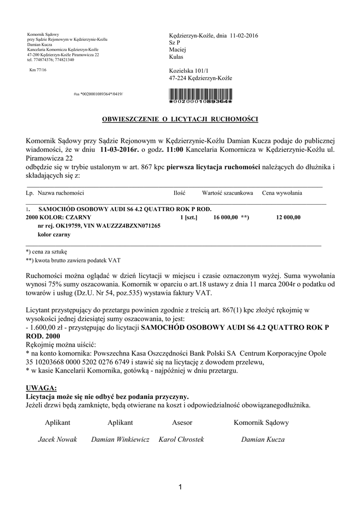 Komornik Sądowy przy Sądzie Rejonowym w Kędzierzynie-Koźlu Damian Kucza Kancelaria Komornicza Kędzierzyn-Koźle 47-200 Kędzierzyn-Koźle Piramowicza 22 tel. 774874376; 774821340 Kędzierzyn-Koźle, dnia 11-02-2016 Sz P Maciej Kulas Km 77/16 Kozielska 101/1 47-224 Kędzierzyn-Koźle #ss *0020001089364*/0419/ *0020001089364* OBWIESZCZENIE O LICYTACJI RUCHOMOŚCI Komornik Sądowy przy Sądzie Rejonowym w Kędzierzynie-Koźlu Damian Kucza podaje do publicznej wiadomości, że w dniu 11-03-2016r. o godz. 11:00 Kancelaria Komornicza w Kędzierzynie-Koźlu ul. Piramowicza 22 odbędzie się w trybie ustalonym w art. 867 kpc pierwsza licytacja ruchomości należących do dłużnika i składających się z: _______________________________________________________________________________________________________________________ Lp. Nazwa ruchomości Ilość Wartość szacunkowa Cena wywołania _________________________________________________________________________________________________________________________ 1. SAMOCHÓD OSOBOWY AUDI S6 4.2 QUATTRO ROK P ROD. 2000 KOLOR: CZARNY 1 [szt.] 16 000,00 **) nr rej. OK19759, VIN WAUZZZ4BZXN071265 kolor czarny 12 000,00 _______________________________________________________________________________________________________________________ *) cena za sztukę **) kwota brutto zawiera podatek VAT Ruchomości można oglądać w dzień licytacji w miejscu i czasie oznaczonym wyżej. Suma wywołania wynosi 75% sumy oszacowania. Komornik w oparciu o art.18 ustawy z dnia 11 marca 2004r o podatku od towarów i usług (Dz.U. Nr 54, poz.535) wystawia faktury VAT. Licytant przystępujący do przetargu powinien zgodnie z treścią art. 867(1) kpc złożyć rękojmię w wysokości jednej dziesiątej sumy oszacowania, to jest: - 1.600,00 zł - przystępując do licytacji SAMOCHÓD OSOBOWY AUDI S6 4.2 QUATTRO ROK P ROD. 2000 Rękojmię można uiścić: * na konto komornika: Powszechna Kasa Oszczędności Bank Polski SA Centrum Korporacyjne Opole 35 10203668 0000 5202 0276 6749 i stawić się na licytację z dowodem przelewu, * w kasie Kancelarii Komornika, gotówką - najpóźniej w dniu przetargu. UWAGA: Licytacja może się nie odbyć bez podania przyczyny. Jeżeli drzwi będą zamknięte, będą otwierane na koszt i odpowiedzialność obowiązanegodłużnika. Aplikant Aplikant Asesor Komornik Sądowy Jacek Nowak Damian Winkiewicz Karol Chrostek Damian Kucza 1