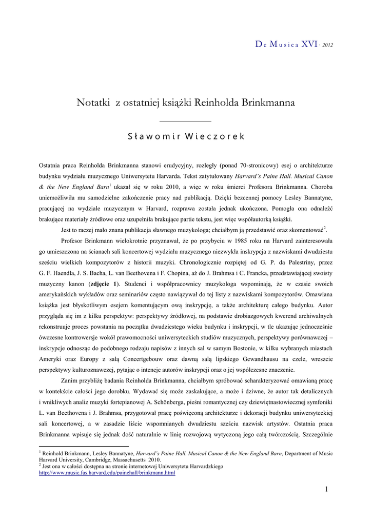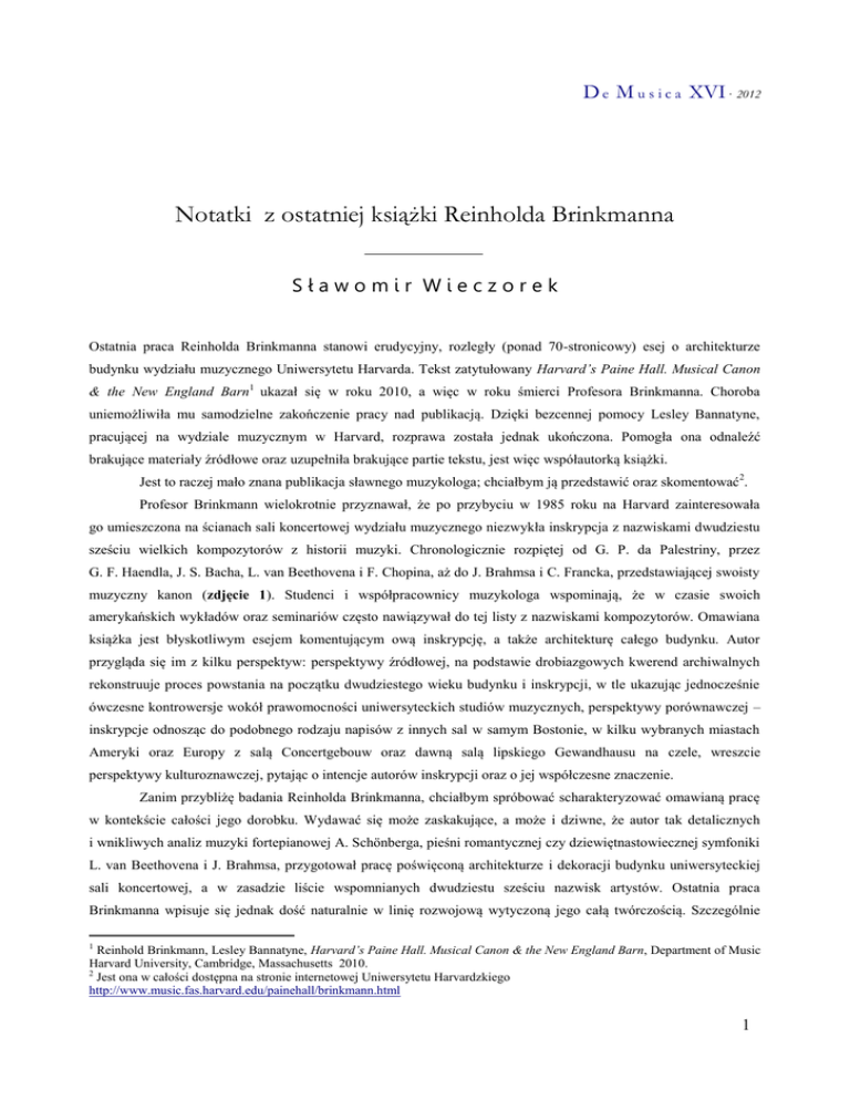 D e M u s i c a XVI· 2012 Notatki z ostatniej książki Reinholda Brinkmanna Sławomir Wieczorek Ostatnia praca Reinholda Brinkmanna stanowi erudycyjny, rozległy (ponad 70-stronicowy) esej o architekturze budynku wydziału muzycznego Uniwersytetu Harvarda. Tekst zatytułowany Harvard’s Paine Hall. Musical Canon & the New England Barn1 ukazał się w roku 2010, a więc w roku śmierci Profesora Brinkmanna. Choroba uniemożliwiła mu samodzielne zakończenie pracy nad publikacją. Dzięki bezcennej pomocy Lesley Bannatyne, pracującej na wydziale muzycznym w Harvard, rozprawa została jednak ukończona. Pomogła ona odnaleźć brakujące materiały źródłowe oraz uzupełniła brakujące partie tekstu, jest więc współautorką książki. Jest to raczej mało znana publikacja sławnego muzykologa; chciałbym ją przedstawić oraz skomentować2. Profesor Brinkmann wielokrotnie przyznawał, że po przybyciu w 1985 roku na Harvard zainteresowała go umieszczona na ścianach sali koncertowej wydziału muzycznego niezwykła inskrypcja z nazwiskami dwudziestu sześciu wielkich kompozytorów z historii muzyki. Chronologicznie rozpiętej od G. P. da Palestriny, przez G. F. Haendla, J. S. Bacha, L. van Beethovena i F. Chopina, aż do J. Brahmsa i C. Francka, przedstawiającej swoisty muzyczny kanon (zdjęcie 1). Studenci i współpracownicy muzykologa wspominają, że w czasie swoich amerykańskich wykładów oraz seminariów często nawiązywał do tej listy z nazwiskami kompozytorów. Omawiana książka jest błyskotliwym esejem komentującym ową inskrypcję, a także architekturę całego budynku. Autor przygląda się im z kilku perspektyw: perspektywy źródłowej, na podstawie drobiazgowych kwerend archiwalnych rekonstruuje proces powstania na początku dwudziestego wieku budynku i inskrypcji, w tle ukazując jednocześnie ówczesne kontrowersje wokół prawomocności uniwersyteckich studiów muzycznych, perspektywy porównawczej – inskrypcje odnosząc do podobnego rodzaju napisów z innych sal w samym Bostonie, w kilku wybranych miastach Ameryki oraz Europy z salą Concertgebouw oraz dawną salą lipskiego Gewandhausu na czele, wreszcie perspektywy kulturoznawczej, pytając o intencje autorów inskrypcji oraz o jej współczesne znaczenie. Zanim przybliżę badania Reinholda Brinkmanna, chciałbym spróbować scharakteryzować omawianą pracę w kontekście całości jego dorobku. Wydawać się może zaskakujące, a może i dziwne, że autor tak detalicznych i wnikliwych analiz muzyki fortepianowej A. Schönberga, pieśni romantycznej czy dziewiętnastowiecznej symfoniki L. van Beethovena i J. Brahmsa, przygotował pracę poświęconą architekturze i dekoracji budynku uniwersyteckiej sali koncertowej, a w zasadzie liście wspomnianych dwudziestu sześciu nazwisk artystów. Ostatnia praca Brinkmanna wpisuje się jednak dość naturalnie w linię rozwojową wytyczoną jego całą twórczością. Szczególnie 1 Reinhold Brinkmann, Lesley Bannatyne, Harvard’s Paine Hall. Musical Canon & the New England Barn, Department of Music Harvard University, Cambridge, Massachusetts 2010. 2 Jest ona w całości dostępna na stronie internetowej Uniwersytetu Harvardzkiego http://www.music.fas.harvard.edu/painehall/brinkmann.html 1 D e M u s i c a XVI· 2012 bliska jest działalności z amerykańskiego etapu kariery. Myślę, że wskazać można na przynajmniej pięć argumentów przemawiających za takim ujęciem. Przyglądając się bibliografii muzykologa najbardziej uderza jedna rzecz 3, ponieważ oprócz hasła o romantycznej pieśni przygotowanego dla redagowanego przez Hermanna Danusera tomu Handbuch der musikalischen Gattungen4, nie ma w niej zbyt wielu prac o charakterze obszernej syntezy historycznej. Jest on więc autorem studiów na temat Trzech utworów fortepianowych op. 11 A. Schönberga (jego doktorat)5, rozprawy o II Symfonii J. Brahmsa6 czy politycznym aspekcie cyklu Winterreise F. Schuberta7. Bardzo charakterystyczna dla podejścia Brinkmanna jest publikacja o Liderkreis op. 39 R. Schumanna8, w której drobiazgowej analizie poddał jedynie wybrane pieśni z cyklu. W przypadku książki Late Idyll punktem wyjścia jest analiza małego fragmentu II Symfonii J. Brahmsa. W kontekście tym nie może więc zdziwić siedemdziesiąt stron poświęconych „zaledwie”, jak mógłby ktoś powiedzieć, architekturze sali koncertowej oraz inskrypcji z nazwiskami kompozytorów. Szczupły, co nie oznacza, że ograniczony, materiał tematyczny jako punkt wyjścia dla podjęcia rozległych, rozbudowanych studiów wydaje się być z pewnej perspektywy czasowej znakiem rozpoznawczym muzykologii Reinholda Brinkmanna. Również sam przedmiot badań nie powinien zdziwić, ponieważ odpowiada późnym metodologicznym sympatiom muzykologa. Karol Berger w pośmiertnym wspomnieniu Reinholda Brinkmanna napisał: „Rok 1985, moment jego przenosin z Niemiec do USA, zbiegł się dokładnie z głęboką przemianą paradygmatu w muzykologii amerykańskiej, która właśnie wtedy straciła przekonanie o centralnej roli muzyki niemieckiej w tradycji zachodniej muzyki artystycznej i o centralnej roli źródłoznawstwa i analizy wśród metod nauki o tej tradycji. Brinkmann odnosił się do tej zmiany paradygmatu raczej z sympatią, widząc w niej wyzwolenie z ciasnych dyscyplinarnych ram, które, jak sądził, dławiły poważniejsze ambicje nauki o muzyce także w jego kraju rodzinnym”9. Sam wybór niekonwencjonalnego i niezbyt popularnego tematu, jakim jest w muzykologii architektura budynku sali koncertowej, stanowi już dowód opisywanej przez Karola Bergera sympatii. A sposób „czytania” przez niego zarówno budynku, jak i inskrypcji można uznać za przykład znakomitej analizy kulturoznawczej, której celem jest przedstawienie kulturowych powiązań obu zjawisk: ukazania znaczeń nadawanych muzyce u progu dwudziestego wieku w Ameryce oraz sposobu postrzegania jej społecznej roli. Jak zobaczymy, 