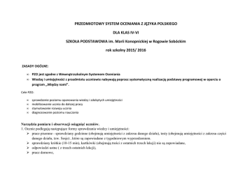PRZEDMIOTOWY SYSTEM OCENIANIA Z JĘZYKA POLSKIEGO DLA KLAS IV-VI SZKOŁA PODSTAWOWA im. Marii Konopnickiej w Rogowie Sobóckim rok szkolny 2015/ 2016 ZASADY OGÓLNE: • • PZO jest zgodne z Wewnątrzszkolnym Systemem Oceniania Wiedzę i umiejętności z przedmiotu uczniowie nabywają poprzez systematyczną realizację podstawy programowej w oparciu o program ,,Między nami”. Cele PZO: • • • • sprawdzenie poziomu opanowania wiedzy i zdobytych umiejętności mobilizowanie ucznia do dalszej pracy stymulowanie rozwoju ucznia diagnozowanie poziomu nauczania Narzędzia pomiaru i obserwacji osiągnięć uczniów. 1. Ocenie podlegają następujące formy sprawdzania wiedzy i umiejętności: prace pisemne - sprawdziany godzinne (obejmują umiejętności z zakresu danego działu), testy (obejmują umiejętności z zakresu części danego działu, tzw. Sesje) , które są zapowiadane z tygodniowym wyprzedzeniem. sprawdziany krótkie (10-15 min), kartkówki (obejmują treści z ostatnich trzech lekcji) nie są zapowiadane, odpowiedzi ustne ( z trzech ostatnich lekcji), prace domowe, prowadzenie zeszytu przedmiotowego, recytacja, inne formy aktywności np. udział w konkursach, foldery z lektur zapowiadane z dużym wyprzedzeniem czasowym, wykonanie zadań z ,,Ortografii”, ,,Władcy słów”, ,,Ortografka.pl” obserwacja ucznia: - przygotowanie do lekcji, aktywność na lekcji, praca w grupie, inne formy kontroli uzgodnione z uczniami. 2. Liczbę i częstotliwość pomiarów osiągnięć edukacyjnych ucznia nauczyciel ustala z uczniami i modyfikuje w zespole klasowym . III. Wymagania na ocenę 1. Ocenianie odbywa się zgodnie z WSO w skali sześciostopniowej, a przy ocenach bieżących i śródrocznych dopuszcza się „+” i „ – ’’. 2. Przy odpowiedzi ustnej nauczyciel zadaje uczniowi pytania z zakresu wymagań podstawowych i ponadpodstawowych (zgodnie z własnym planem dydaktycznym przewidzianym dla danej klasy) i w zależności od udzielonej odpowiedzi stawia odpowiednią ocenę (na prośbę ucznia odpowiedź może być w formie pisemnej). 3. Aktywność na lekcji oceniana jest znakiem „+”, za trzy takie znaki uczeń otrzymuje ocenę bdb, trzy znaki „-” ( brak uczestnictwa w lekcji, błędne odpowiedzi) równają się ocenie ndst. 4. Ocenę za pracę w grupie mogą otrzymać wszyscy członkowie zespołu lub indywidualni uczniowie. 5. Testy i sprawdziany są punktowane, a punkty przeliczane na oceny wg poniższej skali procentowej: Progi procentowe do oceny prac pisemnych w w klasach czwartych, piątych i szóstych L.p. Oceny Procentowy udział punktów 1. Niedostateczny O%–34% 2. Dopuszczający 35%–50% 3. Dostateczny 51%–70% 4. Dobry 71%–89% 5. Bardzo dobry 90%–96% 6. Celujący 97% -100% Przy obniżonych wymaganiach L.p. Oceny Procentowy udział punktów 1. Niedostateczny O%–19% 2. Dopuszczający 20%–39% 3. Dostateczny 40%–54% 4. Dobry 55%–70% 5. Bardzo dobry 71%–89% 6. Celujący 90% -100% OGÓLNE KRYTERIA OCENIANIA DLA KLASY IV z języka polskiego w roku szkolnym 2015 / 2016 • • niedostateczny poziom umiejętności i wiadomości objętych wymaganiami edukacyjnymi klasy czwartej uniemożliwia osiąganie celów polonistycznych uczeń nie potrafi wykonać zadań o niewielkim poziomie trudności • • dopuszczający poziom umiejętności i wiadomości objętych wymaganiami edukacyjnymi klasy czwartej umożliwia osiąganie celów polonistycznych uczeń potrafi wykonać zadania teoretyczne i praktyczne o niewielkim poziomie trudności • • dostateczny poziom zdobytych umiejętności i wiadomości objętych wymaganiami edukacyjnymi klasy czwartej pozwala na rozwijanie kompetencji ujętych w programie i wynikających z podstawy programowej uczeń wykonuje zadania teoretyczne i praktyczne typowe o średnim poziomie trudności ujętych w programie i wynikających z podstawy programowej • dobry uczeń poprawnie stosuje wiadomości i umiejętności ujęte w programie nauczania i wynikające z podstawy programowej, rozwiązuje samodzielnie typowe zadania teoretyczne i praktyczne • bardzo dobry uczeń sprawnie się posługuje zdobytymi wiadomościami, rozwiązuje samodzielnie problemy teoretyczne i praktyczne ujęte w programie nauczania i wynikające z podstawy programowej, potrafi zastosować poznaną wiedzę do rozwiązywania zadań i problemów w nowych sytuacjach • celujący uczeń biegle się posługuje zdobytymi wiadomościami i umiejętnościami w rozwiązywaniu problemów teoretycznych i praktycznych objętych programem nauczania i wynikających z podstawy programowej, proponuje rozwiązania nietypowe; jest twórczy, rozwija własne uzdolnienia SZCZEGÓŁOWE KRYTERIA OCENIANIA DLA KLASY IV • Ocenę niedostateczną otrzymuje uczeń, który nie spełnia wymagań kryterialnych na ocenę dopuszczającą. Ocenę dopuszczającą otrzymuje uczeń, który: 2 dopuszczająca I. Odbiór wypowiedzi i wykorzystywanie zawartych w nich informacji SŁUCHANIE • skupia uwagę na krótkich wypowiedziach innych osób • reaguje na wypowiedzi innych werbalnie i niewerbalnie (mimiką, gestem, postawą) • rozumie polecenia nauczyciela, wypowiedzi innych uczniów • rozpoznaje proste intencje nadawcy, np. pytanie, prośbę, odmowę, zaproszenie, przeprosiny • wskazuje najważniejsze informacje w wysłuchanym w jego warstwie dosłownej • rozumie ogólny sens słuchanych utworów niedługim tekście, zwłaszcza CZYTANIE • identyfikuje nadawcę i odbiorcę wypowiedzi w prostych tekstach literackich oraz typowych sytuacjach znanych uczniowi z doświadczenia i obserwacji • rozpoznaje proste intencje nadawcy, np. pytanie, prośbę, odmowę, zaproszenie, przeprosiny • wskazuje najważniejsze informacje w przeczytanym tekście, zwłaszcza w dosłownej warstwie tekstu i wyrażone wprost • rozumie dosłowne znaczenie wyrazów w wypowiedzi • rozumie ogólny sens czytanych utworów • stara się czytać teksty płynnie i poprawnie pod względem art