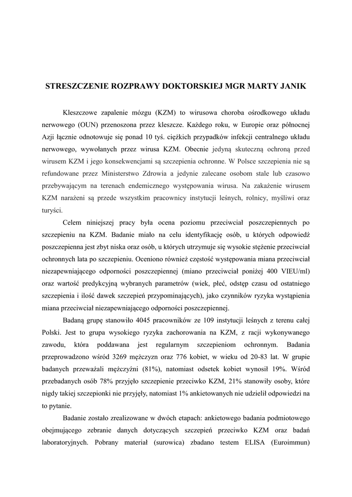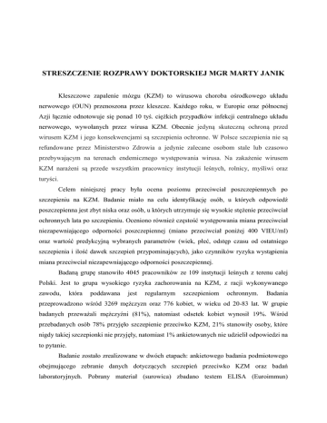 STRESZCZENIE ROZPRAWY DOKTORSKIEJ MGR MARTY JANIK Kleszczowe zapalenie mózgu (KZM) to wirusowa choroba ośrodkowego układu nerwowego (OUN) przenoszona przez kleszcze. Każdego roku, w Europie oraz północnej Azji łącznie odnotowuje się ponad 10 tyś. ciężkich przypadków infekcji centralnego układu nerwowego, wywołanych przez wirusa KZM. Obecnie jedyną skuteczną ochroną przed wirusem KZM i jego konsekwencjami są szczepienia ochronne. W Polsce szczepienia nie są refundowane przez Ministerstwo Zdrowia a jedynie zalecane osobom stale lub czasowo przebywającym na terenach endemicznego występowania wirusa. Na zakażenie wirusem KZM narażeni są przede wszystkim pracownicy instytucji leśnych, rolnicy, myśliwi oraz turyści. Celem niniejszej pracy była ocena poziomu przeciwciał poszczepiennych po szczepieniu na KZM. Badanie miało na celu identyfikację osób, u których odpowiedź poszczepienna jest zbyt niska oraz osób, u których utrzymuje się wysokie stężenie przeciwciał ochronnych lata po szczepieniu. Oceniono również częstość występowania miana przeciwciał niezapewniającego odporności poszczepiennej (miano przeciwciał poniżej 400 VIEU/ml) oraz wartość predykcyjną wybranych parametrów (wiek, płeć, odstęp czasu od ostatniego szczepienia i ilość dawek szczepień przypominających), jako czynników ryzyka wystąpienia miana przeciwciał niezapewniającego odporności poszczepiennej. Badaną grupę stanowiło 4045 pracowników ze 109 instytucji leśnych z terenu całej Polski. Jest to grupa wysokiego ryzyka zachorowania na KZM, z racji wykonywanego zawodu, która poddawana jest regularnym szczepieniom ochronnym. Badania przeprowadzono wśród 3269 mężczyzn oraz 776 kobiet, w wieku od 20-83 lat. W grupie badanych przeważali mężczyźni (81%), natomiast odsetek kobiet wynosił 19%. Wśród przebadanych osób 78% przyjęło szczepienie przeciwko KZM, 21% stanowiły osoby, które nigdy takiej szczepionki nie przyjęły, natomiast 1% ankietowanych nie udzielił odpowiedzi na to pytanie. Badanie zostało zrealizowane w dwóch etapach: ankietowego badania podmiotowego obejmującego zebranie danych dotyczących szczepień przeciwko KZM oraz badań laboratoryjnych. Pobrany materiał (surowica) zbadano testem ELISA (Euroimmun) oznaczając poziom przeciwciał w klasie IgG przeciwko wirusowi KZM, wyrażając wynik w jednostkach „Vienna” (VIEU/ml). W pracy zastosowano interpretację wyników dedykowaną dla oceny poziomu przeciwciał poszczepiennych przeciwko KZM, która stosowana jest w laboratoriach na terenie Austrii, do oceny statusu immunologicznego osób szczepionych na KZM. Na podstawie danych dotyczących statusu szczepienia przeciwko KZM, wyróżniono cztery grupy badane. Grupa osób z niepełnym szczepieniem podstawowym oraz grupa osób, która nie pamiętała dokładnie dat przyjęcia szczepionek zostały pominięte w analizach statystycznych, ponieważ dane dotyczące przyjęcia dawek szczepionek są niekompletne. Ostatecznie szczegółowe analizy statystyczne zostały przeprowadzone w grupie 2315 osób, które przeszły pełne szczepienie podstawowe. Przeprowadzone badania poziomu przeciwciał poszczepiennych pozwoliły zidentyfikować osoby, które nie nabyły odpowiedniej odporności (miano przeciwciał ochronnych poniżej 400 VIEU/ml). W ciągu roku od podania ostatniej dawki szczepionki u 33% badanych, którzy przyjęli tylko szczepienie podstawowe (3 dawki) stwierdzono zbyt niskie miano przeciwciał ochronnych. Podobnie zaobserwowano wśród osób, które przyjęły co najmniej 4 dawki szczepionki (szczepienie podstawowe + przypominające). Zbyt niskie miano przeciwciał ochronnych stwierdzono u 17% (<60 r.ż.) i 20% (>60 r.ż.) badanych. Przeprowadzone badania pozwoliły również zidentyfikować osoby, u których szczepienie ochronne wyidukowało długotrwałą odporność (miano przeciwciał ochronnych powyżej 1000 VIEU/ml). Świadczy to o bardzo dobrej skuteczności szczepionki u tych pacjentów. U 18% badanych osób, które przyjęły tylko szczepienie podstawowe, po 3 latach od ostatniego kontaktu ze szczepionką stwierdza się nadal wysokie stężenie przeciwciał ochronnych (miano przeciwciał pomiędzy 601-1000 VIEU/ml). Natomiast wśród osób, które przyjęły co najmniej 4 dawki szczepionki, miano przeciwciał ochronnych powyżej 1000 VIEU/ml obserwowano u 39% (<60 r.ż.) i 28% (>60 r.ż.) badanych, odpowiednio 5 i 3 lata po ostatnim kontakcie ze szczepionką. Udowodniono iż płeć, wiek, czas upływający od ostatniego podania szczepionki oraz liczba przyjętych dawek przypominających to czynniki związane z występowaniem niższego miana przeciwciał poszczepiennych, a jednocześnie są to zmienne mające wpływ na częstość występowania miana przeciwciał niezapewniającego odpowiedniej odporności immunologicznej. Najsilniejszymi predyktorami wystąpienia miana przeciwciał poniżej 400 VIEU/ml wśród osób, które przyjęły tylko szczepienie podstawowe okazały się płeć męska i wiek powyżej 60 lat. W tej grupie badanej upływ czasu od ostatniej szczepionki nie zwiększał znacząco szansy wystąpienia niewystarczającej odporności poszczepiennej, pomimo, że częstość występowania miana poniżej 400 VIEU/ml była bardzo wysoka już w pierwszym roku od przyjęcia ostatniej dawki szczepionki podstawowej. Natomiast wśród osób, które przyjęły co najmniej 4 dawki szczepionki najsilniejszymi predyktorami wystąpienia miana przeciwciał poniżej 400 VIEU/ml był również wiek powyżej 60 lat oraz zwiększanie się odstępu czasowego od trzeciej dawki podstawowej lub którejkolwiek z przypominających, istotnie zwiększa szansę wystąpienia miana przeciwciał poniżej 400 VIEU/ml. Wyniki mojego badania potwierdzają, iż każda osoba indywidualnie nabywa odporność humoralną. Pokazują również, że istnieją czynniki, które mają znaczący wpływ na wystąpienie niewystarczającej odporności po
