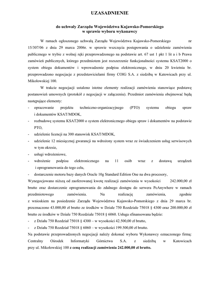 UZASADNIENIE do uchwały Zarządu Województwa Kujawsko-Pomorskiego w sprawie wyboru wykonawcy W ramach ogłoszonego uchwałą Zarządu Województwa Kujawsko-Pomorskiego nr 15/307/06 z dnia 29 marca 2006r. w sprawie wszczęcia postępowania o udzielenie zamówienia publicznego w trybie z wolnej ręki przeprowadzonego na podstawie art. 67 ust 1 pkt 1 lit a i b Prawa zamówień publicznych, którego przedmiotem jest rozszerzenie funkcjonalności systemu KSAT2000 o system obiegu dokumentów i wprowadzenie podpisu elektronicznego, w dniu 20 kwietnia br. przeprowadzono negocjacje z przedstawicielami firmy COIG S.A. z siedzibą w Katowicach przy ul. Mikołowskiej 100. W trakcie negocjacji ustalono istotne elementy realizacji zamówienia stanowiące podstawę postanowień umownych (protokół z negocjacji w załączeniu). Przedmiot zamówienia obejmować będą następujące elementy: - opracowanie projektu techniczno-organizacyjnego (PTO) systemu obiegu spraw i dokumentów KSAT/MDOK, - rozbudowę systemu KSAT2000 o system elektronicznego obiegu spraw i dokumentów na podstawie PTO, - udzielenie licencji na 300 stanowisk KSAT/MDOK, - udzielenie 12 miesięcznej gwarancji na wdrożony system wraz ze świadczeniem usług serwisowych w tym okresie, - usługi wdrożeniowe, - wdrożenie podpisu elektronicznego na 11 osób wraz z dostawą urządzeń i oprogramowania do tego celu, - dostarczenie motoru bazy danych Oracle 10g Standard Edition One na dwa procesory, Wynegocjowano niższą od zaoferowanej kwotę realizacji zamówienia w wysokości 242.000,00 zł brutto oraz dostarczenie oprogramowania do zdalnego dostępu do serwera PcAnywhere w ramach przedmiotowego zamówienia. Na realizację zamówienia, zgodnie z wnioskiem na posiedzenie Zarządu Województwa Kujawsko-Pomorskiego z dnia 29 marca br. przeznaczono 43.000,00 zł brutto ze środków w Dziale 750 Rozdziale 75018 § 4300 oraz 200.000,00 zł brutto ze środków w Dziale 750 Rozdziale 75018 § 6060. Usługa sfinansowana będzie: - z Działu 750 Rozdział 75018 § 4300 – w wysokości 42.500,00 zł brutto, - z Działu 750 Rozdział 75018 § 6060 – w wysokości 199.500,00 zł brutto. Na podstawie przeprowadzonych negocjacji należy dokonać wyboru Wykonawcy oznaczonego firmą: Centralny Ośrodek Informatyki Górnictwa S.A. z siedzibą przy ul. Mikołowskiej 100 z ceną realizacji zamówienia 242.000,00 zł brutto. w Katowicach