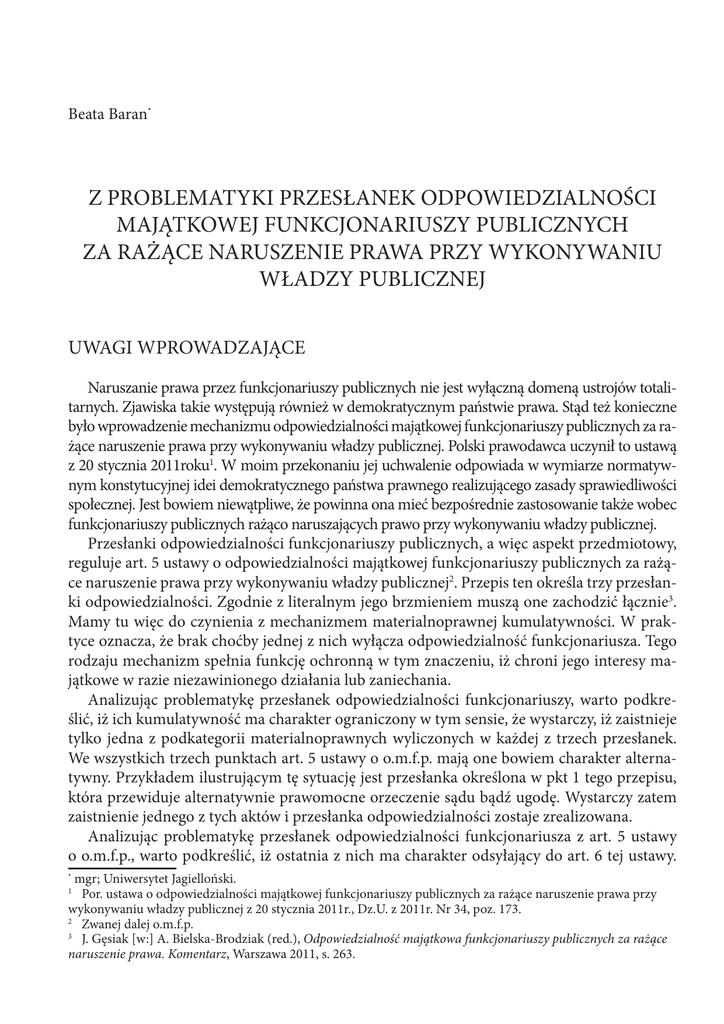Beata Baran* Z PROBLEMATYKI PRZESŁANEK ODPOWIEDZIALNOŚCI MAJĄTKOWEJ FUNKCJONARIUSZY PUBLICZNYCH ZA RAŻĄCE NARUSZENIE PRAWA PRZY WYKONYWANIU WŁADZY PUBLICZNEJ UWAGI WPROWADZAJĄCE Naruszanie prawa przez funkcjonariuszy publicznych nie jest wyłączną domeną ustrojów totalitarnych. Zjawiska takie występują również w demokratycznym państwie prawa. Stąd też konieczne było wprowadzenie mechanizmu odpowiedzialności majątkowej funkcjonariuszy publicznych za rażące naruszenie prawa przy wykonywaniu władzy publicznej. Polski prawodawca uczynił to ustawą z 20 stycznia 2011roku1. W moim przekonaniu jej uchwalenie odpowiada w wymiarze normatywnym konstytucyjnej idei demokratycznego państwa prawnego realizującego zasady sprawiedliwości społecznej. Jest bowiem niewątpliwe, że powinna ona mieć bezpośrednie zastosowanie także wobec funkcjonariuszy publicznych rażąco naruszających prawo przy wykonywaniu władzy publicznej. Przesłanki odpowiedzialności funkcjonariuszy publicznych, a więc aspekt przedmiotowy, reguluje art. 5 ustawy o odpowiedzialności majątkowej funkcjonariuszy publicznych za rażące naruszenie prawa przy wykonywaniu władzy publicznej2. Przepis ten określa trzy przesłanki odpowiedzialności. Zgodnie z literalnym jego brzmieniem muszą one zachodzić łącznie3. Mamy tu więc do czynienia z mechanizmem materialnoprawnej kumulatywności. W praktyce oznacza, że brak choćby jednej z nich wyłącza odpowiedzialność funkcjonariusza. Tego rodzaju mechanizm spełnia funkcję ochronną w tym znaczeniu, iż chroni jego interesy majątkowe w razie niezawinionego działania lub zaniechania. Analizując problematykę przesłanek odpowiedzialności funkcjonariuszy, warto podkreślić, iż ich kumulatywność ma charakter ograniczony w tym sensie, że wystarczy, iż zaistnieje tylko jedna z podkategorii materialnoprawnych wyliczonych w każdej z trzech przesłanek. We wszystkich trzech punktach art. 5 ustawy o o.m.f.p. mają one bowiem charakter alternatywny. Przykładem ilustrującym tę sytuację jest przesłanka określona w pkt 1 tego przepisu, która przewiduje alternatywnie prawomocne orzeczenie sądu bądź ugodę. Wystarczy zatem zaistnienie jednego z tych aktów i przesłanka odpowiedzialności zostaje zrealizowana. Analizując problematykę przesłanek odpowiedzialności funkcjonariusza z art. 5 ustawy o o.m.f.p., warto podkreślić, iż ostatnia z nich ma charakter odsyłający do art. 6 tej ustawy. mgr; Uniwersytet Jagielloński. Por. ustawa o odpowiedzialności majątkowej funkcjonariuszy publicznych za rażące naruszenie prawa przy wykonywaniu władzy publicznej z 20 stycznia 2011r., Dz.U. z 2011r. Nr 34, poz. 173. 2 Zwanej dalej o.m.f.p. 3 J. Gęsiak [w:] A. Bielska-Brodziak (red.), Odpowiedzialność majątkowa funkcjonariuszy publicznych za rażące naruszenie prawa. Komentarz, Warszawa 2011, s. 263. * 1 ROCZNIKI ADMINISTRACJI I PRAWA. ROK XIII W tej pracy zostanie więc ona przeanalizowana zgodnie z dyrektywą kompleksowości badań dogmatycznych w sposób całościowy – wspólnie art. 5 ust. 3 i art. 6 ustawy o o.m.f.p. ORZECZENIA I UGODY STANOWIĄCE PODSTAWĘ WYPŁATY ODSZKODOWAŃ ZA SZKODĘ WYRZĄDZONĄ PRZY WYKONYWANIU WŁADZY PUBLICZNEJ Artykuł 5 ust. 1 ustawy o o.m.f.p. statuuje przesłankę, zgodnie z którą funkcjonariusz publiczny ponosi odpowiedzialność majątkową w sytuacji, gdy na mocy prawomocnego orzeczenia sądu lub na mocy ugody zostało wypłacone przez podmiot odpowiedzialny odszkodowanie za szkodę wyrządzoną przy wykonywaniu władzy publicznej z naruszeniem prawa. Poddając analizie ten przepis, należy wskazać na centralne jego elementy: t prawomocne orzeczenie sądu; t ugodę; t wypłatę odszkodowania przez podmiot odpowiedzialny; t szkodę wyrządzoną przy wykonywaniu władzy publicznej z rażącym naruszeniem prawa. Analizę problemu rozpocznę od zagadnienia prawomocnego orzeczenia sądu. Pierwszym problemem jest w tej materii kwestia, o jaki sąd tutaj chodzi. Za oczywistość uważam, iż jest to sąd orzekający w sprawie cywilnej. Jednakże ze względu na fakt, iż art. 5 pkt 1 ustawy o o.m.f.p. nie różnicuje organów sądowych, należy w oparciu o argumentację lege non distinquente dopuścić, także orzeczenia odszkodowawcze sądów karnych w ramach powództw adhezyjnych4. Na tle art. 5 pkt 1 ustawy o o.m.f.p. powstaje pytanie, czy w ramach tego przepisu mieszczą się orzeczenia sądów polubownych. Ze swej strony reprezentuję stanowisko, iż na tak postawiony problem należy udzielić przeczącej odpowiedzi. Wynika ona z faktu, że sąd polubowny nie ma statusu organu publicznego wymiaru sprawiedliwości, a w swej istocie spełnia funkcje arbitrażowo-rozjemcze. Ponadto w praktyce trudno sobie wyobrazić zawarcie zapisu na sąd polubowny5 w sprawach związanych ze szkodami wyrządzonymi przy wykonywaniu władzy publicznej. Tego rodzaju klauzula naruszałaby wielokroć fundamenty demokratycznego państwa prawnego. W odniesieniu do problematyki orzeczeń sądowych na gruncie art. 5 pkt. 1 ustawy o o.m.f.p. uprawnione jest stwierdzenie, że zakres tego przepisu obejmuje wszystkie orzeczenia zasądzające odszkodowanie, nie tylko wyroki, ale również nakazy zapłaty i postanowienia. Te ostatnie ze względu na fakt, iż mają charakter merytoryczny tylko w postępowaniu nieprocesowym, w praktyce nie będą się w omawianej kategorii spraw pojawiać. Z natury rzeczy odszkodowania za nadużycie władzy publicznej będą orzekane w wyrokach. Jako wyjątek mogą pojawić się też nakazy zapłaty. Dlatego też w dalszej części pracy skupię swą uwagę na wyrokach. Art. 5 ust. 1 ustawy o o.m.f.p. nie różnicuje ich kategorii, co oznacza, że odszkodowanie może być zasądzone nie tylko w wyroku końcowym, ale także łącznym, częściowym oraz zaocznym. W moim przekonaniu nie może być podstawą odpowiedzialności majątkowej funkcjonariusza wyrok wstępny6, ponieważ nie zostaje w nim okre