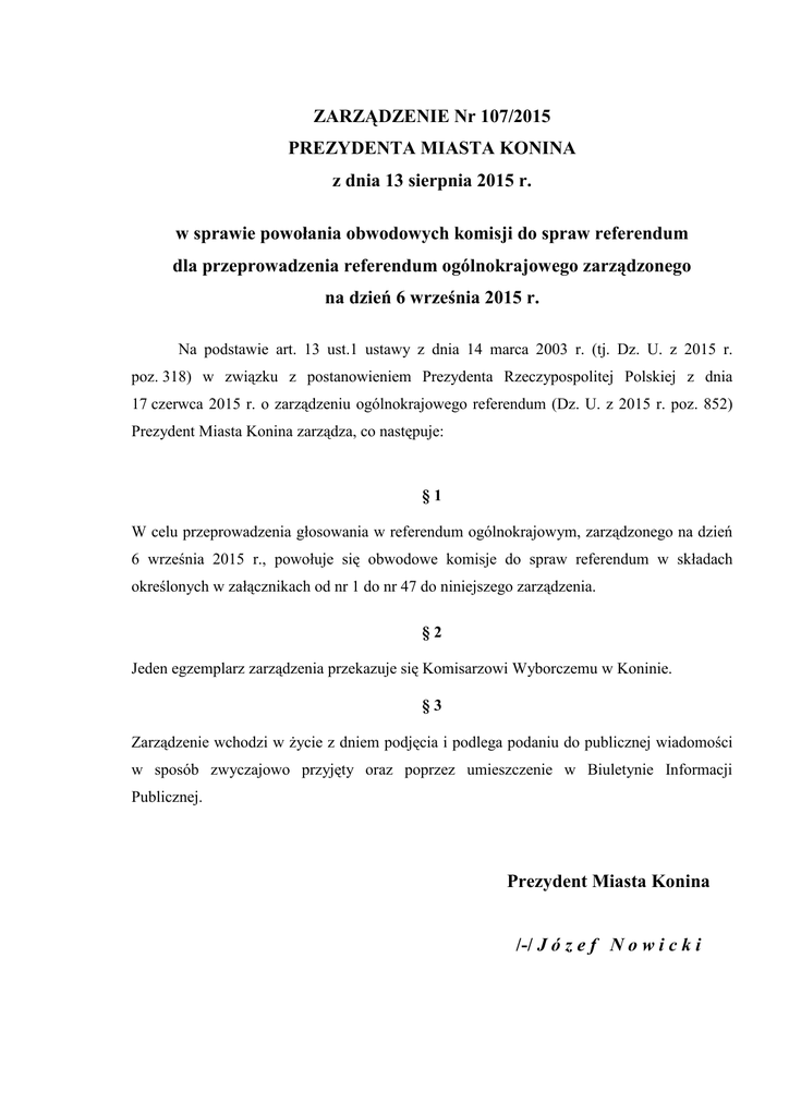 ZARZĄDZENIE Nr 107/2015 PREZYDENTA MIASTA KONINA z dnia 13 sierpnia 2015 r. w sprawie powołania obwodowych komisji do spraw referendum dla przeprowadzenia referendum ogólnokrajowego zarządzonego na dzień 6 września 2015 r. Na podstawie art. 13 ust.1 ustawy z dnia 14 marca 2003 r. (tj. Dz. U. z 2015 r. poz. 318) w związku z postanowieniem Prezydenta Rzeczypospolitej Polskiej z dnia 17 czerwca 2015 r. o zarządzeniu ogólnokrajowego referendum (Dz. U. z 2015 r. poz. 852) Prezydent Miasta Konina zarządza, co następuje: §1 W celu przeprowadzenia głosowania w referendum ogólnokrajowym, zarządzonego na dzień 6 września 2015 r., powołuje się obwodowe komisje do spraw referendum w składach określonych w załącznikach od nr 1 do nr 47 do niniejszego zarządzenia. §2 Jeden egzemplarz zarządzenia przekazuje się Komisarzowi Wyborczemu w Koninie. §3 Zarządzenie wchodzi w życie z dniem podjęcia i podlega podaniu do publicznej wiadomości w sposób zwyczajowo przyjęty oraz poprzez umieszczenie w Biuletynie Informacji Publicznej. Prezydent Miasta Konina /-/ J ó z e f N o w i c k i