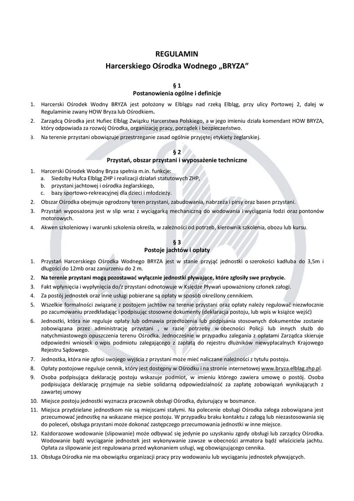 REGULAMIN Harcerskiego Ośrodka Wodnego „BRYZA” §1 Postanowienia ogólne i definicje 1. Harcerski Ośrodek Wodny BRYZA jest położony w Elblągu nad rzeką Elbląg, przy ulicy Portowej 2, dalej w Regulaminie zwany HOW Bryza lub Ośrodkiem. 2. Zarządcą Ośrodka jest Hufiec Elbląg Związku Harcerstwa Polskiego, a w jego imieniu działa komendant HOW BRYZA, który odpowiada za rozwój Ośrodka, organizację pracy, porządek i bezpieczeństwo. 3. Na terenie przystani obowiązuje przestrzeganie zasad ogólnie przyjętej etykiety żeglarskiej. §2 Przystań, obszar przystani i wyposażenie techniczne 1. Harcerski Ośrodek Wodny Bryza spełnia m.in. funkcje: a. Siedziby Hufca Elbląg ZHP i realizacji działań statutowych ZHP, b. przystani jachtowej i ośrodka żeglarskiego, c. bazy sportowo-rekreacyjnej dla dzieci i młodzieży. 2. Obszar Ośrodka obejmuje ogrodzony teren przystani, zabudowania, nabrzeża i pirsy oraz basen przystani. 3. Przystań wyposażona jest w slip wraz z wyciągarką mechaniczną do wodowania i wyciągania łodzi oraz pontonów motorowych. 4. Akwen szkoleniowy i warunki szkolenia określa, w zależności od potrzeb, kierownik szkolenia, obozu lub kursu. §3 Postoje jachtów i opłaty 1. Przystań Harcerskiego Ośrodka Wodnego BRYZA jest w stanie przyjąć jednostki o szerokości kadłuba do 3,5m i długości do 12mb oraz zanurzeniu do 2 m. 2. Na terenie przystani mogą pozostawać wyłącznie jednostki pływające, które zgłosiły swe przybycie. 3. Fakt wpłynięcia i wypłynięcia do/z przystani odnotowuje w Księdze Pływań upoważniony członek załogi. 4. 5. Za postój jednostek oraz inne usługi pobierane są opłaty w sposób określony cennikiem. Wszelkie formalności związane z postojem jachtów na terenie przystani oraz opłaty należy regulować niezwłocznie po zacumowaniu przedkładając i podpisując stosowne dokumenty (deklaracja postoju, lub wpis w książce wejść) 6. Jednostki, która nie reguluje opłaty lub odmawia przedłożenia lub podpisania stosownych dokumentów zostanie zobowiązana przez administrację przystani , w razie potrzeby w obecności Policji lub innych służb do natychmiastowego opuszczenia terenu Ośrodka. Jednocześnie w przypadku zalegania z opłatami Zarządca skieruje odpowiedni wniosek o wpis podmiotu zalegającego z zapłatą do rejestru dłużników niewypłacalnych Krajowego Rejestru Sądowego. 7. Jednostka, która nie zgłosi swojego wyjścia z przystani może mieć naliczane należności z tytułu postoju. 8. 9. Opłaty postojowe reguluje cennik, który jest dostępny w Ośrodku i na stronie internetowej www.bryza.elblag.zhp.pl. Osoba podpisująca deklarację postoju wskazuje podmiot, w imieniu którego zawiera umowę o postój. Osoba podpisująca deklarację przyjmuje na siebie solidarną odpowiedzialność za zapłatę zobowiązań wynikających z zawartej umowy 10. Miejsce postoju jednostki wyznacza pracownik obsługi Ośrodka, dyżurujący w bosmance. 11. Miejsca przydzielane jednostkom nie są miejscami stałymi. Na polecenie obsługi Ośrodka załoga zobowiązana jest przecumować jednostkę na wskazane miejsce postoju. W przypadku braku kontaktu z załogą lub niezastosowania się do poleceń, obsługa przystani może dokonać zastępczego przecumowania jednostki w inne miejsce. 12. Każdorazowe wodowanie (slipowanie) może odbywać się jedynie po uzyskaniu zgody obsługi lub zarządcy Ośrodka. Wodowanie bądź wyciąganie jednostek jest wykonywanie zawsze w obecności armatora bądź właściciela jachtu. Opłata za slipowanie jest regulowana przed wykonaniem usługi, wg obowiązującego cennika. 13. Obsługa Ośrodka nie ma obowiązku organizacji pracy przy wodowaniu lub wyciąganiu jednostek pływających. 14. Armator i załoga jednostki jest odpowiedzialna za uprzątnięcie miejsca postoju jednostki (np. po postoju zimowym, dokonywaniu konserwacji lub remontów lub w innych sytuacjach) 15. Zabrania się korzystania z punktów czerpalnych wody znajdujących się na nabrzeżu przystani do celów mycia jachtów oraz mycia naczyń. 16. Mycie naczyń może odbywać się w umywalni (Budynek A). §4 Przebywanie na terenie Ośrodka 1. Teren Ośrodka jest terenem zamkniętym. 2. W okresie roku kalendarzowego wyodrębnione są: a. okres "sezonu letniego" od 1 maja do 31 października, b. okres "sezonu zimowego" od 1 listopada do 30 kwietnia. 3. W okresie doby wyodrębnione są pora nocna i pora dzienna. a. W okresie "sezonu żeglarskiego" pora dzienna trwa od godz. 6:00 do godz. 22:00. b. W okresie "sezonu zimowego" pora dzienna trwa od godz. 8:00 do godz. 20:00. c. Okres poza porą dzienną jest porą nocną. 4. Nieograniczone prawo przebywania w Ośrodku w porze dziennej i nocnej w okresie całego roku kalendarzowego mają: a. Komendant i obsługa HOW BRYZA, b. Komenda i współpracownicy Hufca Elbląg ZHP, c. Inni współpracownicy HOW BRYZA wykonujący czynności służbowe, d. Inne osoby, które uzyskały zgodę Komendanta HOW BRYZA 5. Nieograniczone prawo przebywania na Przystani w porze dziennej w okresie całego roku kalendarzowego poza wymienionymi w pkt. 4 mają: a. goście i klienci HOW BRYZA b. pracownicy i współpracownicy HOW BRYZA, c. pracownicy firm mających swoje siedziby na terenie przystani i ich klienci, d. uczestnicy imprez organizowanych przez HOW BRYZA. 6. Nieograniczone prawo przebywania w Ośrodku w porze dziennej i nocnej w okresie sezonu żeglarskiego mają armatorzy zawijający jachtami do przystani HOW BRYZA, oraz jachtów stacjonujących na terenie przystani. Ilość załogi przebywającej na jachcie, każdy armator obowiązkowo musi zgłosić do pracownika przystani. 7. Zgody na przebywanie na terenie przystani w porze nocnej udziela komendant HOW BRYZA. 8. W porze nocnej budynki i pomieszczenia przystani HOW BRYZA pozostają zamknięte. Ich otwarcie wymaga obecności upoważnionego przedstawiciela HOW BRYZA. 9. Wszystkie osoby przebywające na obszarze przystani są zobowi
