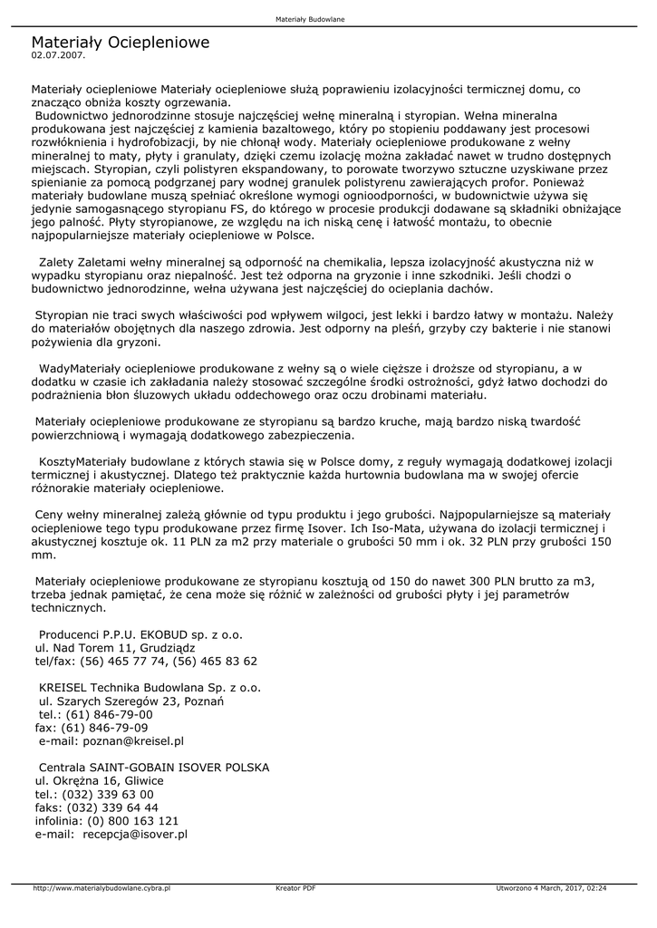 Materiały Budowlane Materiały Ociepleniowe 02.07.2007. Materiały ociepleniowe Materiały ociepleniowe służą poprawieniu izolacyjności termicznej domu, co znacząco obniża koszty ogrzewania. Budownictwo jednorodzinne stosuje najczęściej wełnę mineralną i styropian. Wełna mineralna produkowana jest najczęściej z kamienia bazaltowego, który po stopieniu poddawany jest procesowi rozwłóknienia i hydrofobizacji, by nie chłonął wody. Materiały ociepleniowe produkowane z wełny mineralnej to maty, płyty i granulaty, dzięki czemu izolację można zakładać nawet w trudno dostępnych miejscach. Styropian, czyli polistyren ekspandowany, to porowate tworzywo sztuczne uzyskiwane przez spienianie za pomocą podgrzanej pary wodnej granulek polistyrenu zawierających profor. Ponieważ materiały budowlane muszą spełniać określone wymogi ognioodporności, w budownictwie używa się jedynie samogasnącego styropianu FS, do którego w procesie produkcji dodawane są składniki obniżające jego palność. Płyty styropianowe, ze względu na ich niską cenę i łatwość montażu, to obecnie najpopularniejsze materiały ociepleniowe w Polsce. Zalety Zaletami wełny mineralnej są odporność na chemikalia, lepsza izolacyjność akustyczna niż w wypadku styropianu oraz niepalność. Jest też odporna na gryzonie i inne szkodniki. Jeśli chodzi o budownictwo jednorodzinne, wełna używana jest najczęściej do ocieplania dachów. Styropian nie traci swych właściwości pod wpływem wilgoci, jest lekki i bardzo łatwy w montażu. Należy do materiałów obojętnych dla naszego zdrowia. Jest odporny na pleśń, grzyby czy bakterie i nie stanowi pożywienia dla gryzoni. WadyMateriały ociepleniowe produkowane z wełny są o wiele cięższe i droższe od styropianu, a w dodatku w czasie ich zakładania należy stosować szczególne środki ostrożności, gdyż łatwo dochodzi do podrażnienia błon śluzowych układu oddechowego oraz oczu drobinami materiału. Materiały ociepleniowe produkowane ze styropianu są bardzo kruche, mają bardzo niską twardość powierzchniową i wymagają dodatkowego zabezpieczenia. KosztyMateriały budowlane z których stawia się w Polsce domy, z reguły wymagają dodatkowej izolacji termicznej i akustycznej. Dlatego też praktycznie każda hurtownia budowlana ma w swojej ofercie różnorakie materiały ociepleniowe. Ceny wełny mineralnej zależą głównie od typu produktu i jego grubości. Najpopularniejsze są materiały ociepleniowe tego typu produkowane przez firmę Isover. Ich Iso-Mata, używana do izolacji termicznej i akustycznej kosztuje ok. 11 PLN za m2 przy materiale o grubości 50 mm i ok. 32 PLN przy grubości 150 mm. Materiały ociepleniowe produkowane ze styropianu kosztują od 150 do nawet 300 PLN brutto za m3, trzeba jednak pamiętać, że cena może się różnić w zależności od grubości płyty i jej parametrów technicznych. Producenci P.P.U. EKOBUD sp. z o.o. ul. Nad Torem 11, Grudziądz tel/fax: (56) 465 77 74, (56) 465 83 62 KREISEL Technika Budowlana Sp. z o.o. ul. Szarych Szeregów 23, Poznań tel.: (61) 846-79-00 fax: (61) 846-79-09 e-mail: [email protected] Centrala SAINT-GOBAIN ISOVER POLSKA ul. Okrężna 16, Gliwice tel.: (032) 339 63 00 faks: (032) 339 64 44 infolinia: (0) 800 163 121 e-mail: [email protected] http://www.materialybudowlane.cybra.pl Kreator PDF Utworzono 4 March, 2017, 02:24