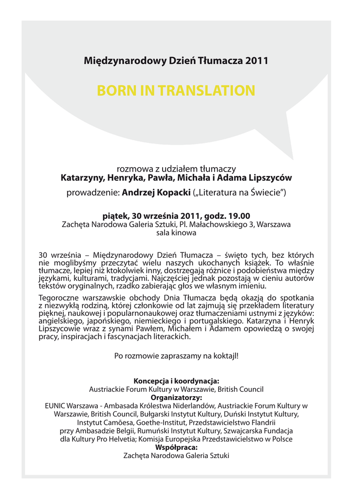 Międzynarodowy Dzień Tłumacza 2011 BORN IN TRANSLATION rozmowa z udziałem tłumaczy Katarzyny, Henryka, Pawła, Michała i Adama Lipszyców prowadzenie: Andrzej Kopacki („Literatura na Świecie”) piątek, 30 września 2011, godz. 19.00 Zachęta Narodowa Galeria Sztuki, Pl. Małachowskiego 3, Warszawa sala kinowa 30 września – Międzynarodowy Dzień Tłumacza – święto tych, bez których nie moglibyśmy przeczytać wielu naszych ukochanych książek. To właśnie tłumacze, lepiej niż ktokolwiek inny, dostrzegają różnice i podobieństwa między językami, kulturami, tradycjami. Najczęściej jednak pozostają w cieniu autorów tekstów oryginalnych, rzadko zabierając głos we własnym imieniu. Tegoroczne warszawskie obchody Dnia Tłumacza będą okazją do spotkania z niezwykłą rodziną, której członkowie od lat zajmują się przekładem literatury pięknej, naukowej i popularnonaukowej oraz tłumaczeniami ustnymi z języków: angielskiego, japońskiego, niemieckiego i portugalskiego. Katarzyna i Henryk Lipszycowie wraz z synami Pawłem, Michałem i Adamem opowiedzą o swojej pracy, inspiracjach i fascynacjach literackich. Po rozmowie zapraszamy na koktajl! Koncepcja i koordynacja: Austriackie Forum Kultury w Warszawie, British Council Organizatorzy: EUNIC Warszawa - Ambasada Królestwa Niderlandów, Austriackie Forum Kultury w Warszawie, British Council, Bułgarski Instytut Kultury, Duński Instytut Kultury, Instytut Camõesa, Goethe-Institut, Przedstawicielstwo Flandrii przy Ambasadzie Belgii, Rumuński Instytut Kultury, Szwajcarska Fundacja dla Kultury Pro Helvetia; Komisja Europejska Przedstawicielstwo w Polsce Współpraca: Zachęta Narodowa Galeria Sztuki