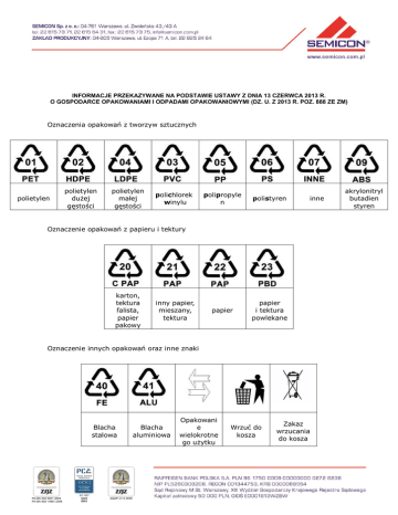 INFORMACJE PRZEKAZYWANE NA PODSTAWIE USTAWY Z DNIA 13 CZERWCA 2013 R. O GOSPODARCE OPAKOWANIAMI I ODPADAMI OPAKOWANIOWYMI (DZ. U. Z 2013 R. POZ. 888 ZE ZM) Oznaczenia opakowań z tworzyw sztucznych polietylen polietylen dużej gęstości polietylen małej gęstości polichlorek winylu polipropyle n polistyren papier papier i tektura powlekane inne Oznaczenie opakowań z papieru i tektury karton, tektura falista, papier pakowy inny papier, mieszany, tektura Oznaczenie innych opakowań oraz inne znaki Blacha stalowa Blacha aluminiowa Opakowani e wielokrotne go użytku Wrzuć do kosza Zakaz wrzucania do kosza akrylonitryl butadien styren Właściwe postępowanie z odpadami opakowaniowymi Odpady opakowaniowe należy zbierać w sposób selektywny z podziałem na poszczególne ich rodzaje. Opakowania powinny być puste i jeżeli jest to możliwe, w celu zmniejszenia ich objętości zgniecione. Oddawanie odpadów opakowaniowych możliwe jest: w zorganizowanych na terenie gminy punktach selektywnej zbiórki (ogólnodostępne pojemniki) lub w punktach PSZOK. Informacje dot. lokalizacji punktów PSZOK oraz godzin ich otwarcia urząd gminy obowiązany jest umieścić na swojej stronie internetowej.